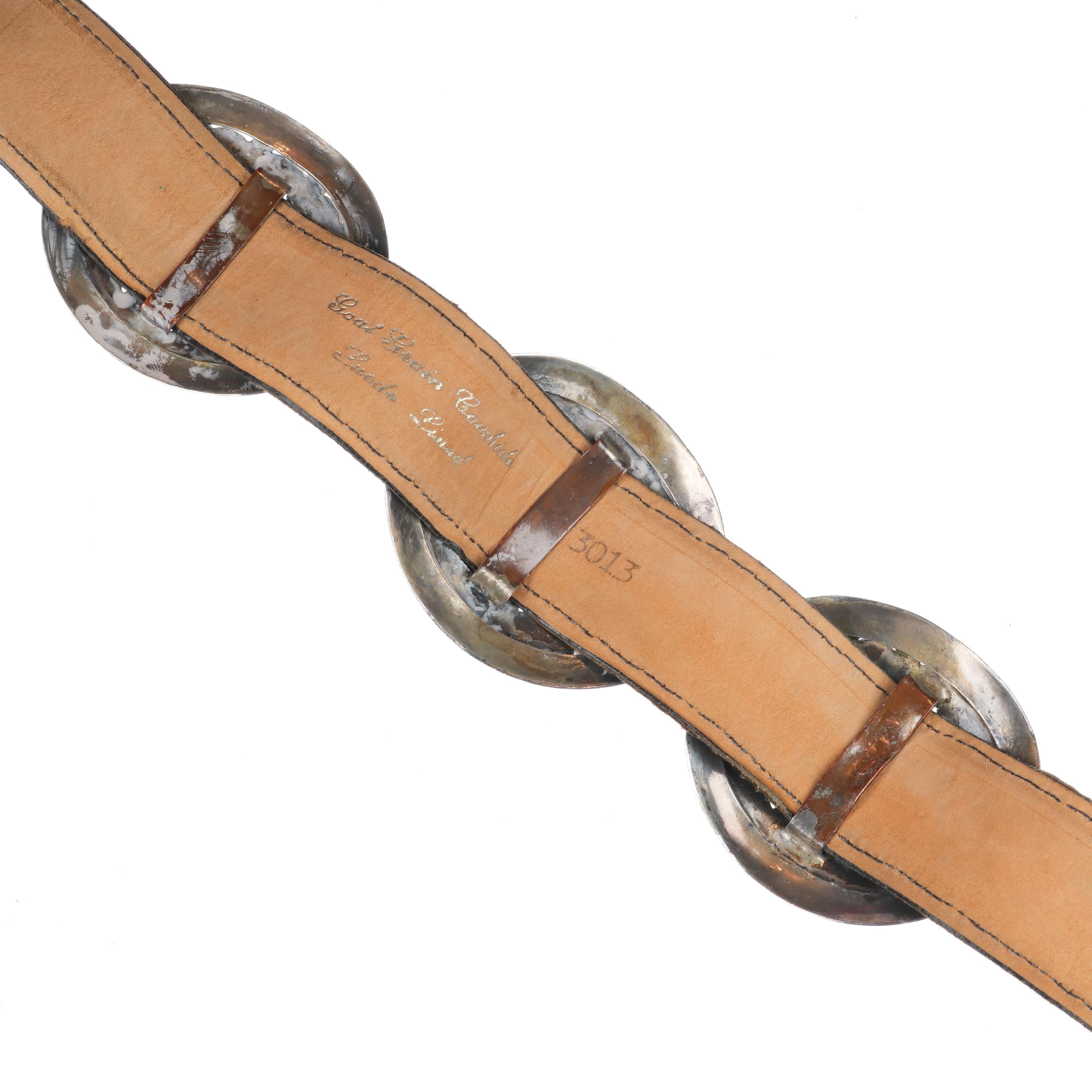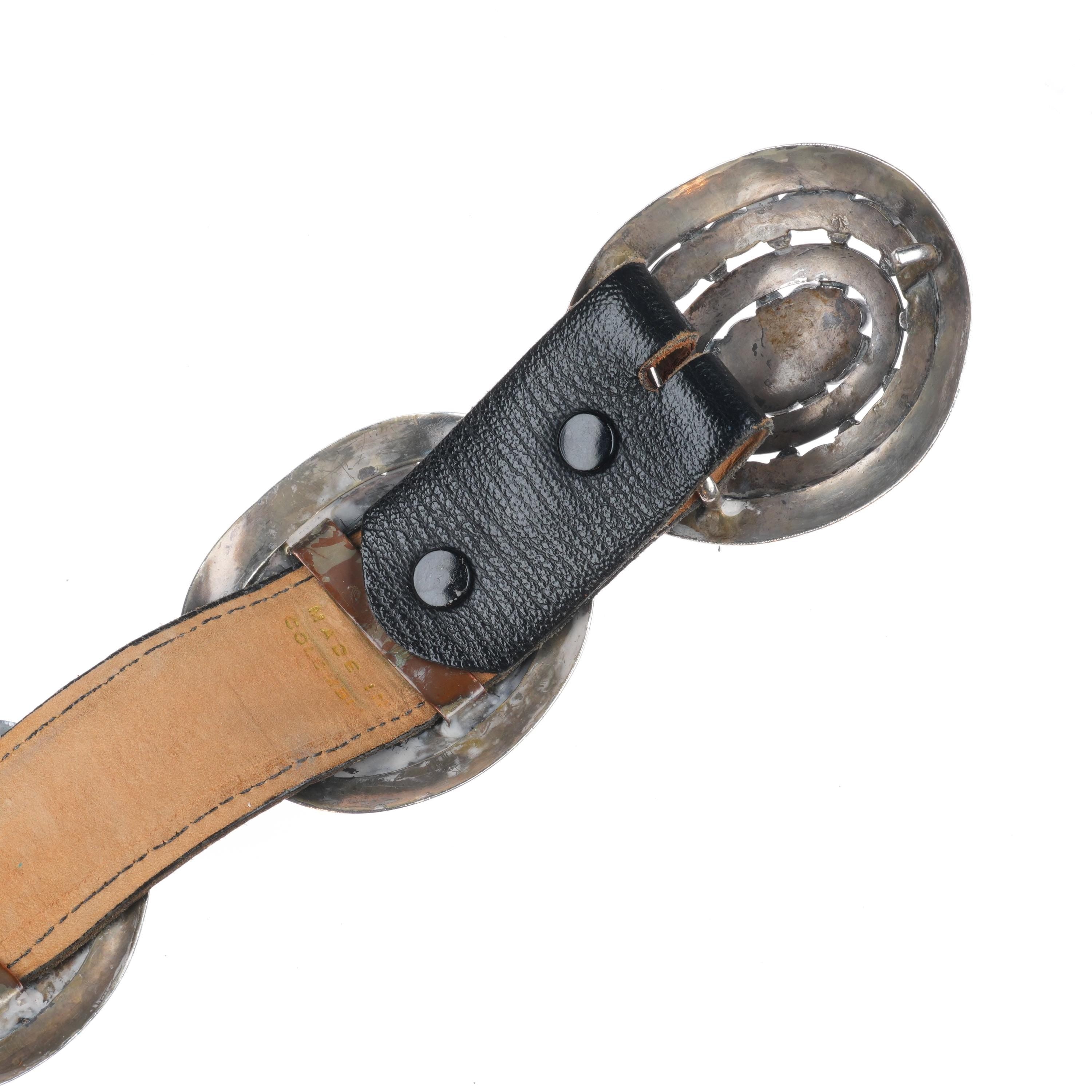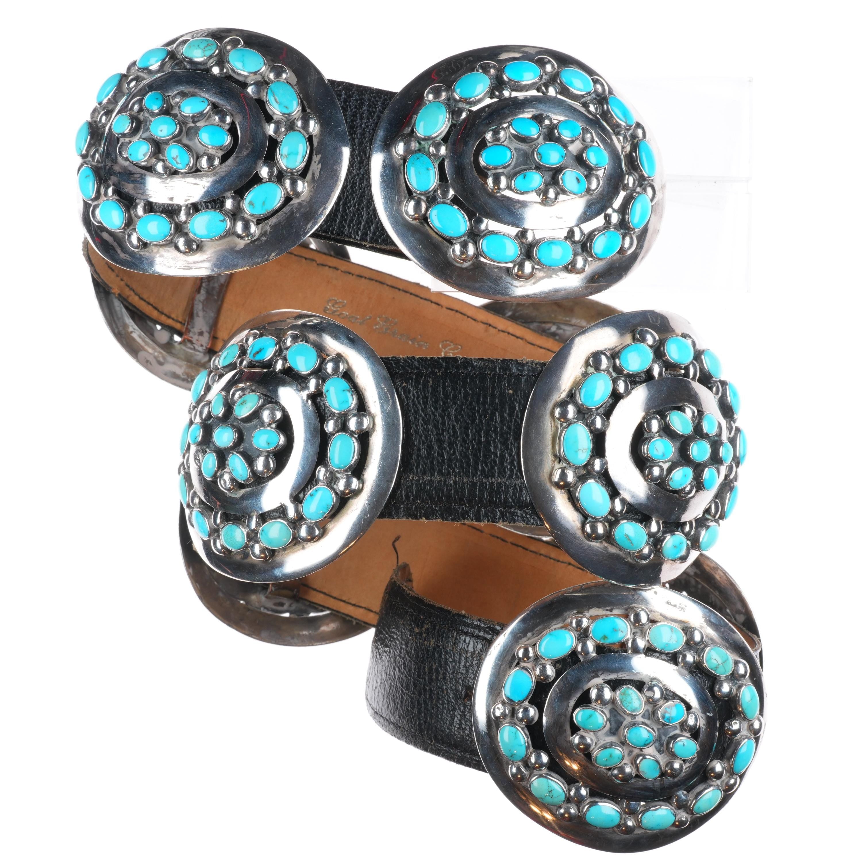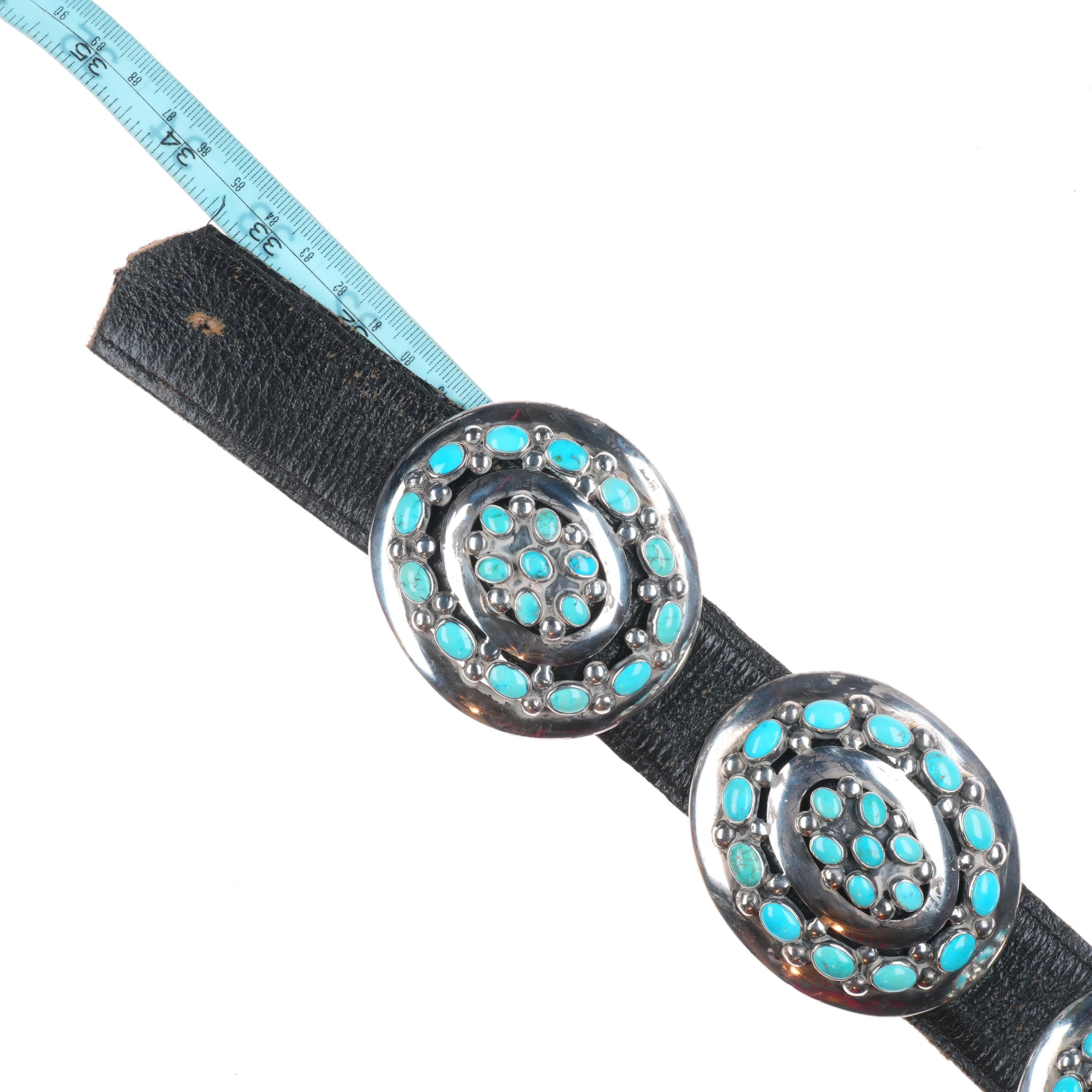 33" Vintage Navajo Modernist sterling silver turquoise cluster concho belt. Fits up to a 33" waist, but can be hooked shorter or put on longer leather. Weight and measurements in pictures. No damage or issues, tested and guaranteed solid sterling silver. 1 buckle and 8 conchos, 9 total. Mid 20th century, very nice high quality turquoise. Unmarked, will follow up with weight.