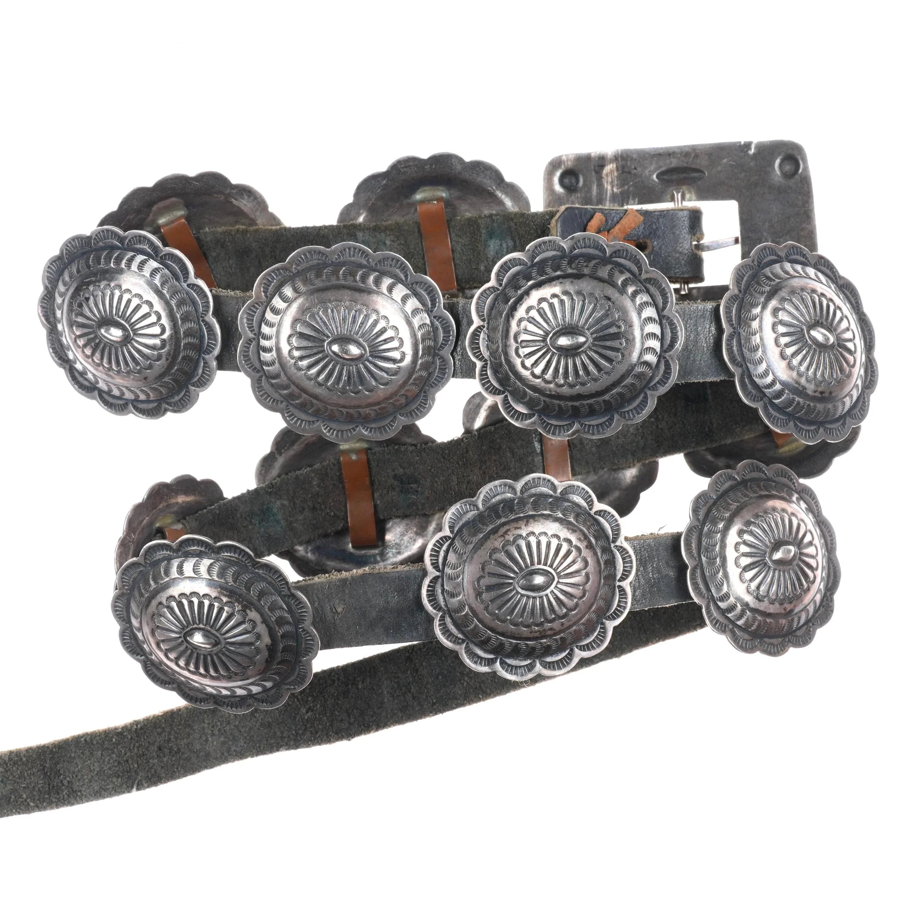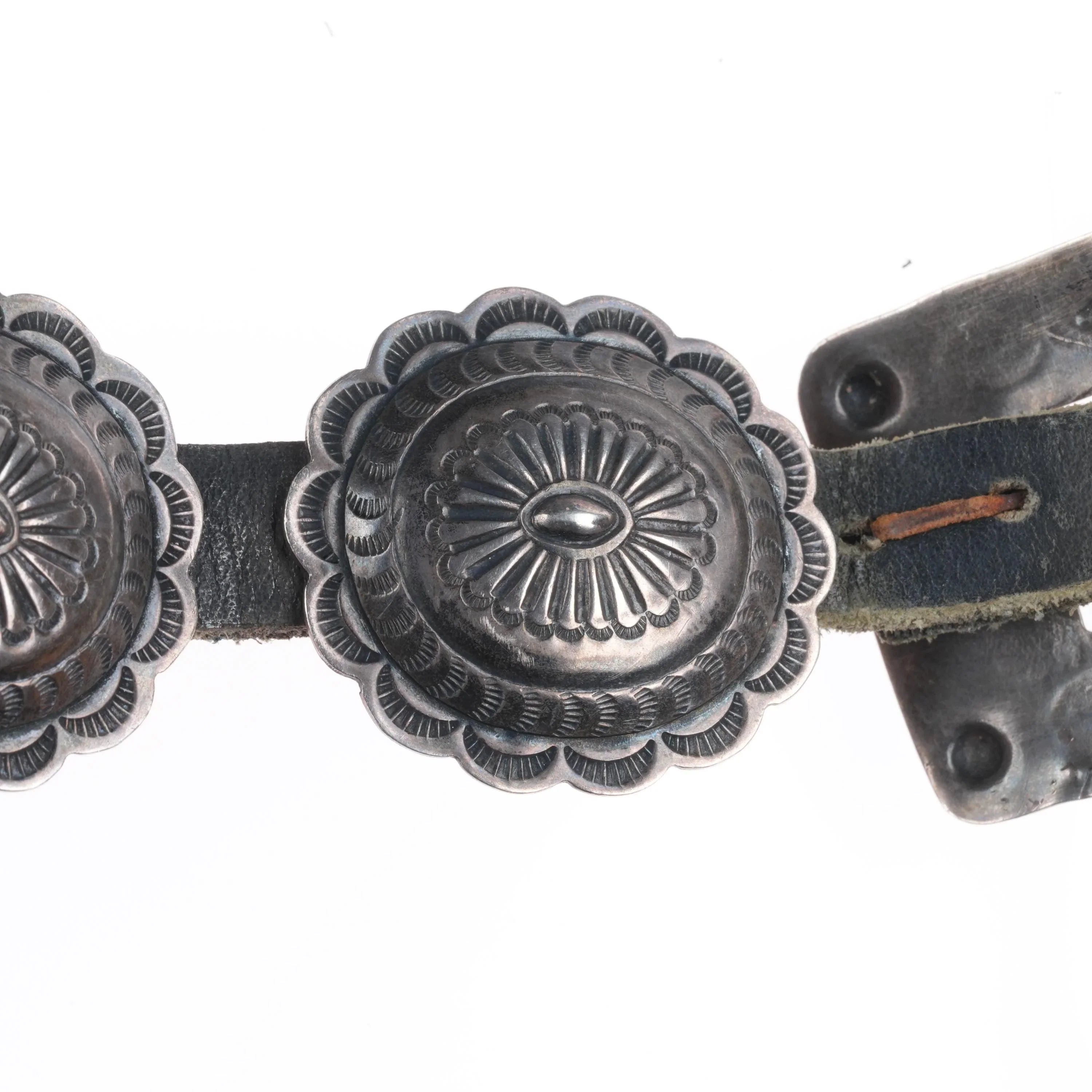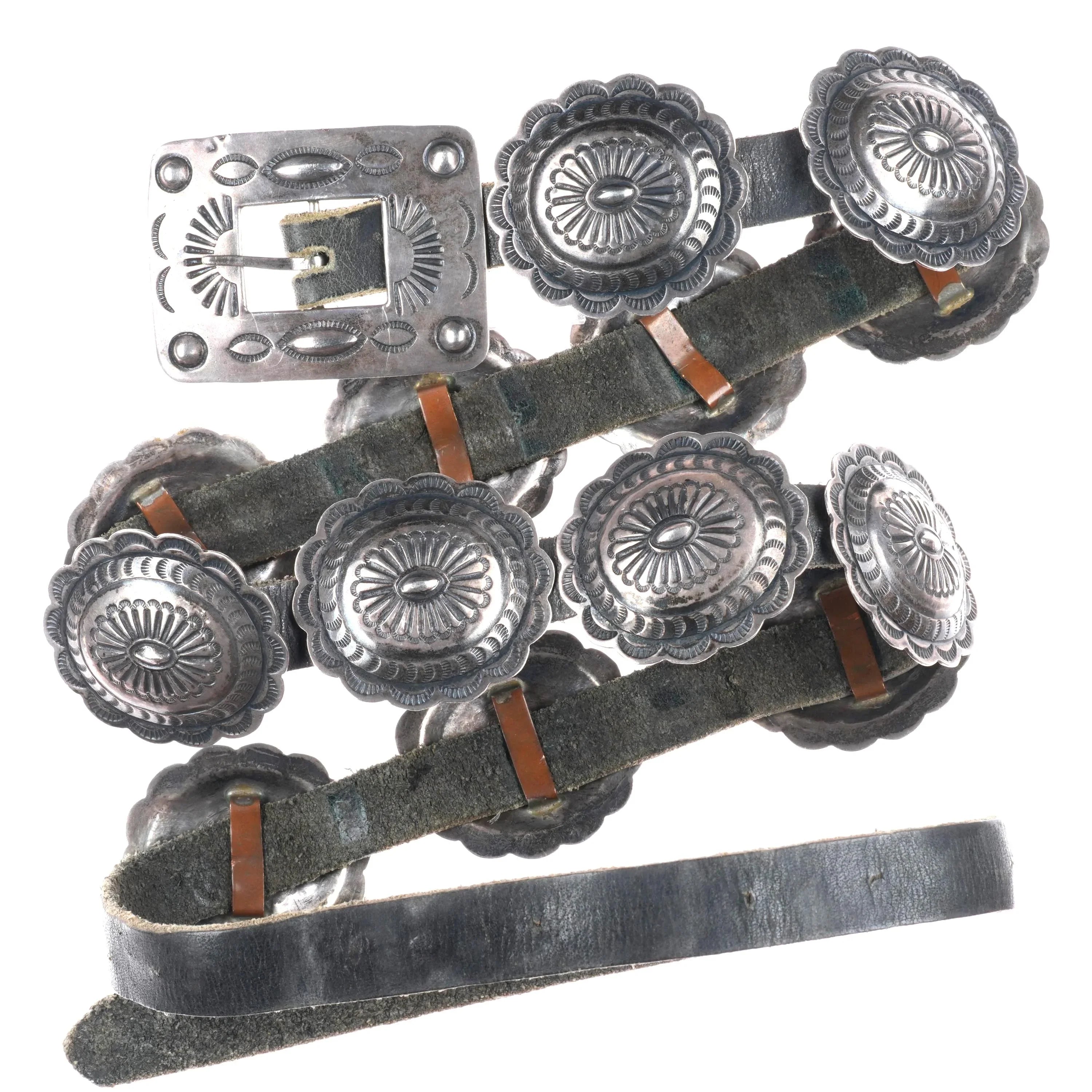 39" 40‘s-50‘s Vintage Navajo hand stamped sterling silver concho belt. Tested and guaranteed solid sterling silver with weight and measurements in pictures. Fully functional with no issues. All items will likely have some expected wear, the older they are the more wear they should have. Very clean condition 39" maximum wearable length, you would need to add a hole. I can add holes before shipping upon request. Circa mid 20th century, unmarked. 13 conchos and one buckle.