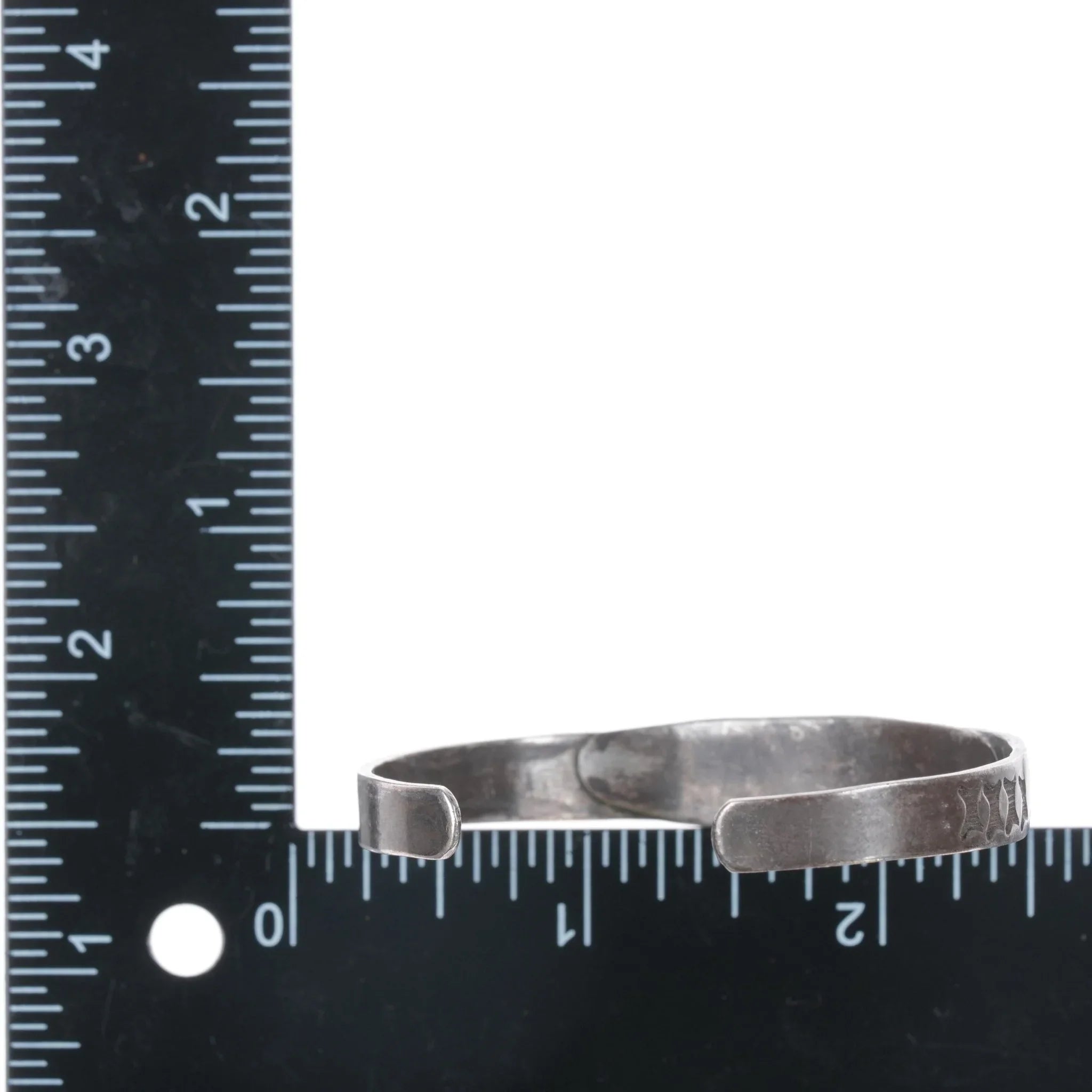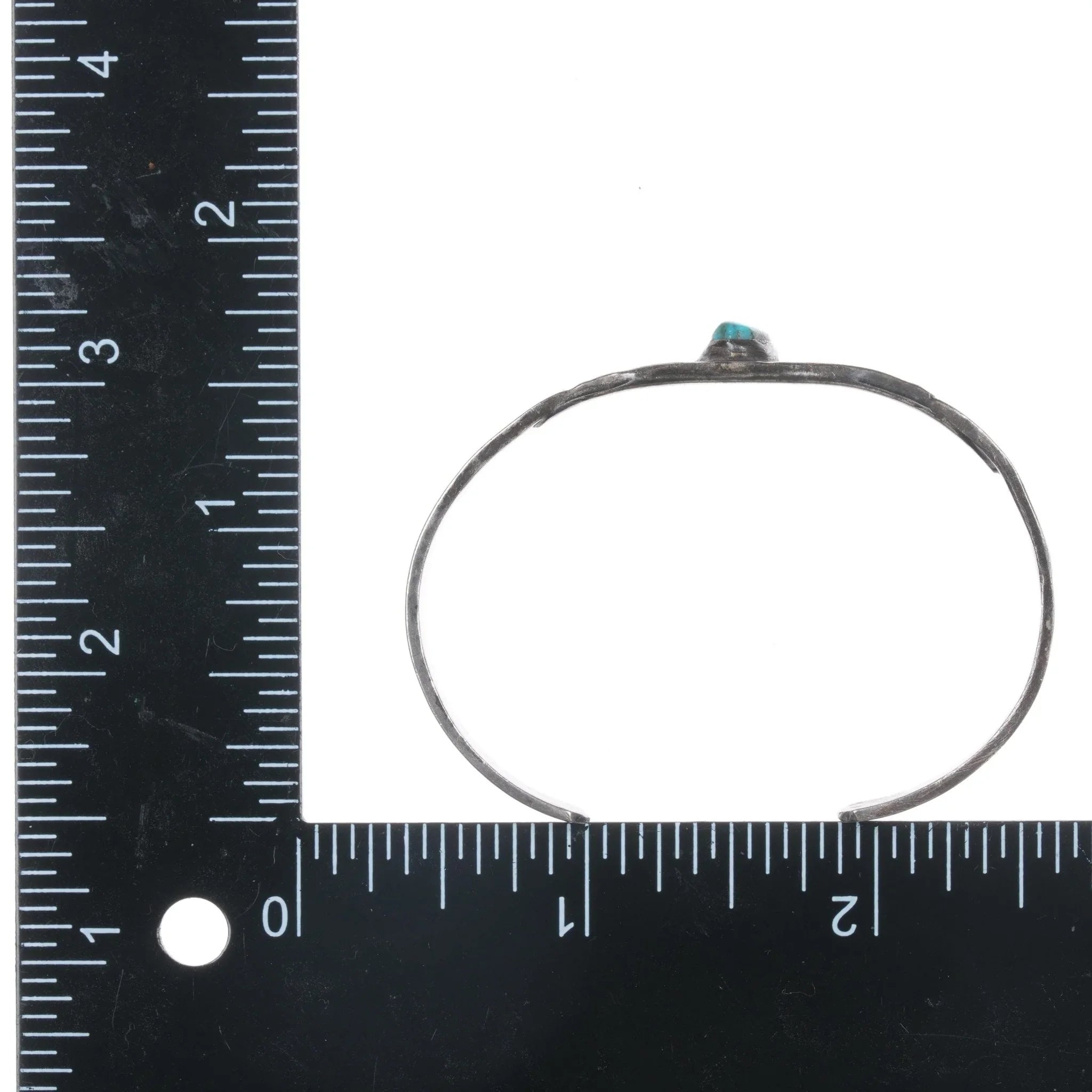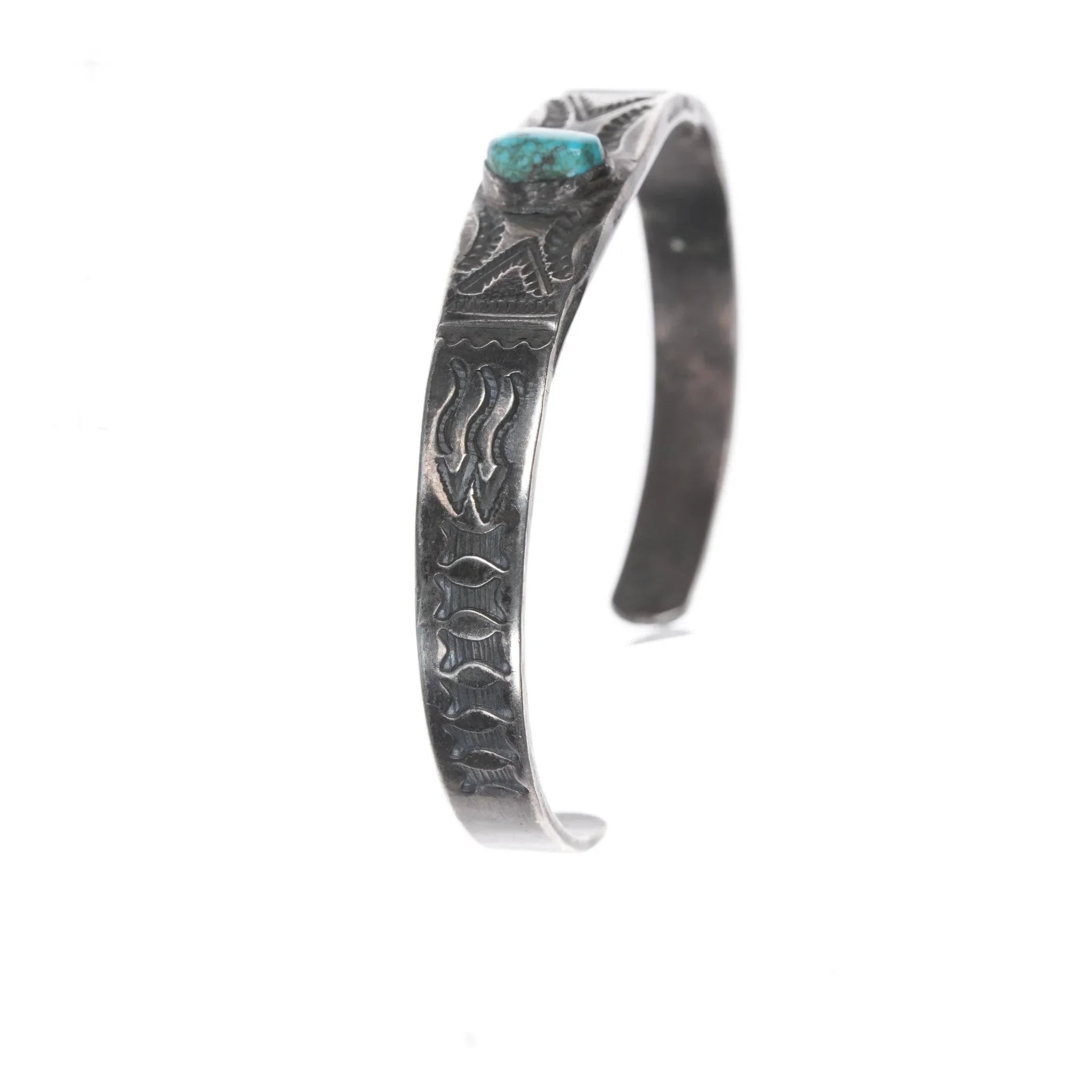 5.75" c1930‘s Navajo silver cuff bracelet with turquoise. Solid silver, weights and measurements in pics. Very old repair with brace added to interior center.