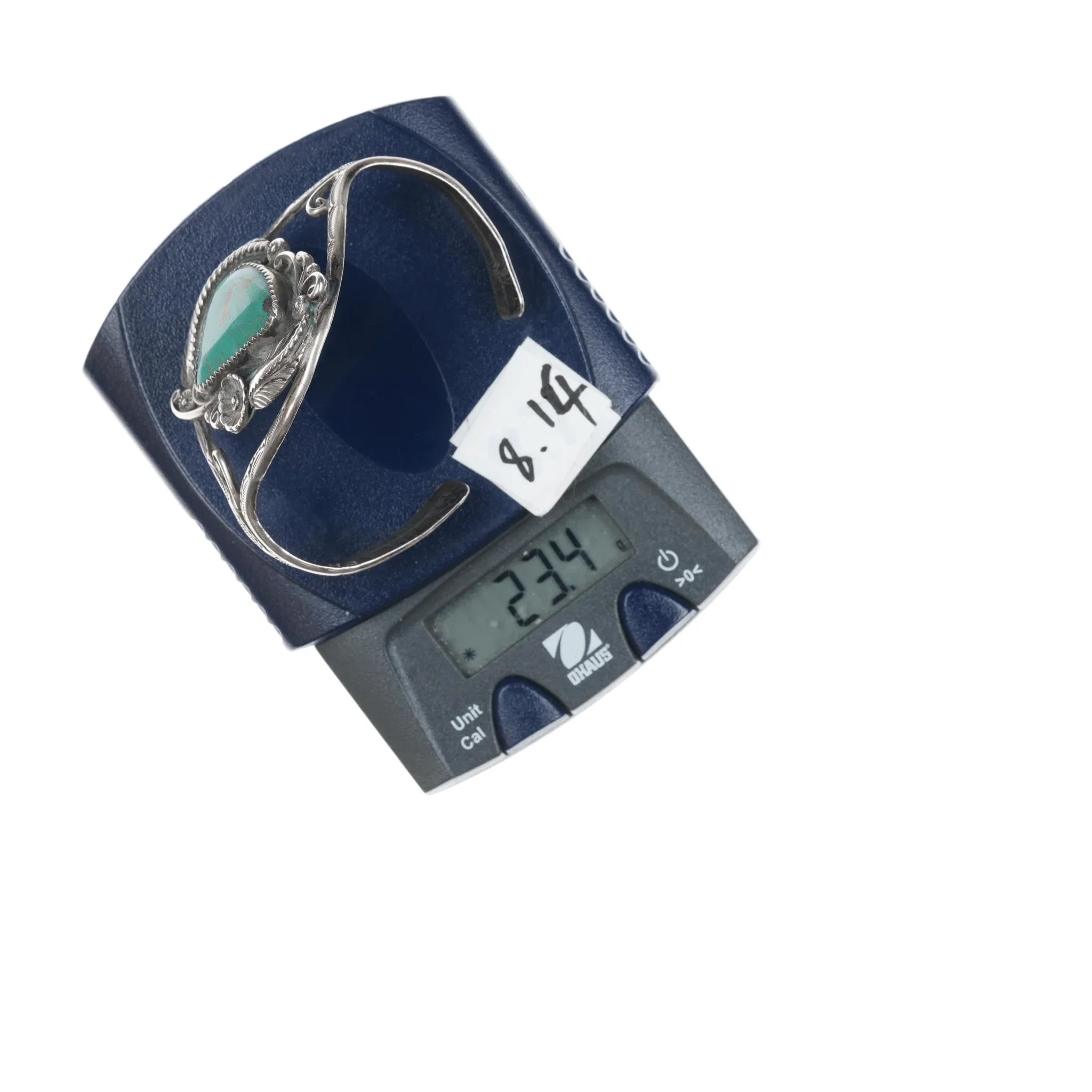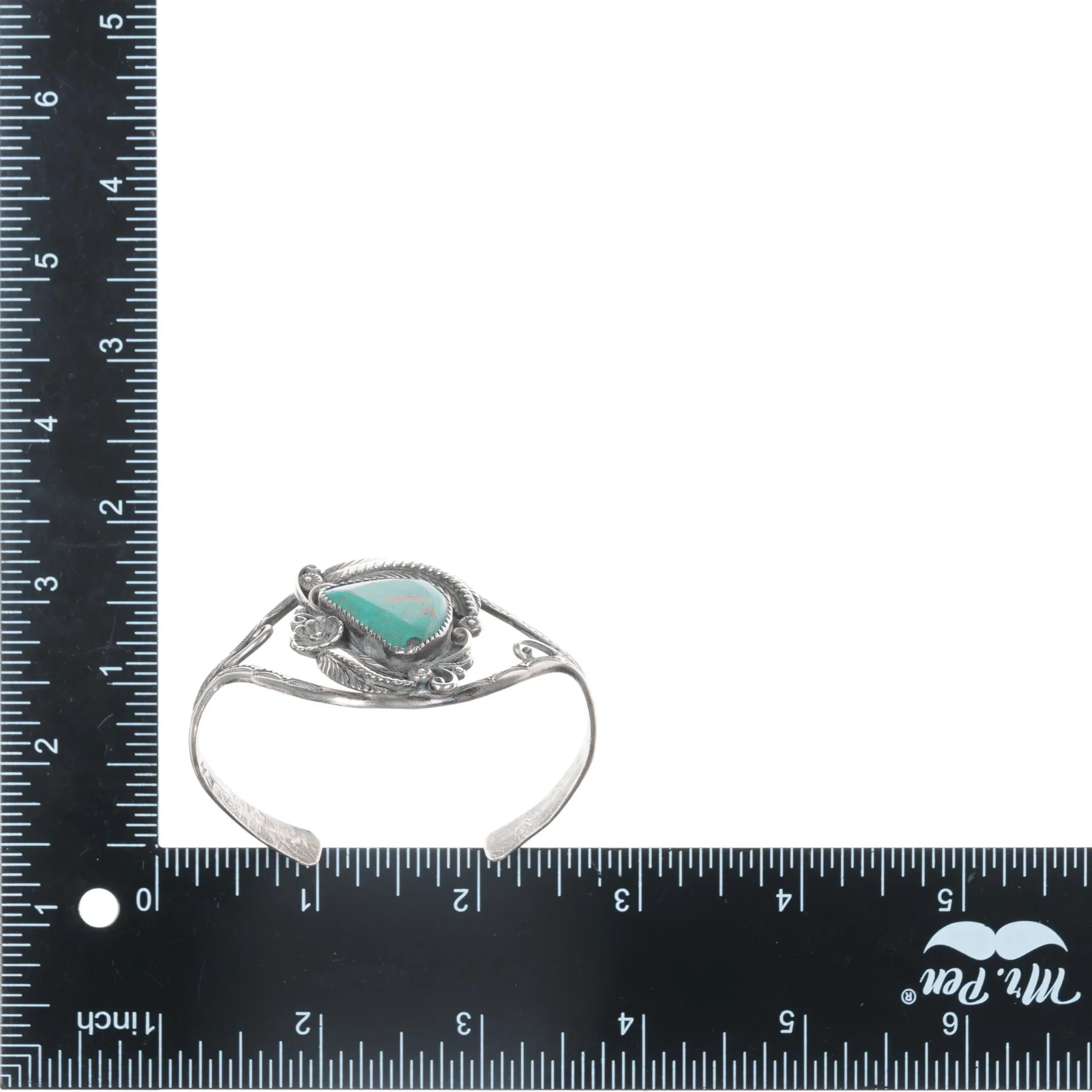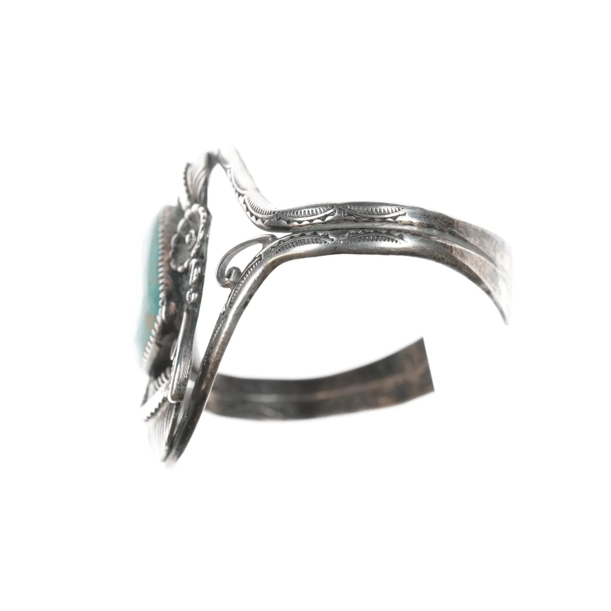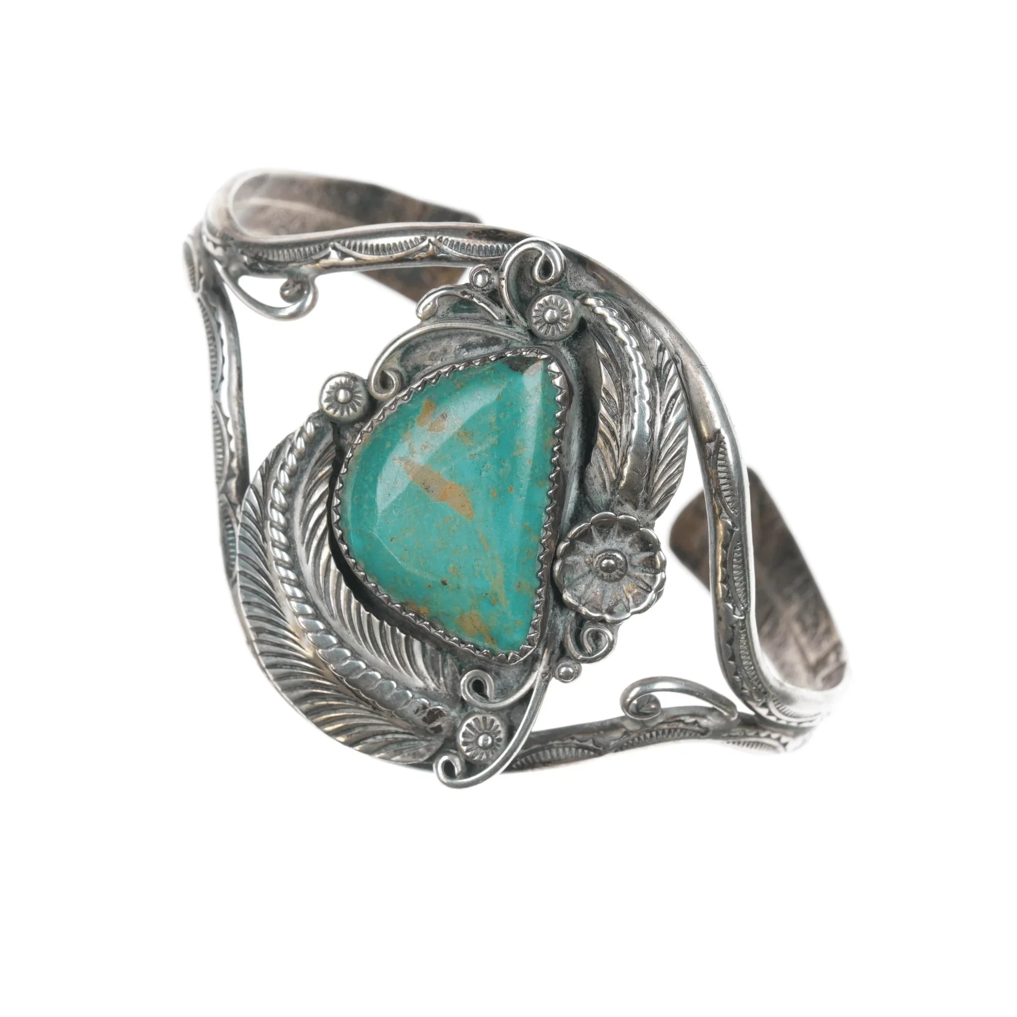 6.25" Vintage Native American sterling feather blossom cuff bracelet - turquoise