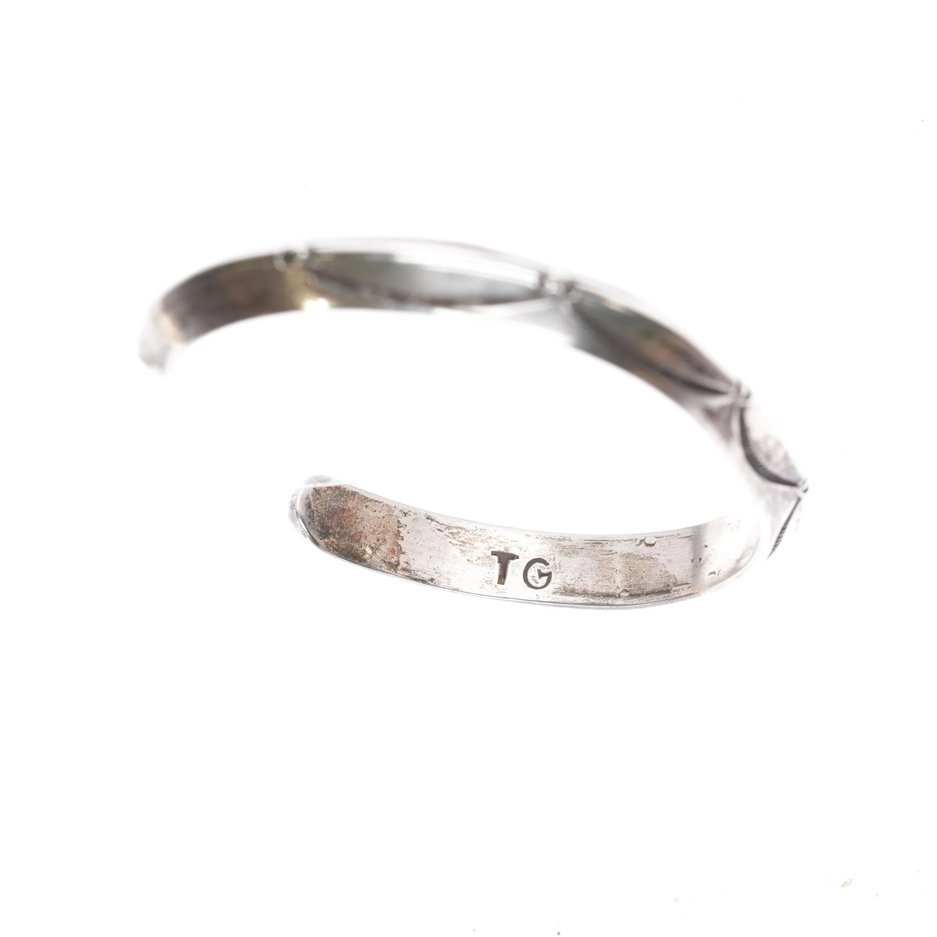 6 3/8" Vintage TG Navajo Carinated ingot silver cuff bracelet. Weight and measurements in pictures, solid sterling silver. Marked as shown.