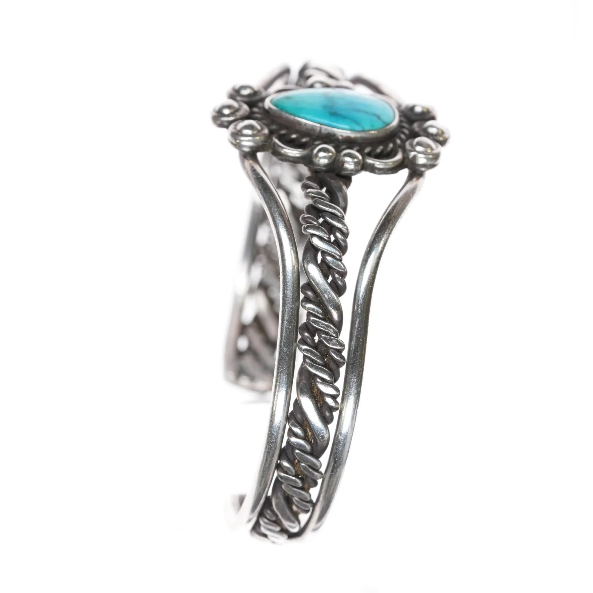 6" 40‘s-50‘s Navajo twisted silver wire cuff bracelet with turquoise. Weight and measurements in pics. Solid sterling, unmarked.