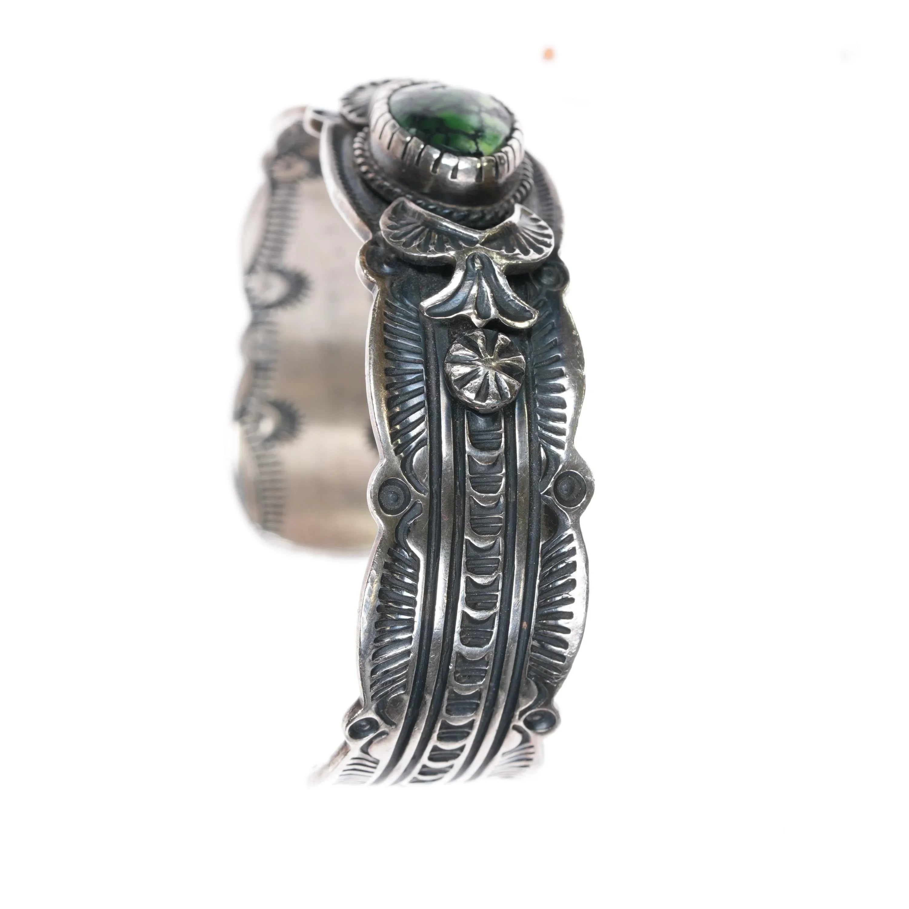 6.5" Virgil Begay Navajo silver spiderweb Damele Variscite cuff bracelet. Weight and measurements in pictures, solid sterling silver. Very high quality bracelet with heavily hand stamped exterior and interior.