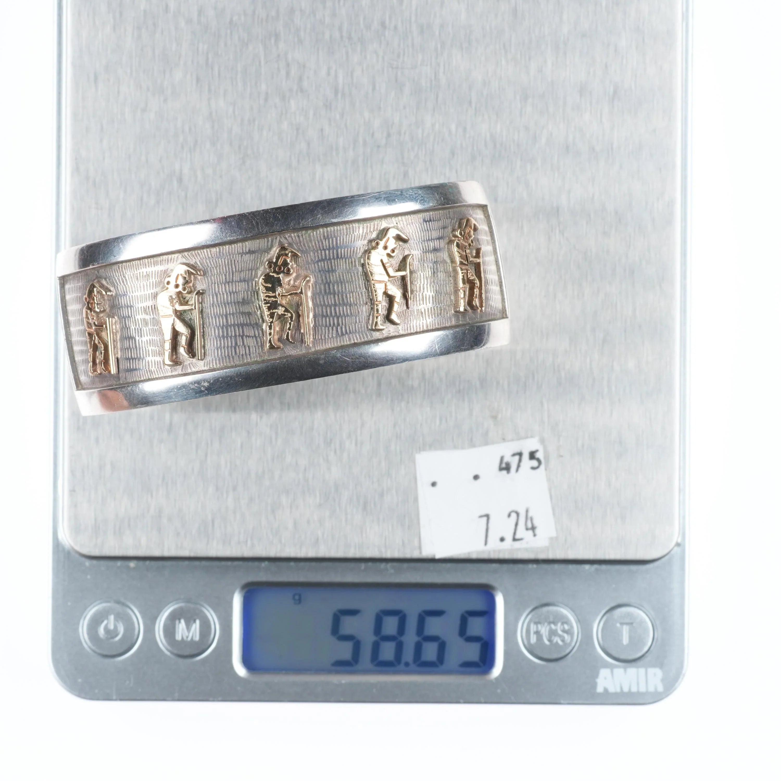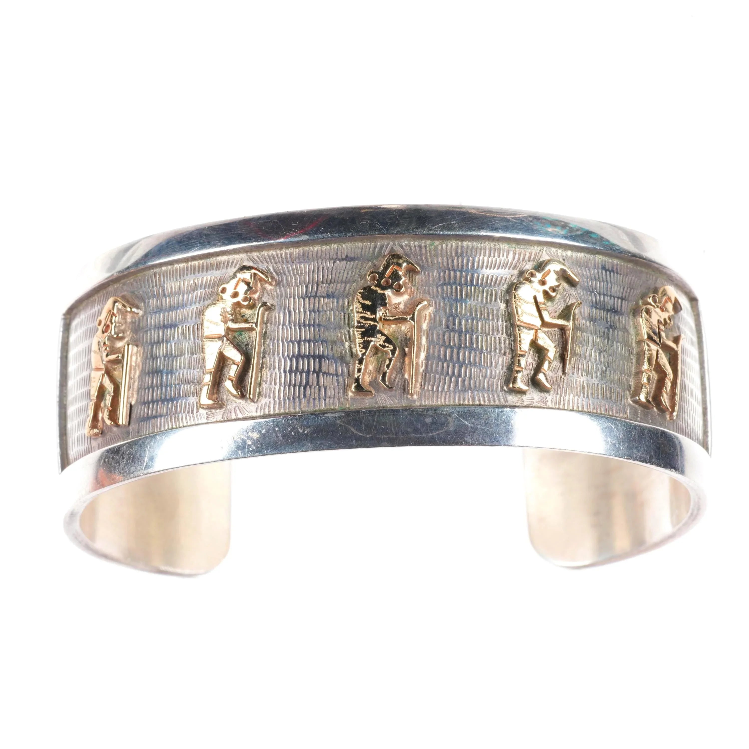 6.6" Bennett Kagenveama Hopi 14k gold/Sterling silver Kokopelli cuff bracelet. Tested and guaranteed thick layer of solid 14k gold on top of the figures on solid sterling silver with weight and measurements in pictures. Good condition, circa last quarter of the 20th century with no issues. Marked with Artists hallmark and no other markings. No sterling or 14k gold markings.