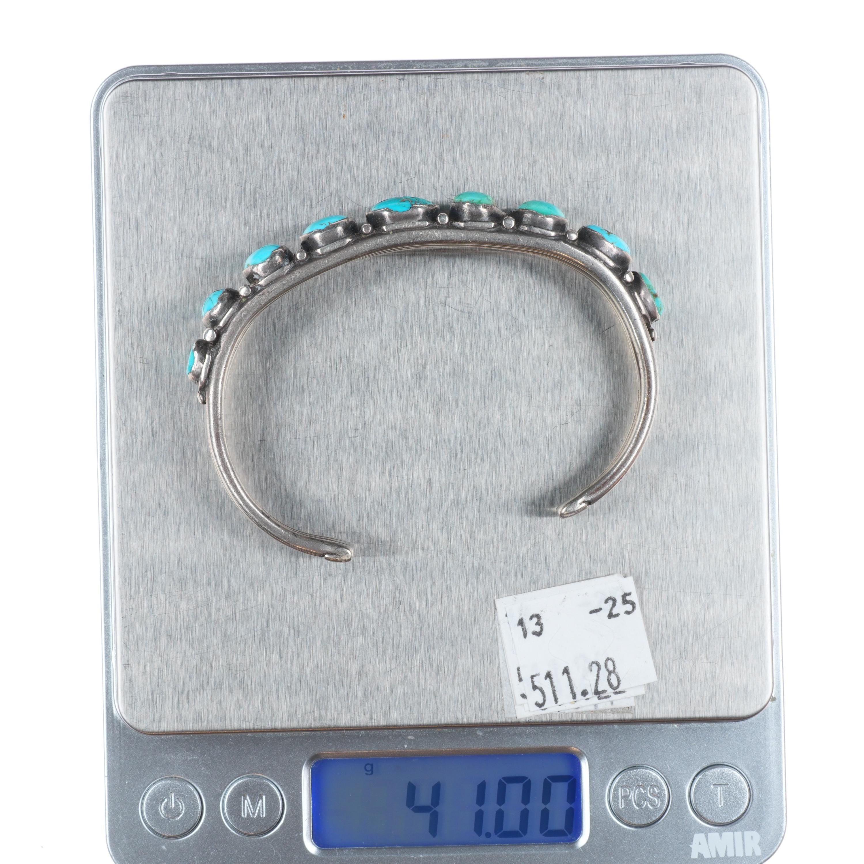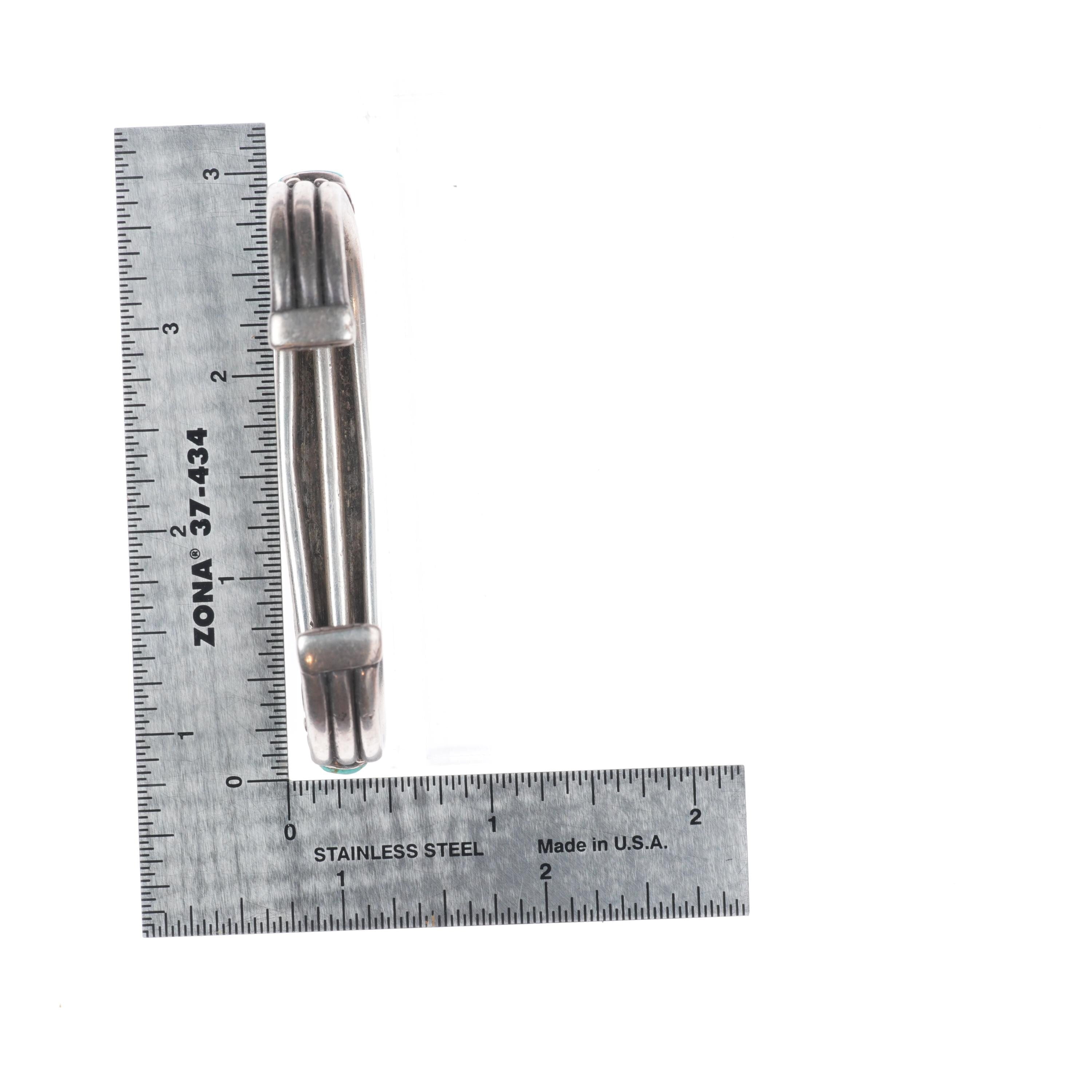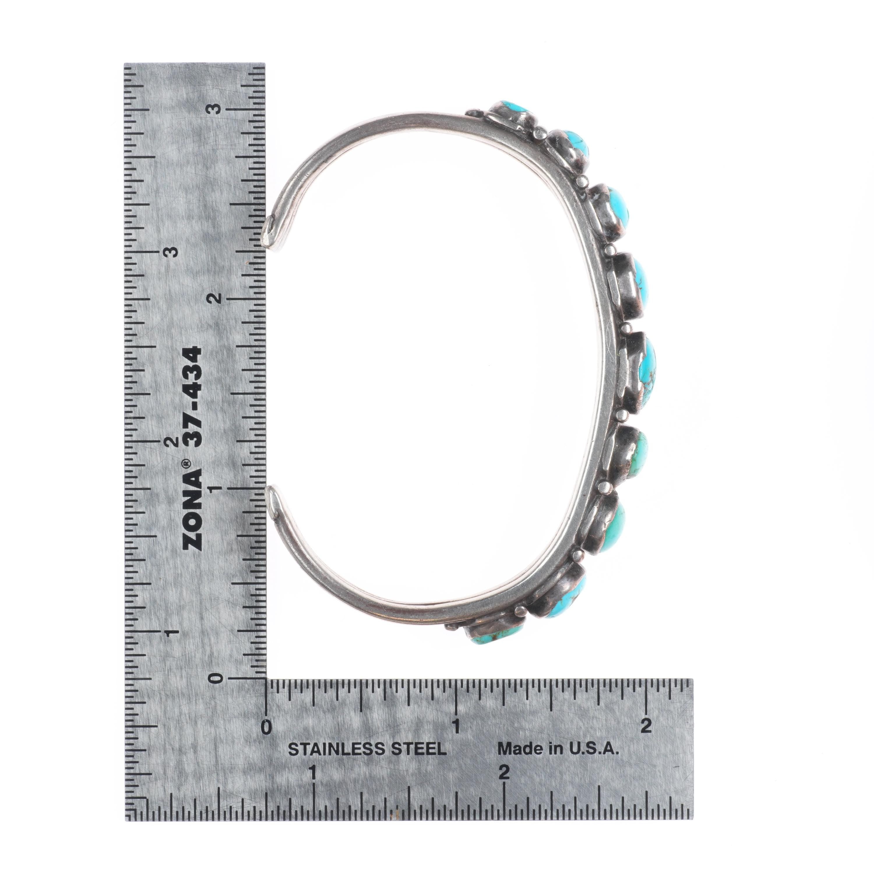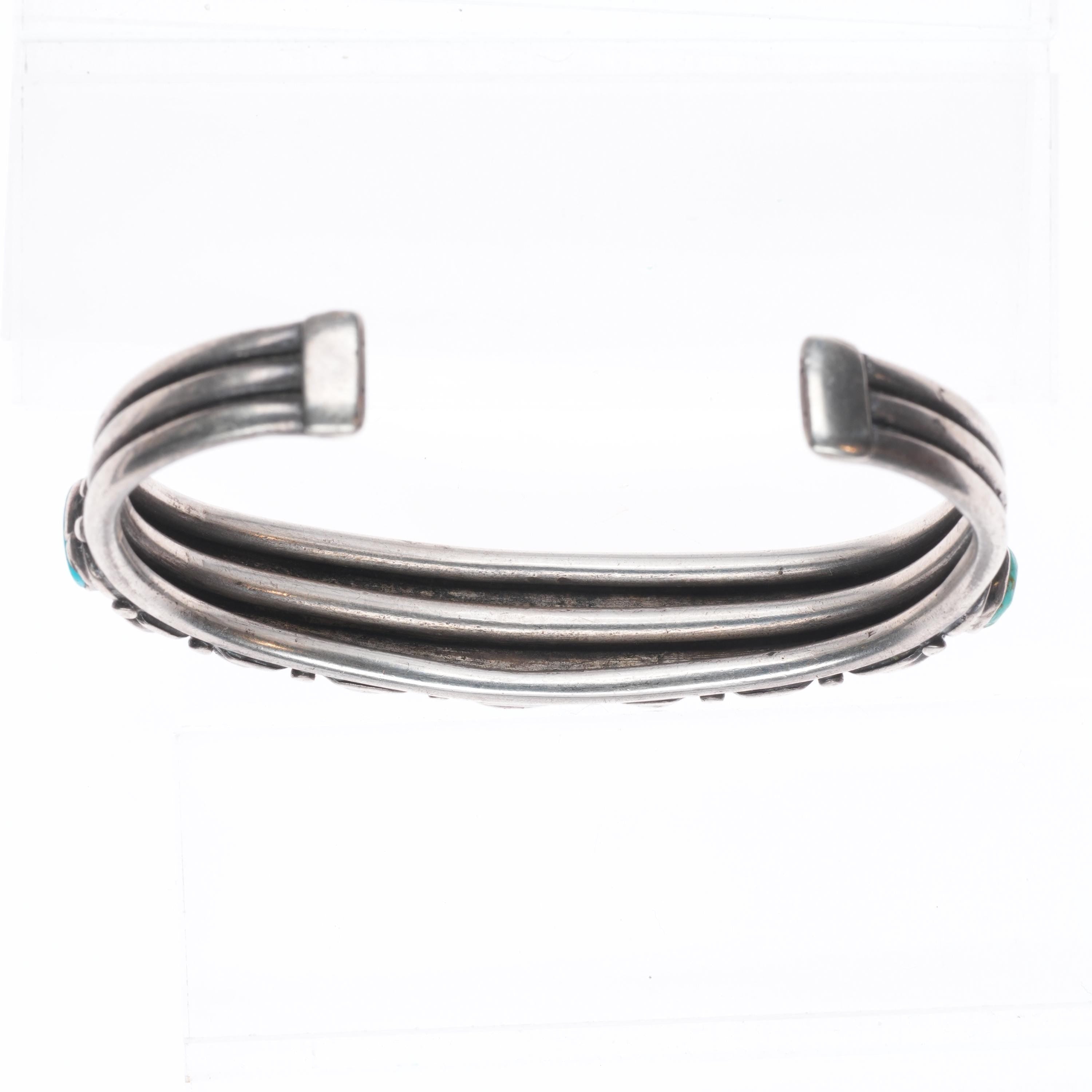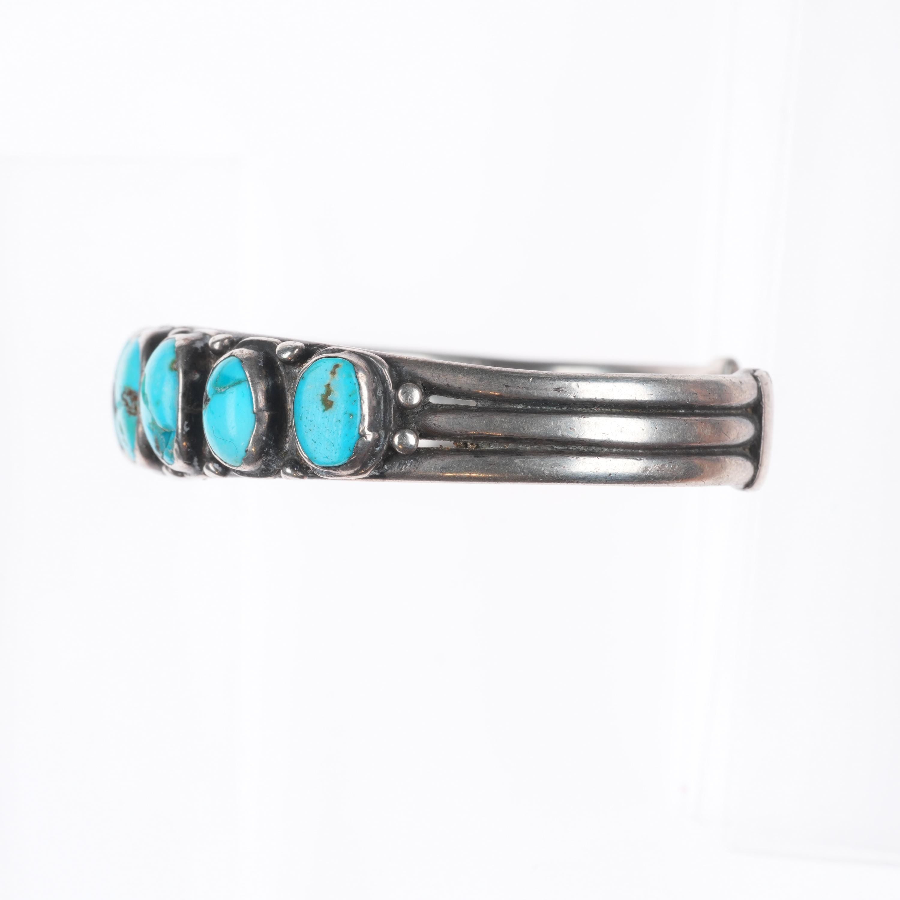 6.7" 1930's Vintage Navajo ingot silver turquoise row cuff bracelet. Tested and guaranteed solid sterling silver with weight and measurements in pictures. Circa second quarter of the 20th century with some expected age appropriate wear. All stones secure, some with fractures.