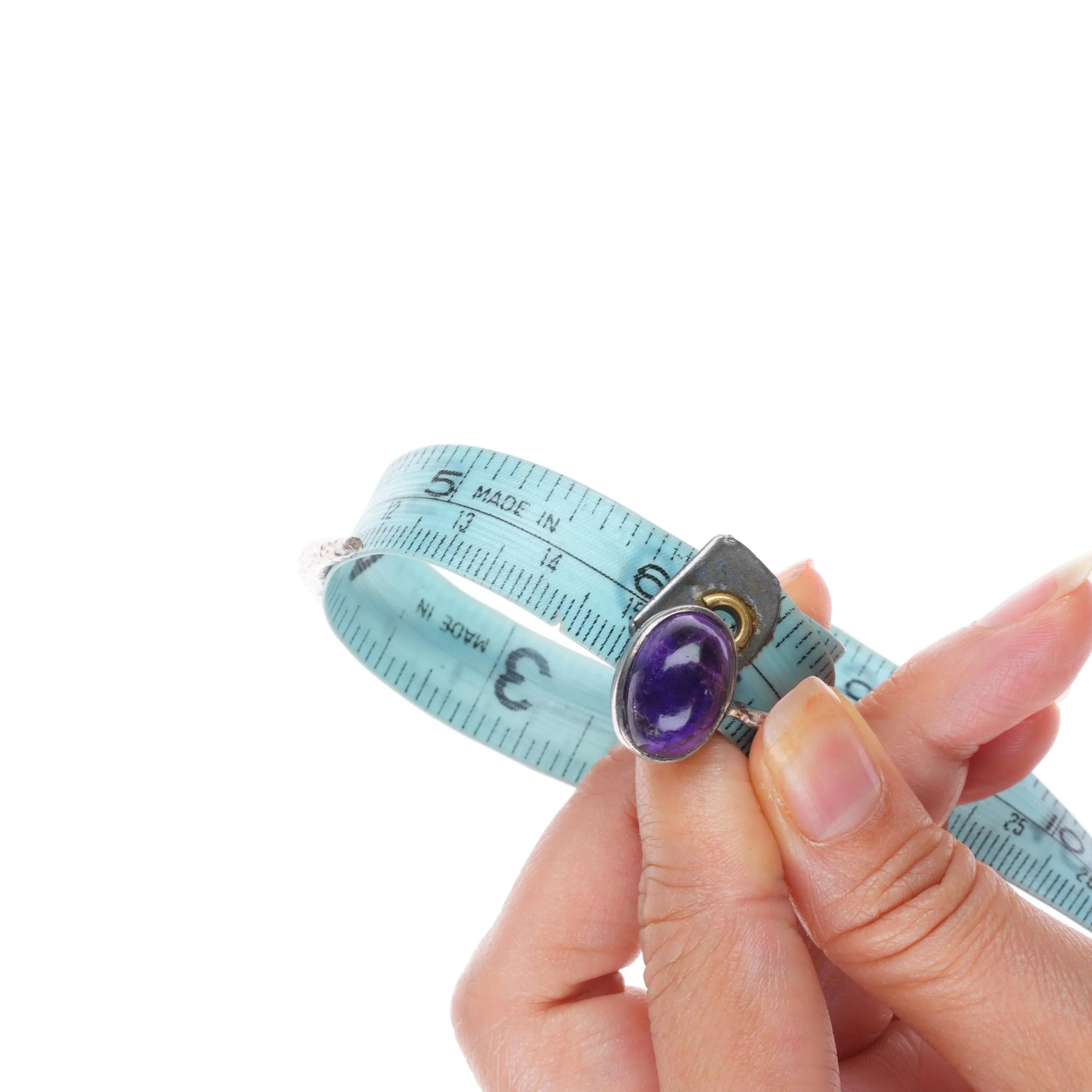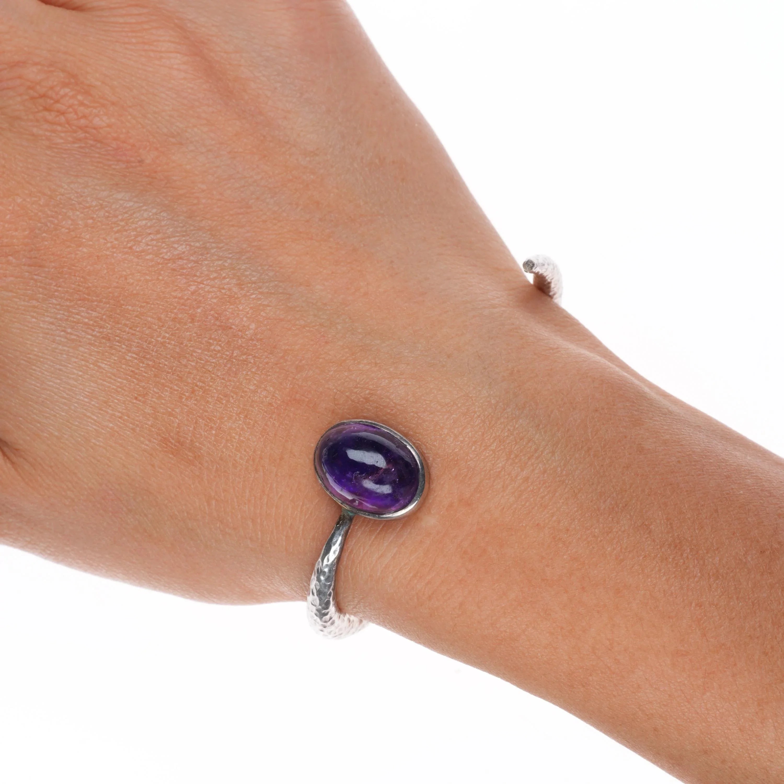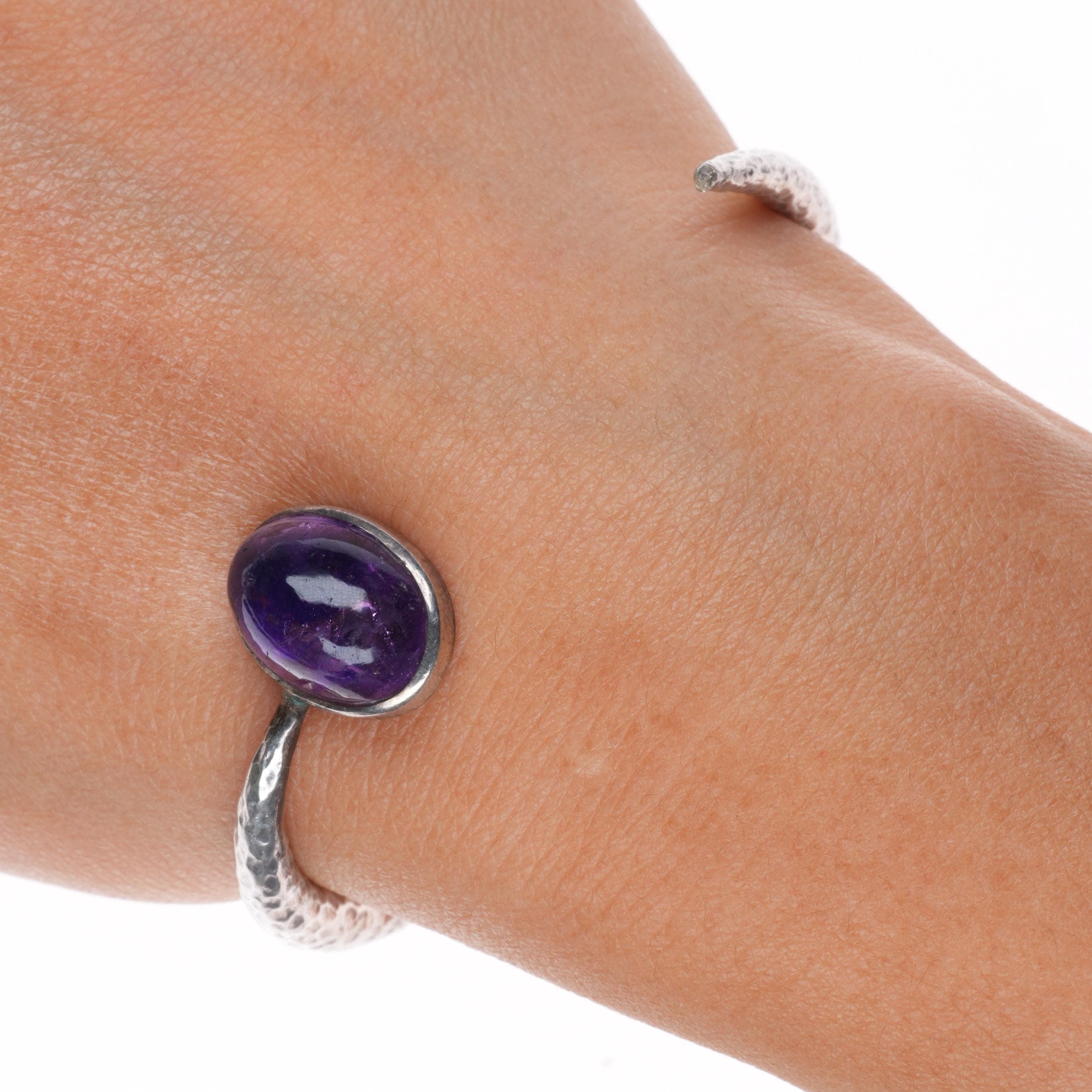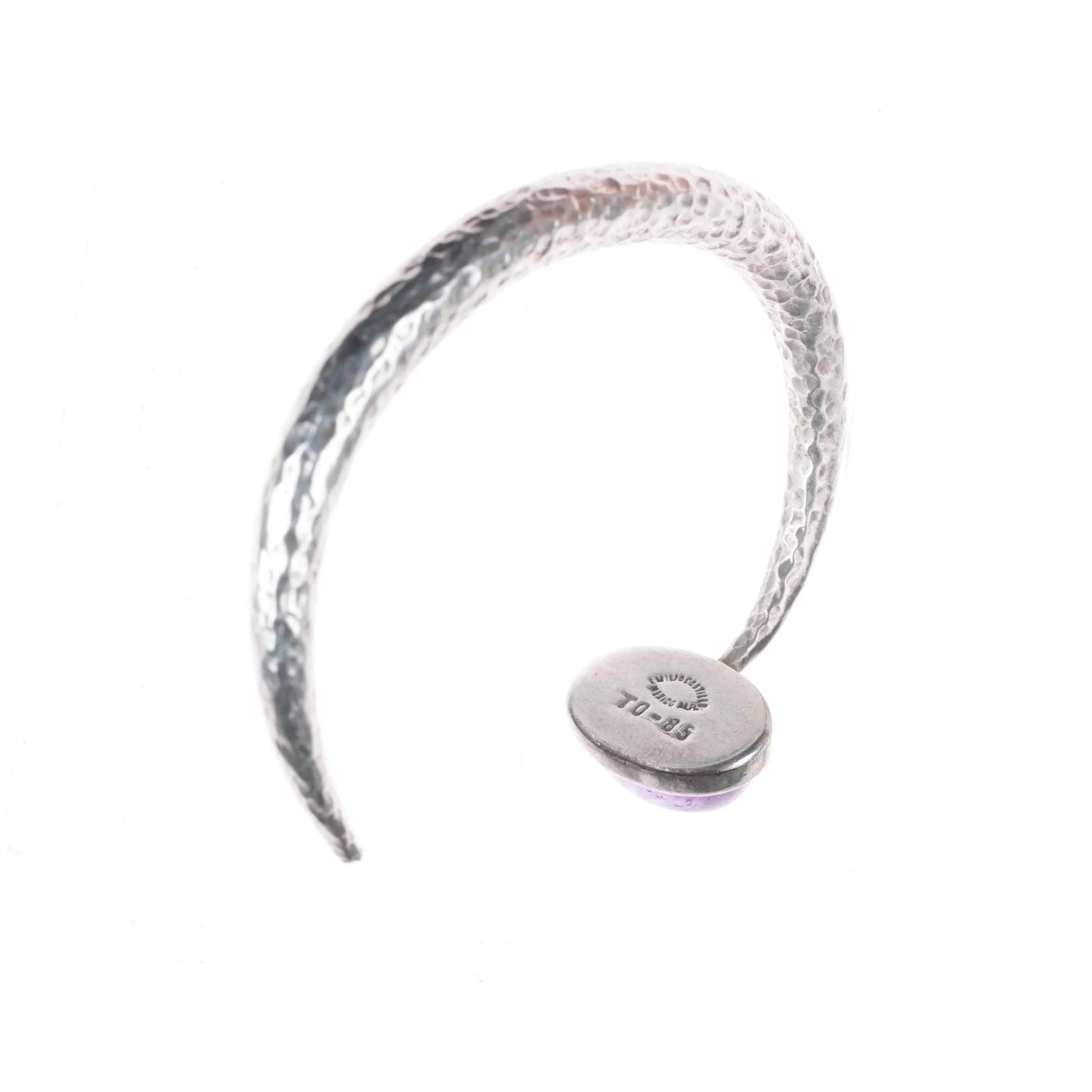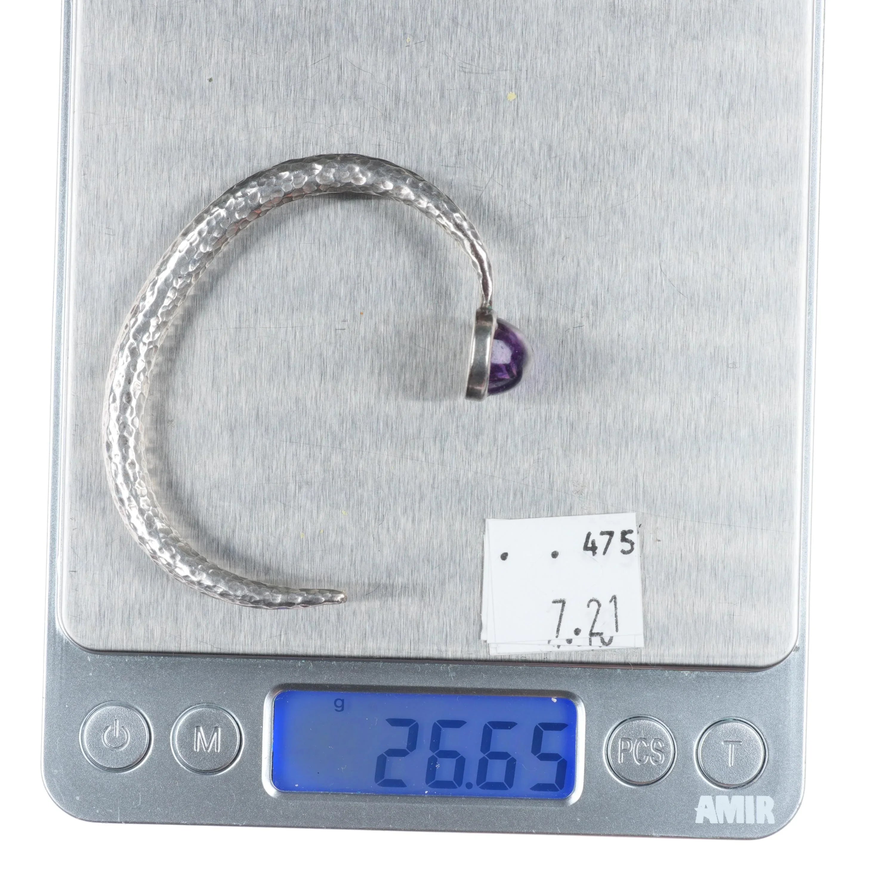 6" Emilia Castillo Modernist hammered sterling silver cuff bracelet w/amethyst. Tested and guaranteed solid sterling silver with weight and measurements in pictures. Good condition, circa last quarter of the 20th century.