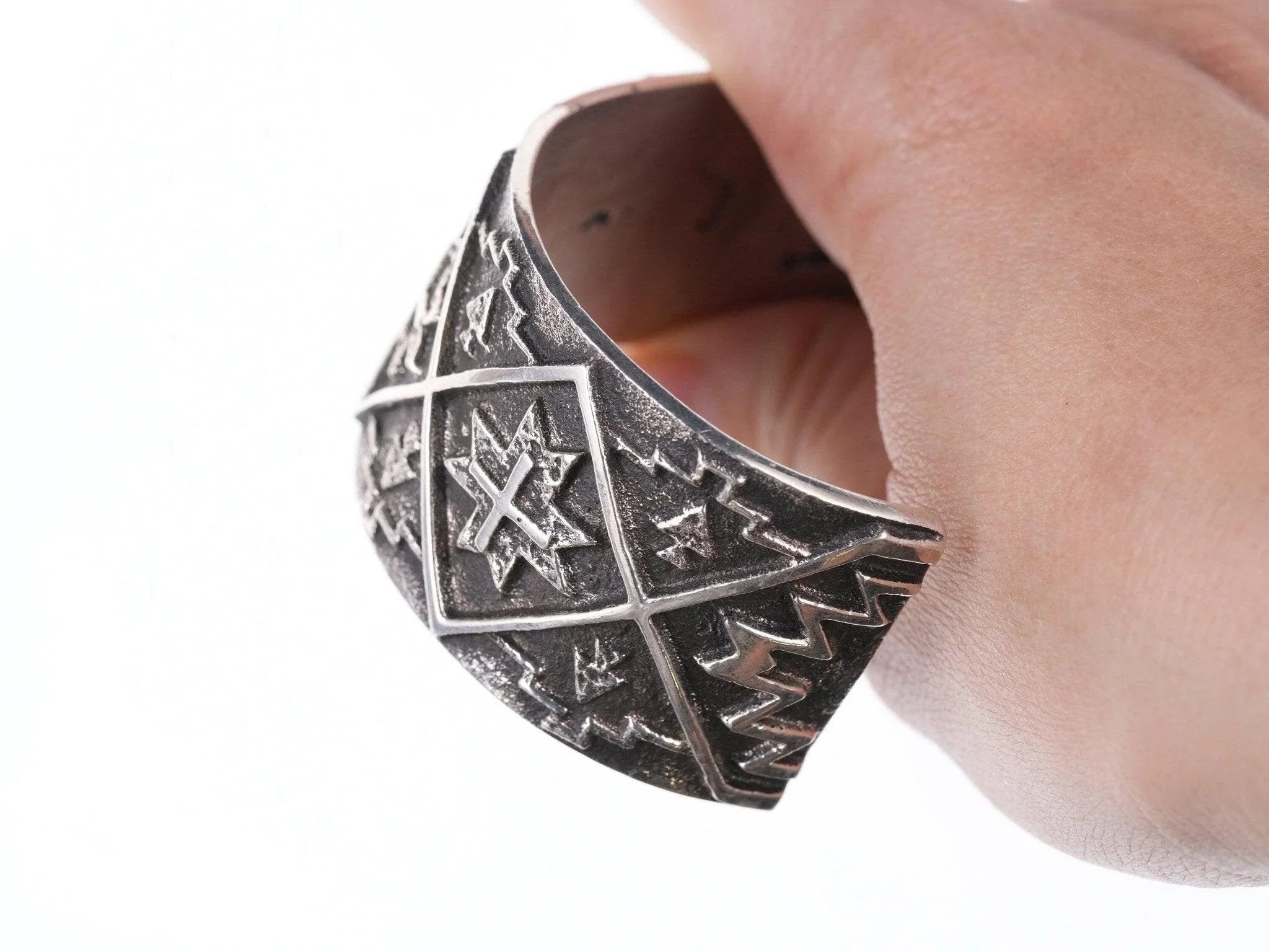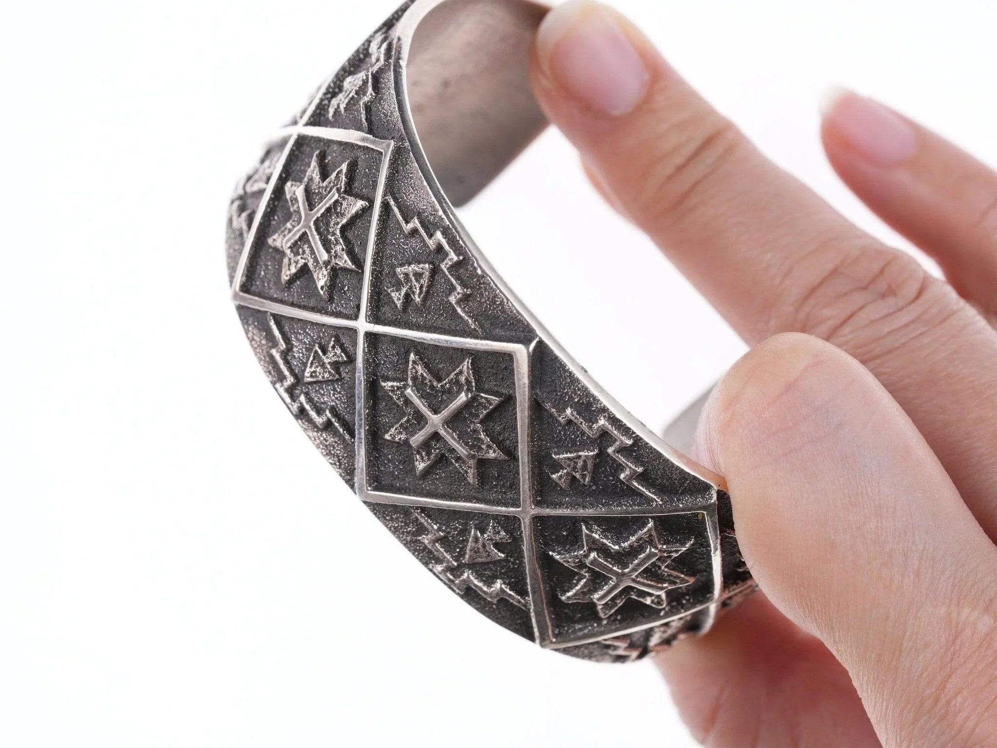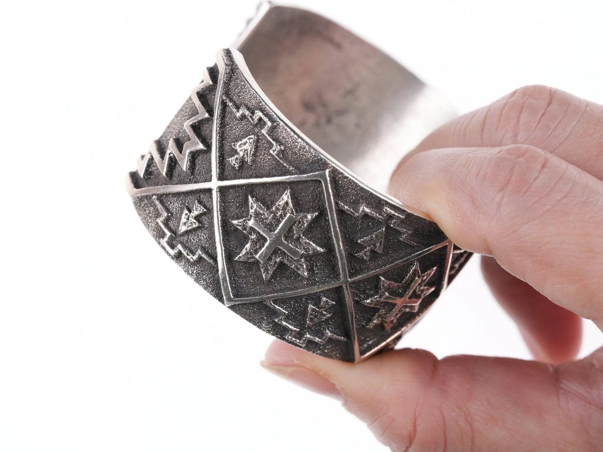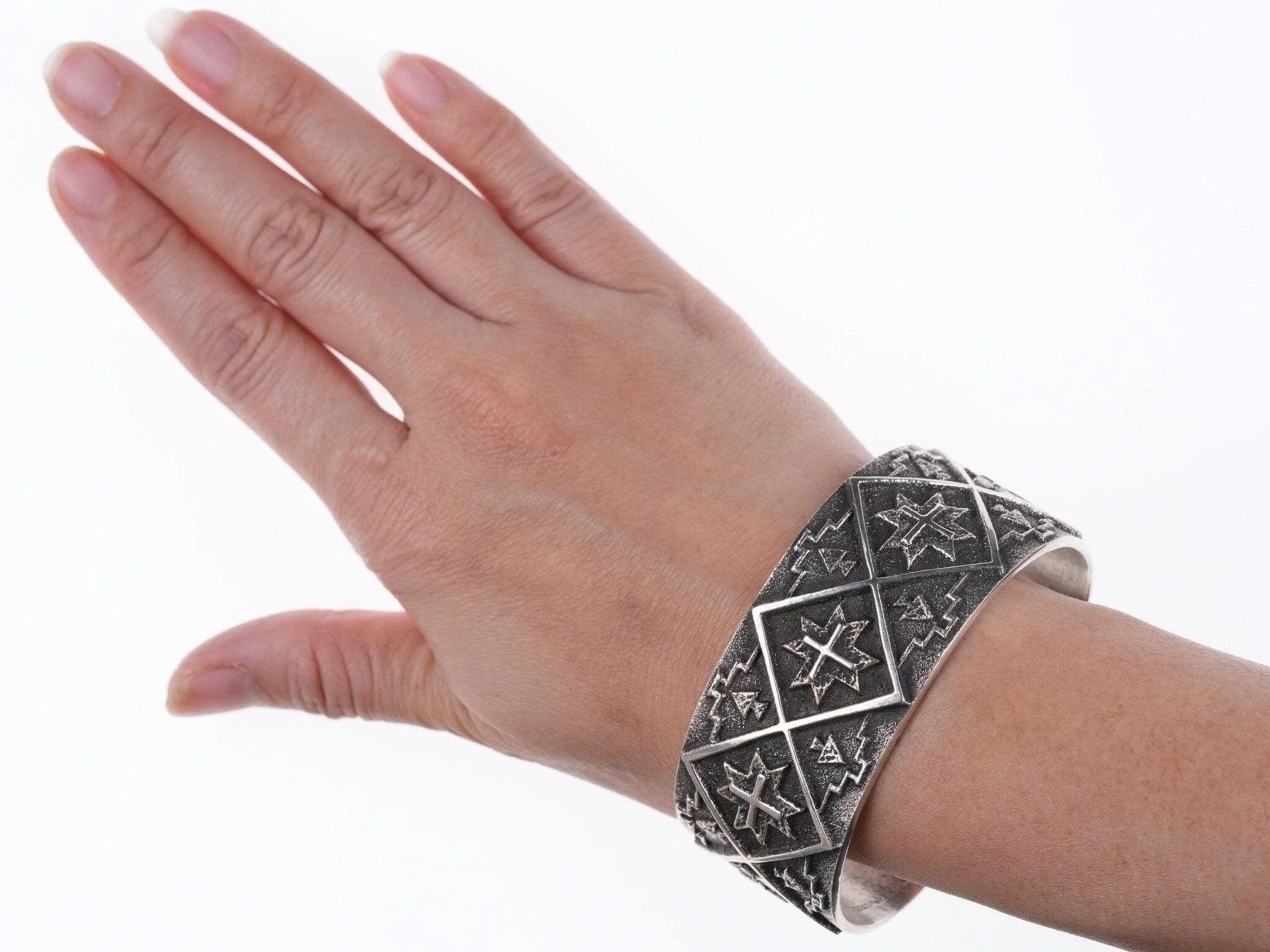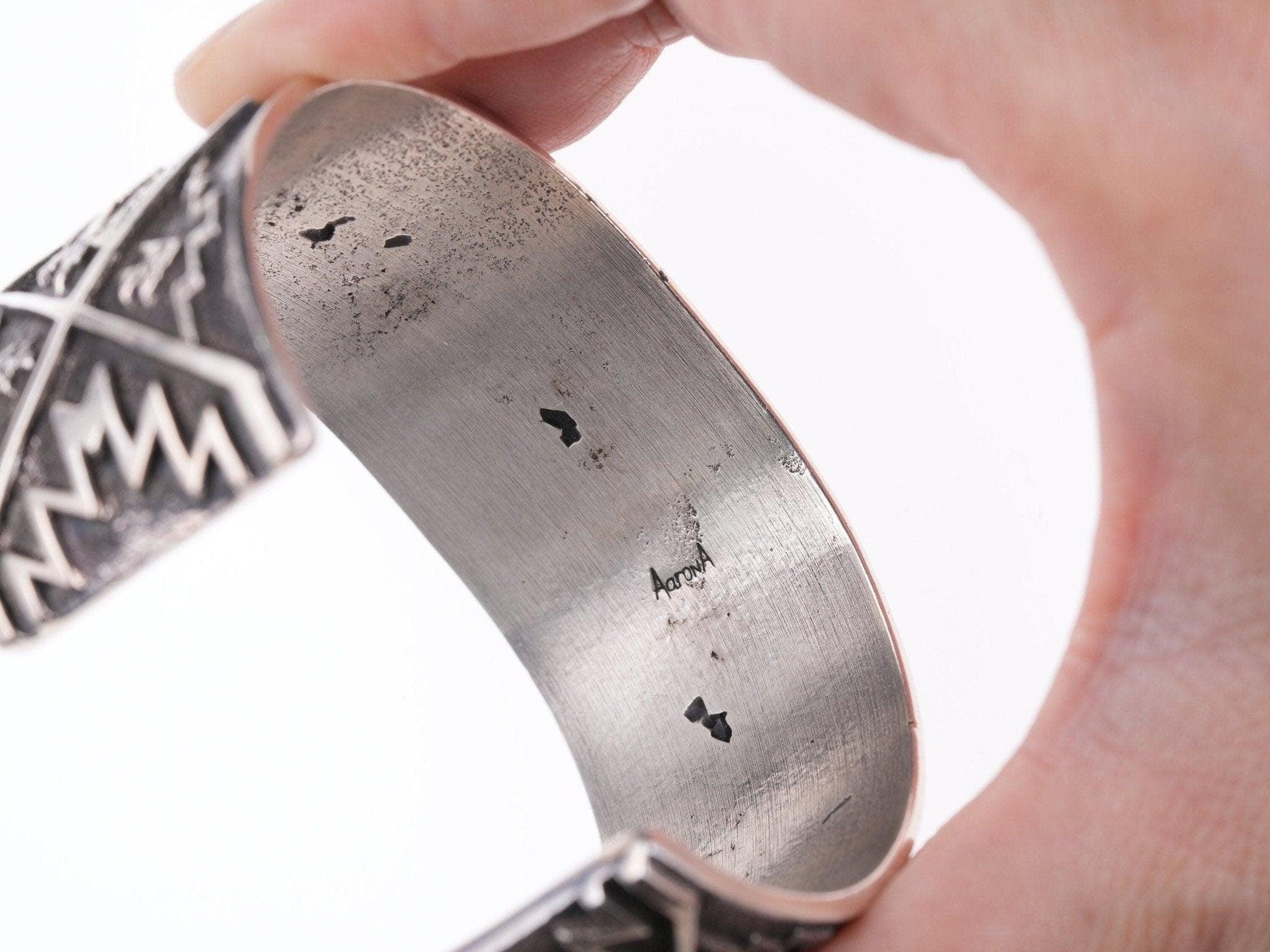 7.25" Aaron Anderson Navajo Tufa Cast silver bracelet<br><br>Navajo silversmith Aaron Anderson was born 1970 in Gallup, New Mexico, on the<br>edge of the Navajo Reservation. Aaron is from a family of artists. He would<br>watch his step-father (Will Begay), and uncle (Wilford Henry) produce<br>exceptional work, and began helping them in 1991. Aaron has been an active<br>silversmith since 1996. He is known for his tufa cast jewelry, and says his<br>inspiration comes from Charles Loloma. Every cast piece is hand carved and<br>completely unique as the tufa blocks can only be used once.<br><br>Aaron, a third generation artist, is a leader in the Native American art<br>community.<br><br>He is very passionate about his work and has no problem sharing his thoughts<br>with the world. His creativity and workmanship speaks for itself and is highly<br>valued among art collectors and fellow artists around the world. Aaron uses<br>elements from his strong Christian faith as well as traditional Native American<br>designs.<br><br>Aaron has won many blue ribbons at every show he enters, including eight best in<br>casting at the famed Gallup Intertribal Ceremonial. Today he shows at the<br>Indigenous fine art market in Santa Fe and the Native Jewelers Society.<br>All precious metals are tested and guaranteed, any Native American jewelry<br>referred to as Silver or Sterling is guaranteed to be a minimum of 90% (coin)<br>silver and possibly higher content. Anything marked is guaranteed to be what<br>it's marked, most bracelets are photographed on a 6" wrist (non hairy), rings<br>photographed on the appropriate sized finger when possible. With bracelets if<br>the measurement is not given in the description then inside circumference is<br>shown where the metal meets the number on the the cloth tape measure.