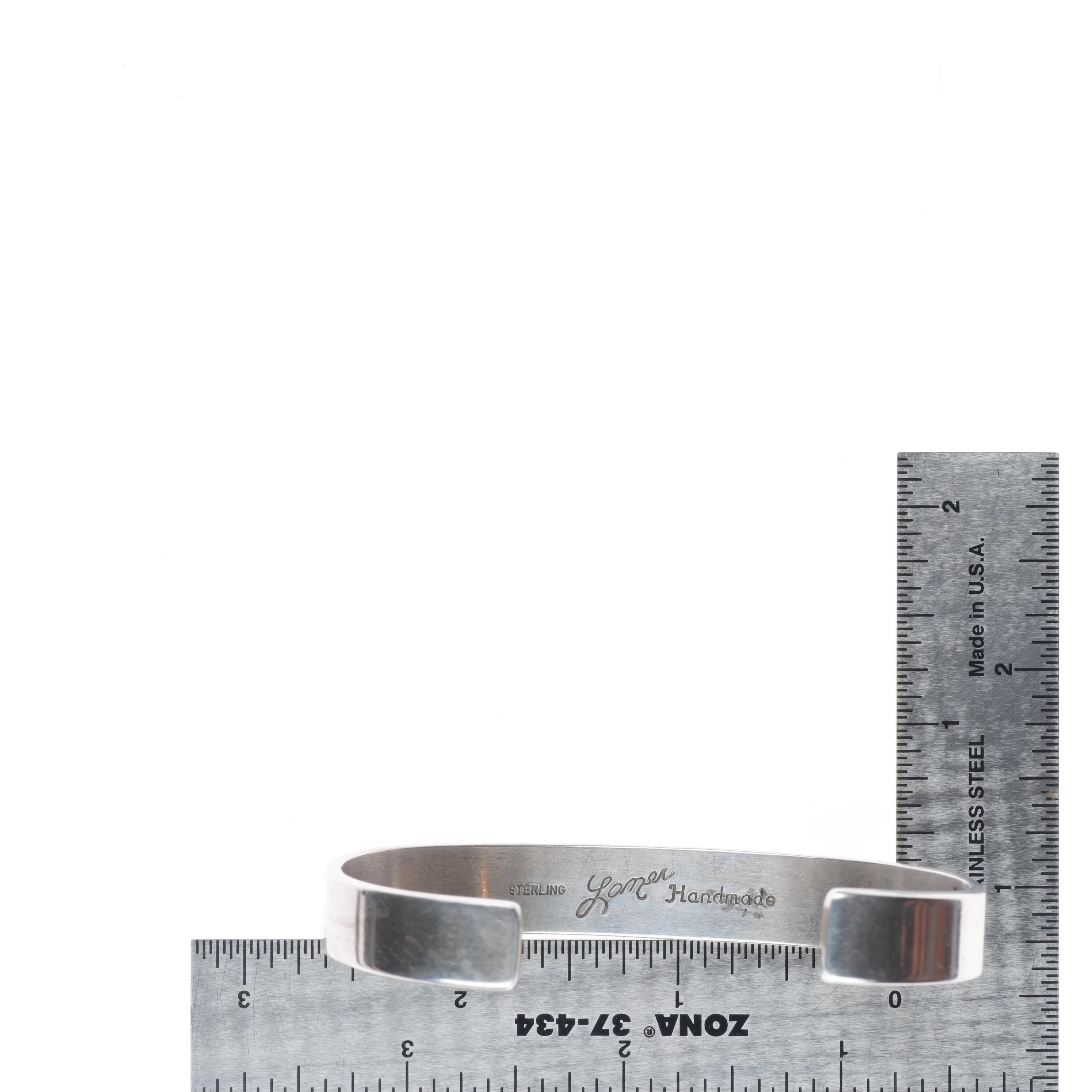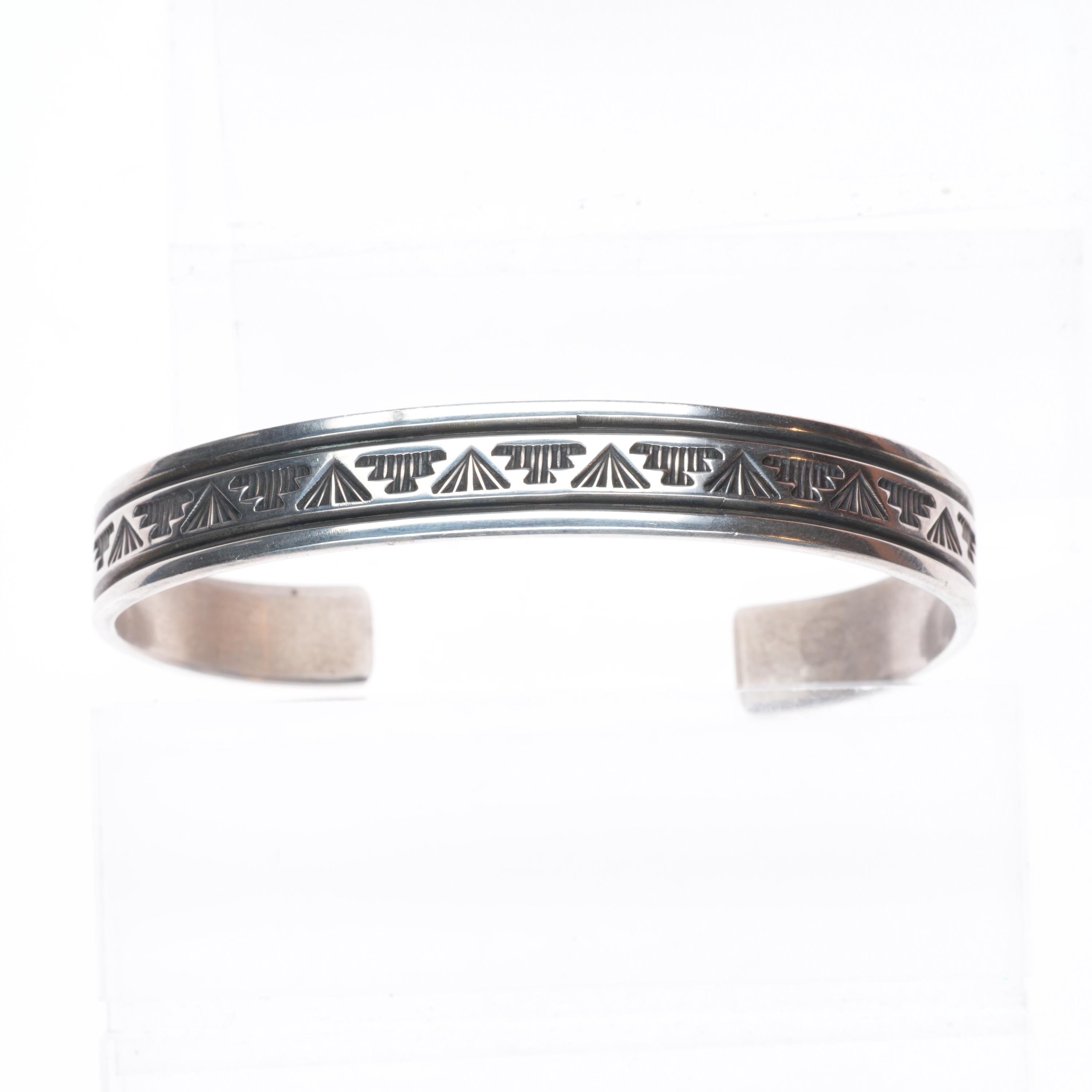 7.25" Troy Lamer Navajo sterling silver slim stacker stamped cuff bracelet. Tested and guaranteed solid sterling silver with weight and measurements in pictures. Circa last quarter of the 20th century. Fits up to a 7.25" wrist without adjustment, though .25" or more of careful adjustment is typically very simple. Any adjustment will change the gap size of course which is shown in the pictures.