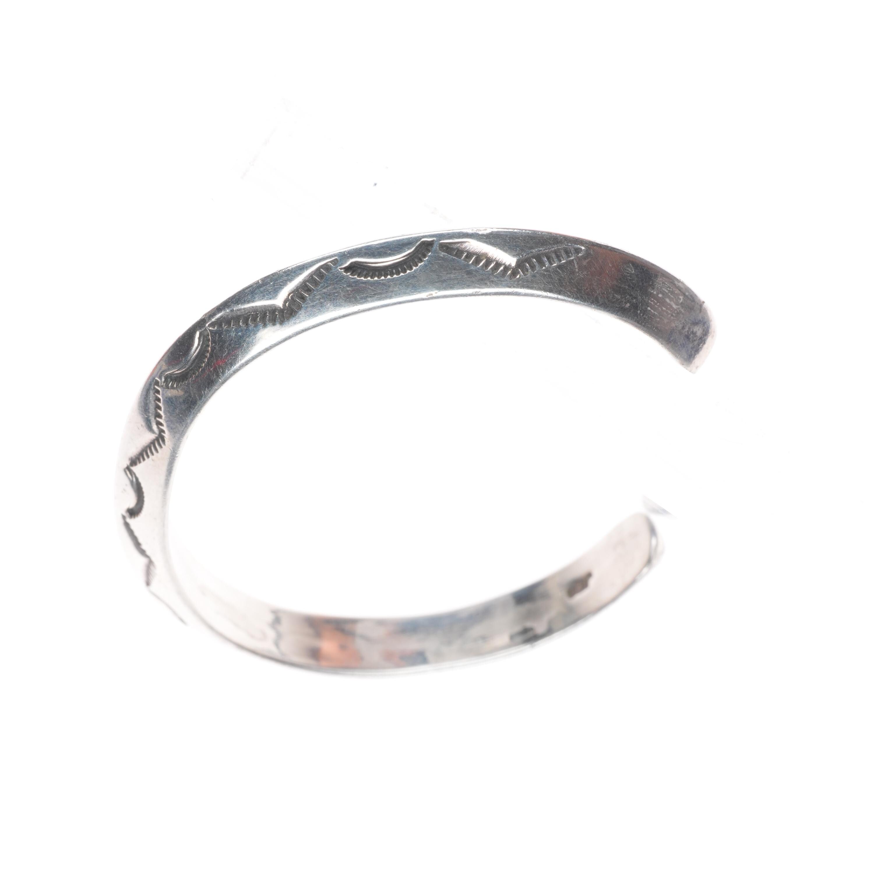7" Vintage Navajo JEC Deep stamped sterling silver carinated cuff bracelet. Tested and guaranteed solid sterling silver with weight and measurements in pictures. Great condition with age appropriate wear, circa third quarter of the 20th century. Weighs 35-40 grams, scale pic is off.