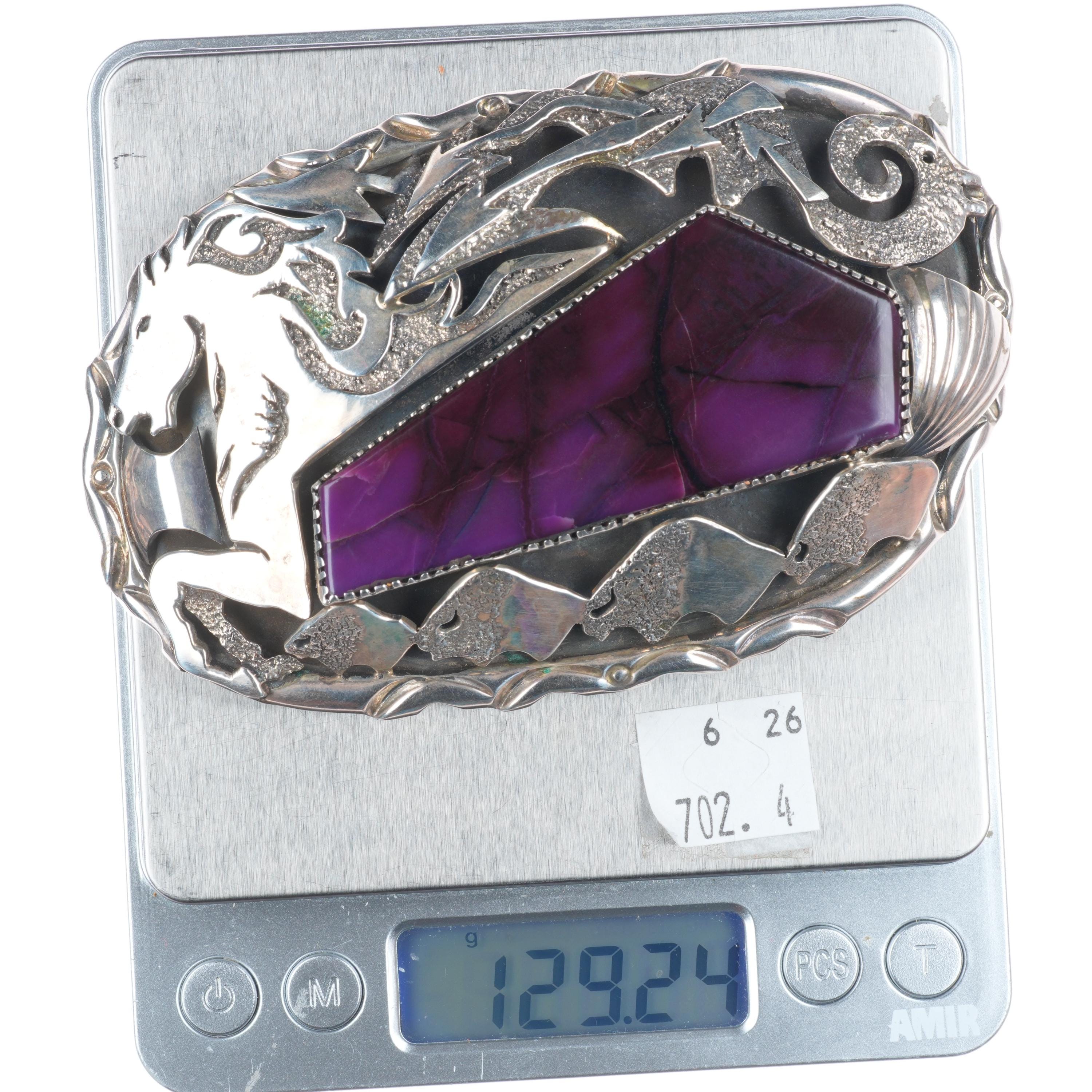Big Dan Nieto Santo Domingo sterling silver sugilite horse/buffalo belt buckle. Tested and guaranteed solid sterling silver, weight and measurements in pictures. Fully functional. All items will likely have some age appropriate/expected wear, the older they are the more wear they should have. Circa last quarter of the 20th century.. Fits up to a 2" belt