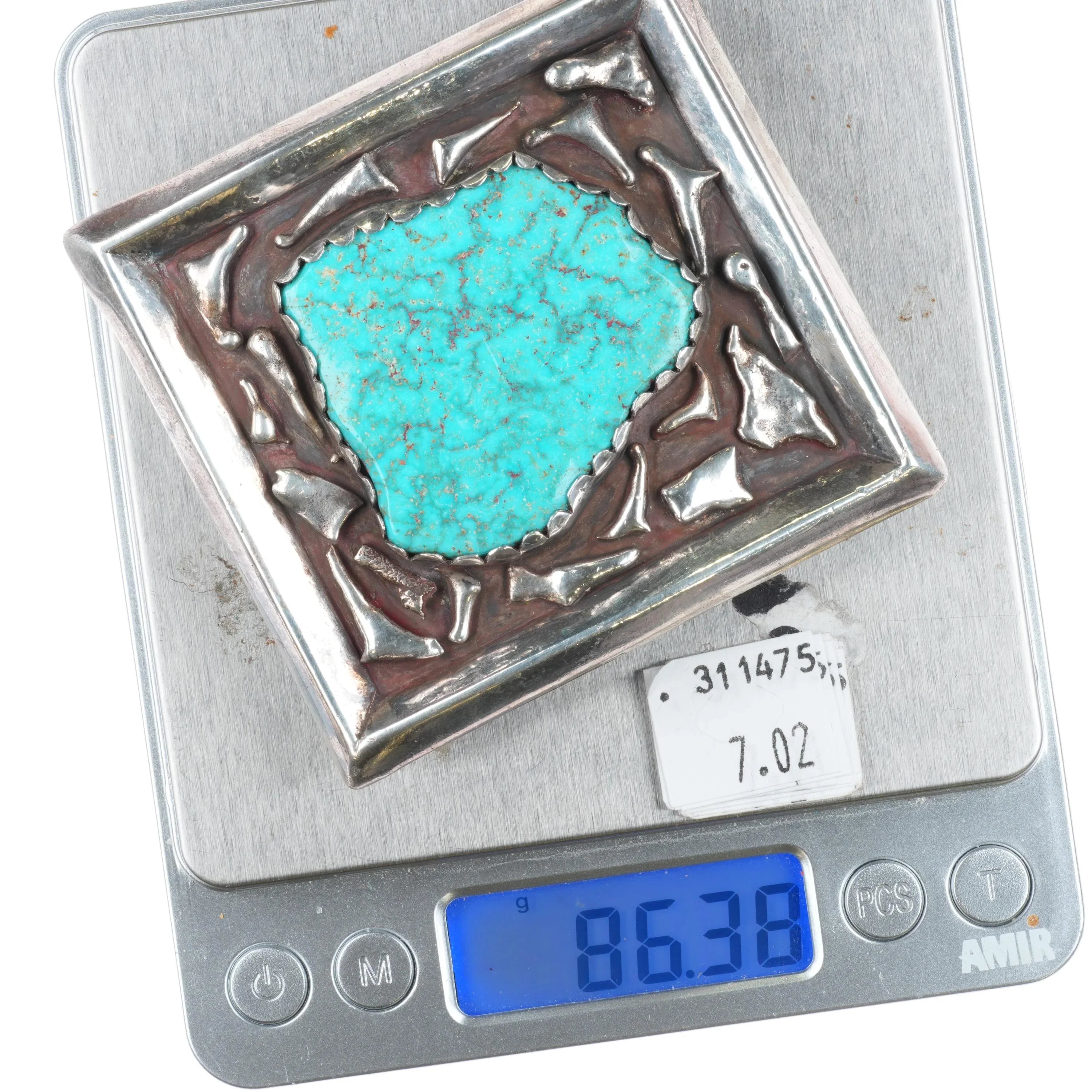 Big Vintage Southwestern sterling silver waterweb turquoise belt buckle. Tested and guaranteed solid sterling silver. Fits up to a 1.25" wide belt. Some expected wear. Good condition, functional with no damage or unsightly wear.. Most likely Native American made, unmarked, gorgeous high grade turquoise. Nice old buckle from the 3rd quarter of the 20th century.
