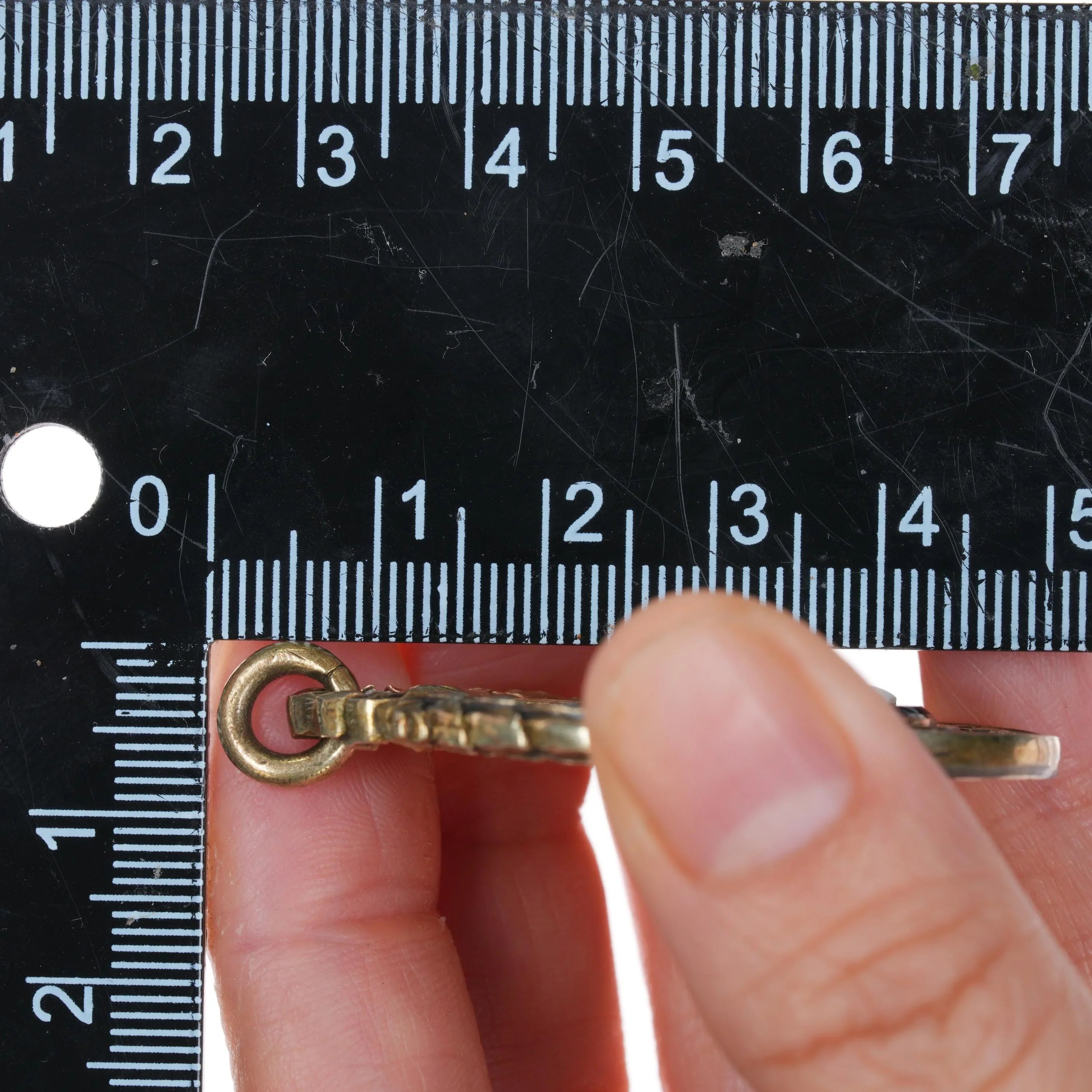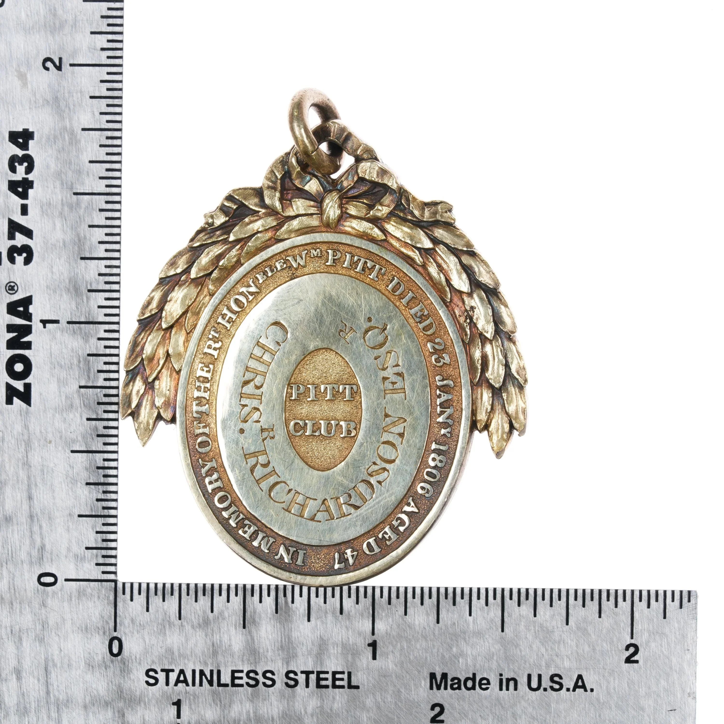 A superb quality antique English, gold cased solid silver Pitt Club fob (of William Pitt, British Prime Minister 1783-1801, and 1804-1806 - formed shorty after his death to promote his policies of financial and democratic reform); beautifully crafted with a wreath design to the upper section, the Latin motto ‘Non Sibi Sed Patriæ Vixit‘ (Not for himself but for his country) and a superb mono shell on glass cameo, beautifully hand carved to depict William Pitt the Younger, and to the back, Pitt‘s name and the name of the club member - John Toplis Esq.r. A wonderfully interesting and scarce medal - and very collectable! CONDITION : All original and very, very good. Minimal evidence of wear, old hairline through bottom bust part of cameo, negligible. DEFECTS : None. DATE/MARKS : Around 1810/20, maybe a little later. Not marked. DIMENSIONS : 45.7 x 40.6 mm (1 inch = 25.4 mm).