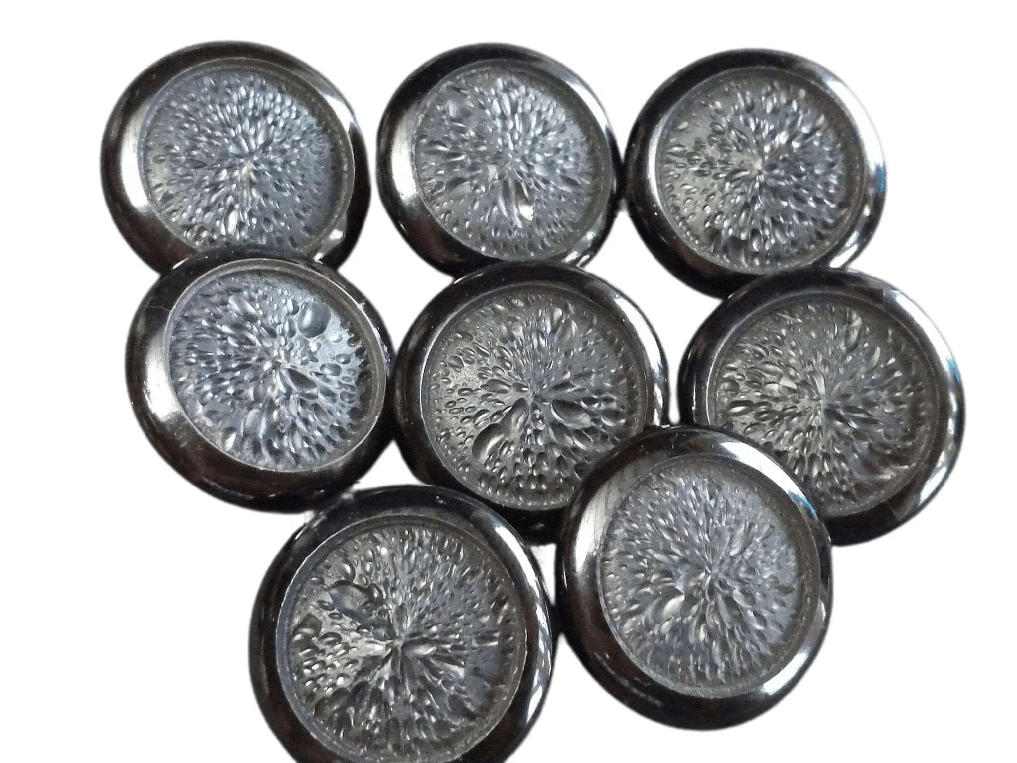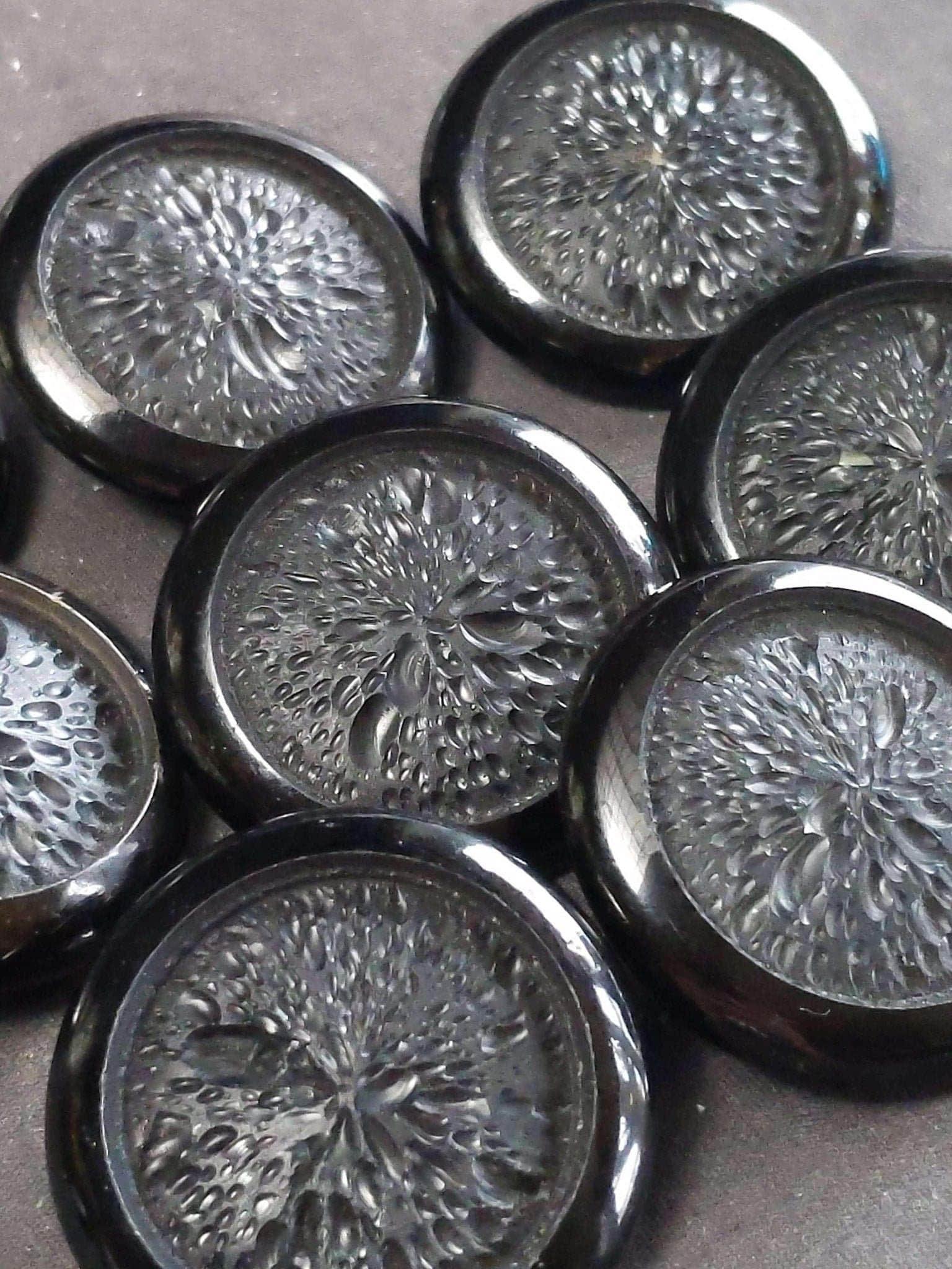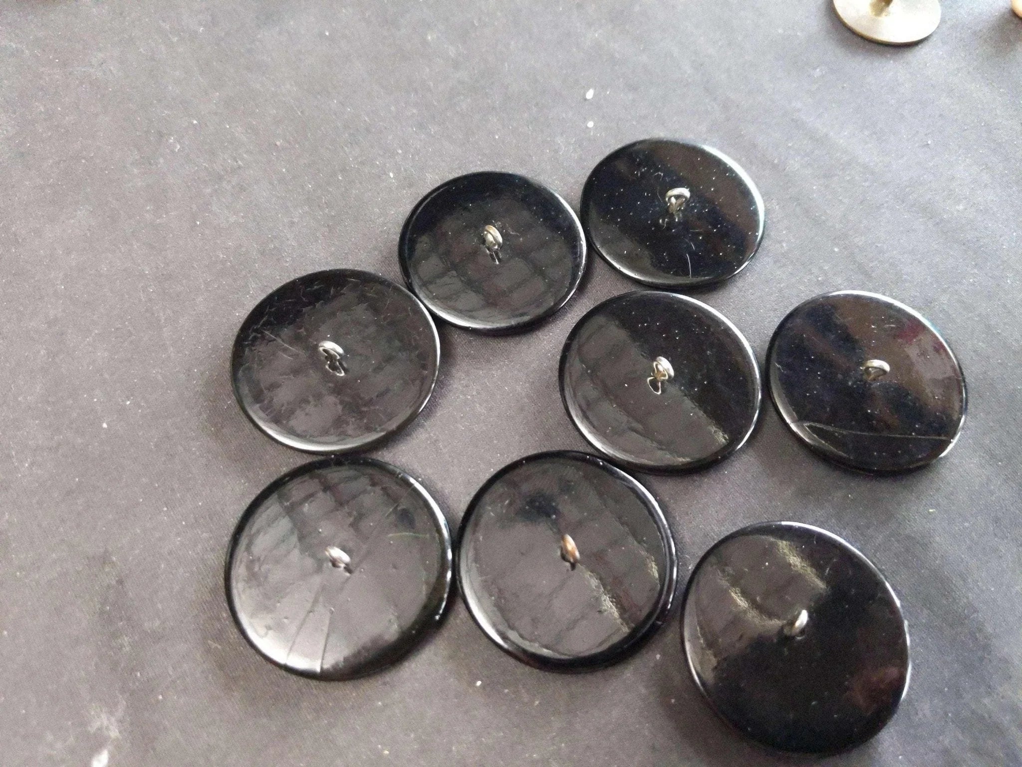 c1940 Carved Wood Enamel Large Coat Button Set (6) 1 3/8" wide guaranteed<br>vintage circa 1900's-1940's. There are a few cracks in the enamel only really<br>visible from the back. Part of a huge cache of buttons dating from 19th century<br>to mid 20th.