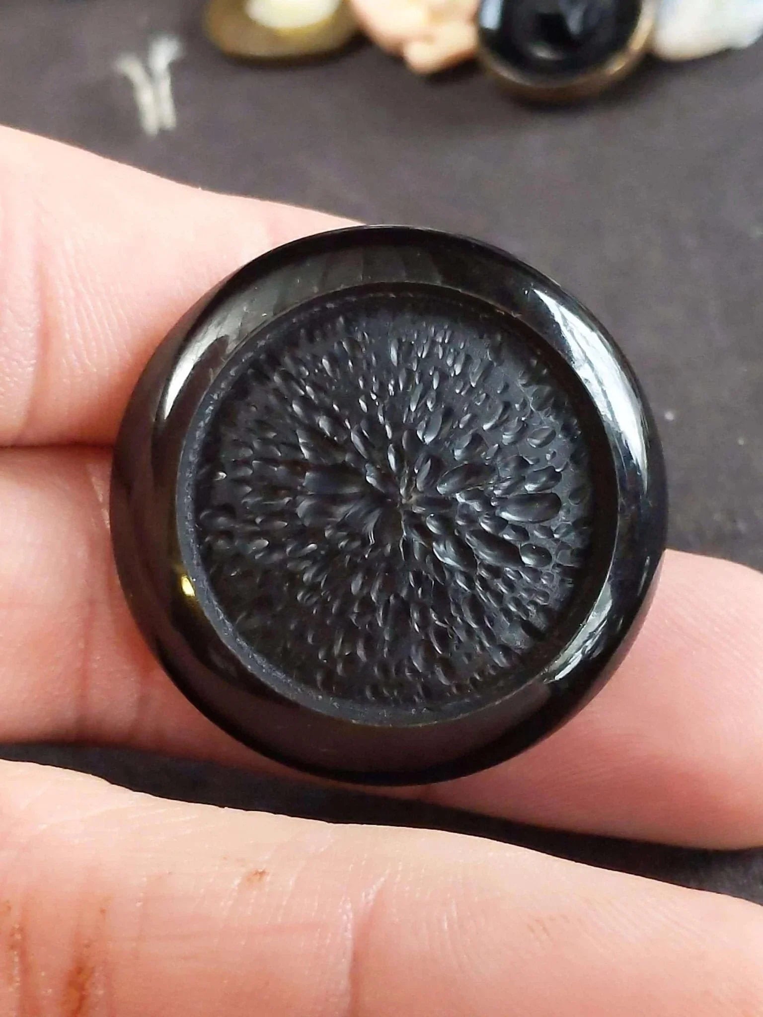 c1940 Carved Wood Enamel Large Coat Button Set (6) 1 3/8"