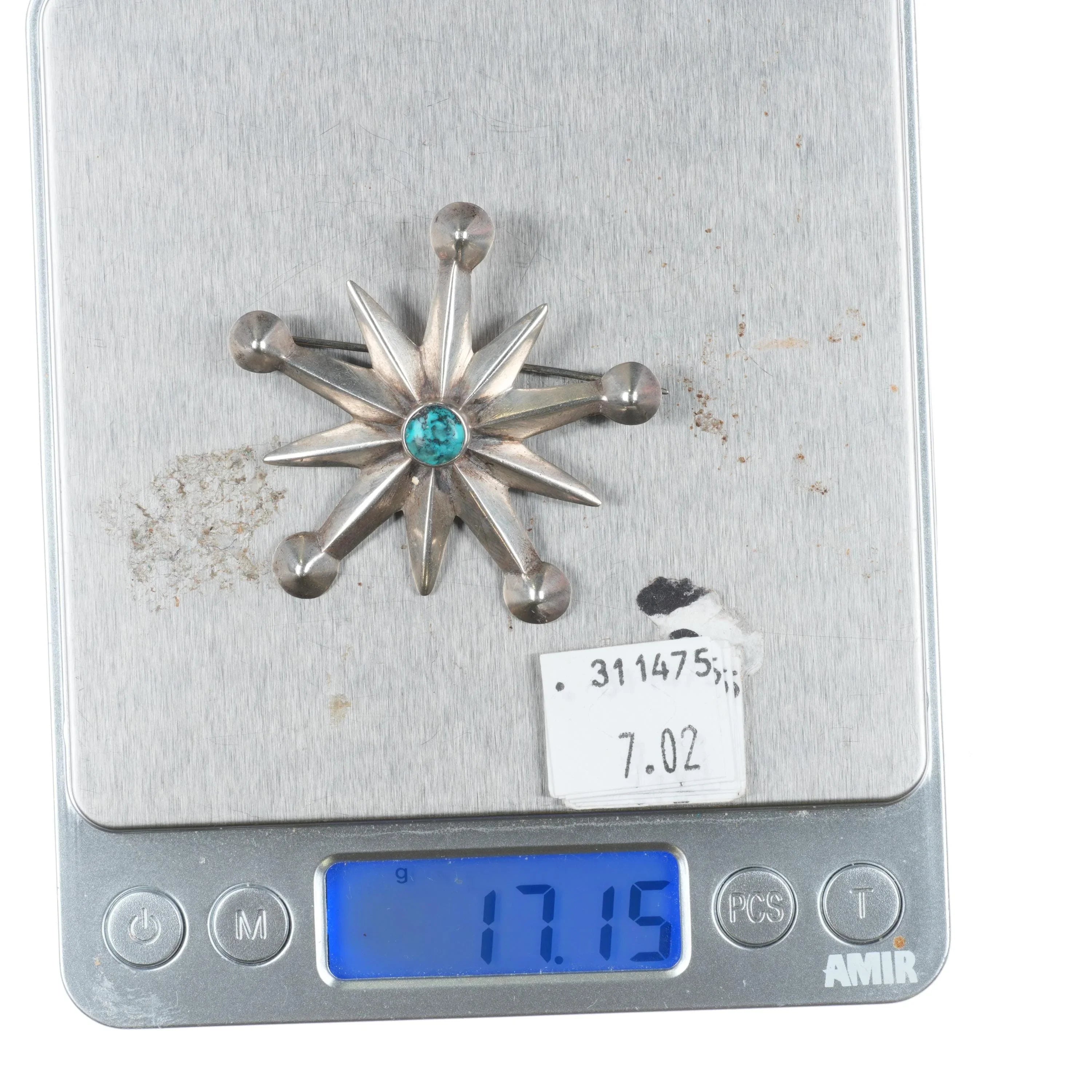 c1950‘s Vintage Native American sterling silver cast star pin/brooch w/turquoise. Weight and measurements in pics, all solid sterling. Tested and guaranteed solid sterling silver. Circa mid 20th century. Unmarked as is common with Native American silver jewelry of this era.