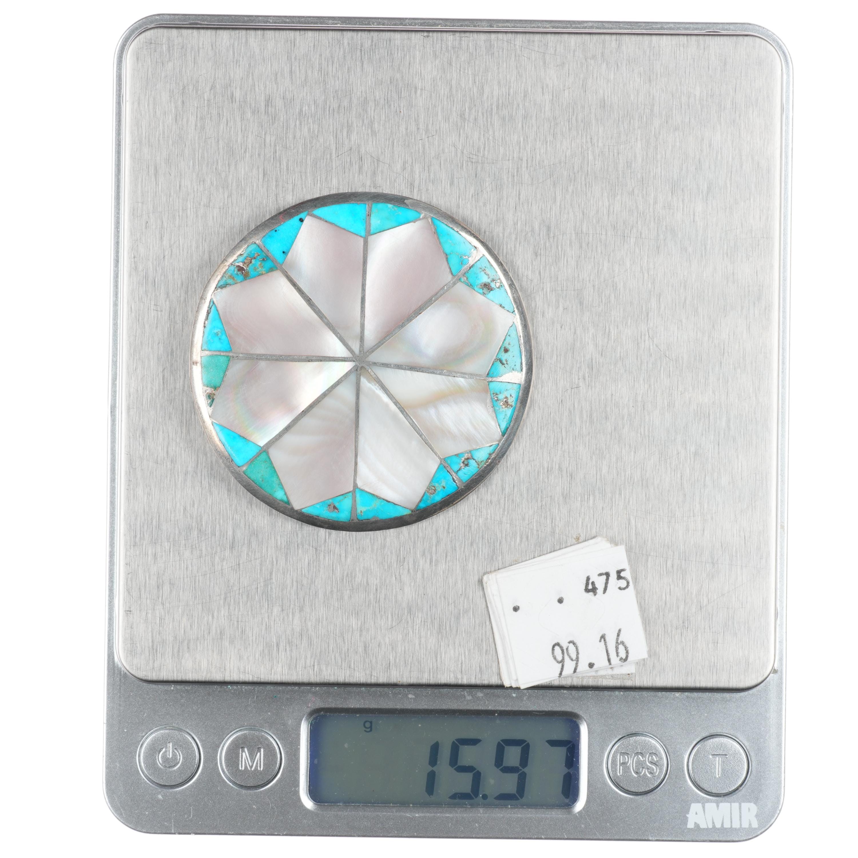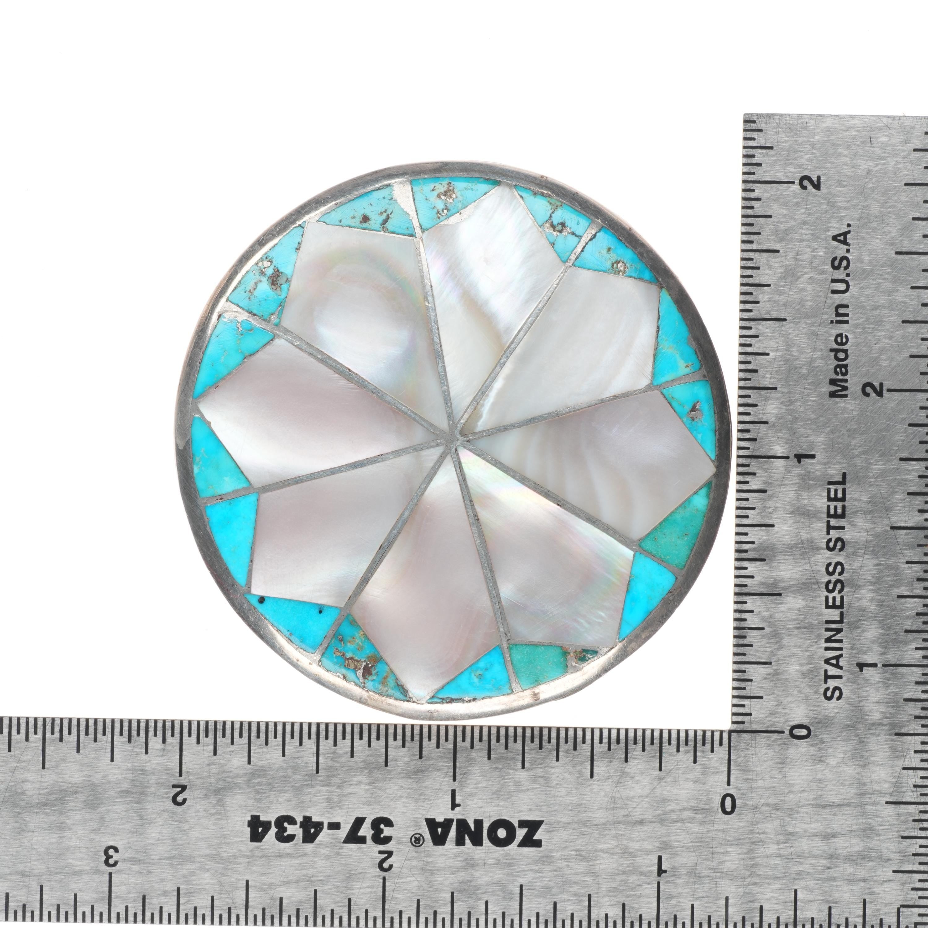 c1950's Vintage Zuni sterling silver turquoise/mother of pearl inlay pin/brooch