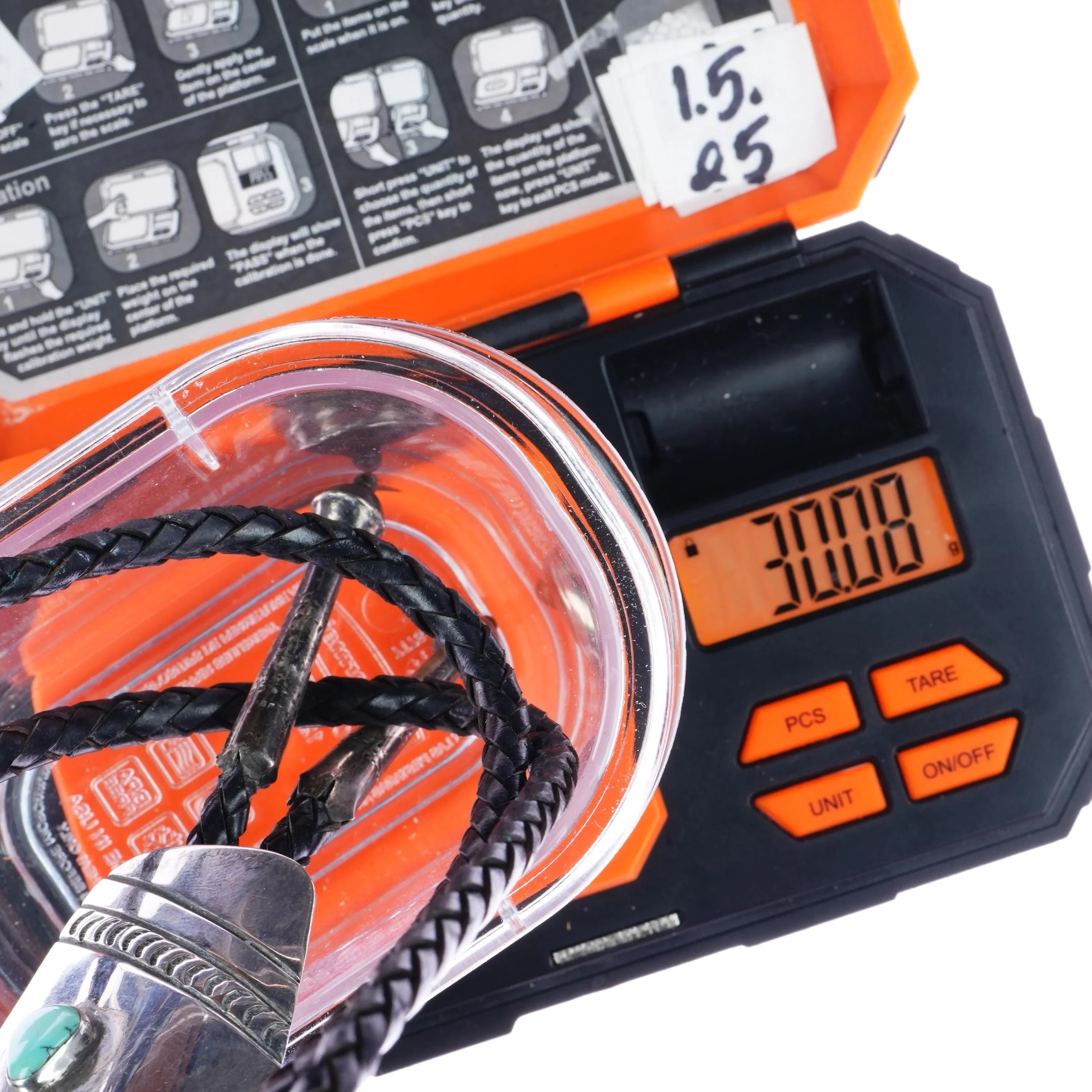 c1960 c-31 Navajo sterling and turquoise bolo slide with slanted stamped design. Solid sterling, weight and measurements in pics (scale tared out with containter, weight shown is just the bolo). Fully functional with overall attractive appearance. Sterling tips and bolo slide. 36" total length, No apparent markings.