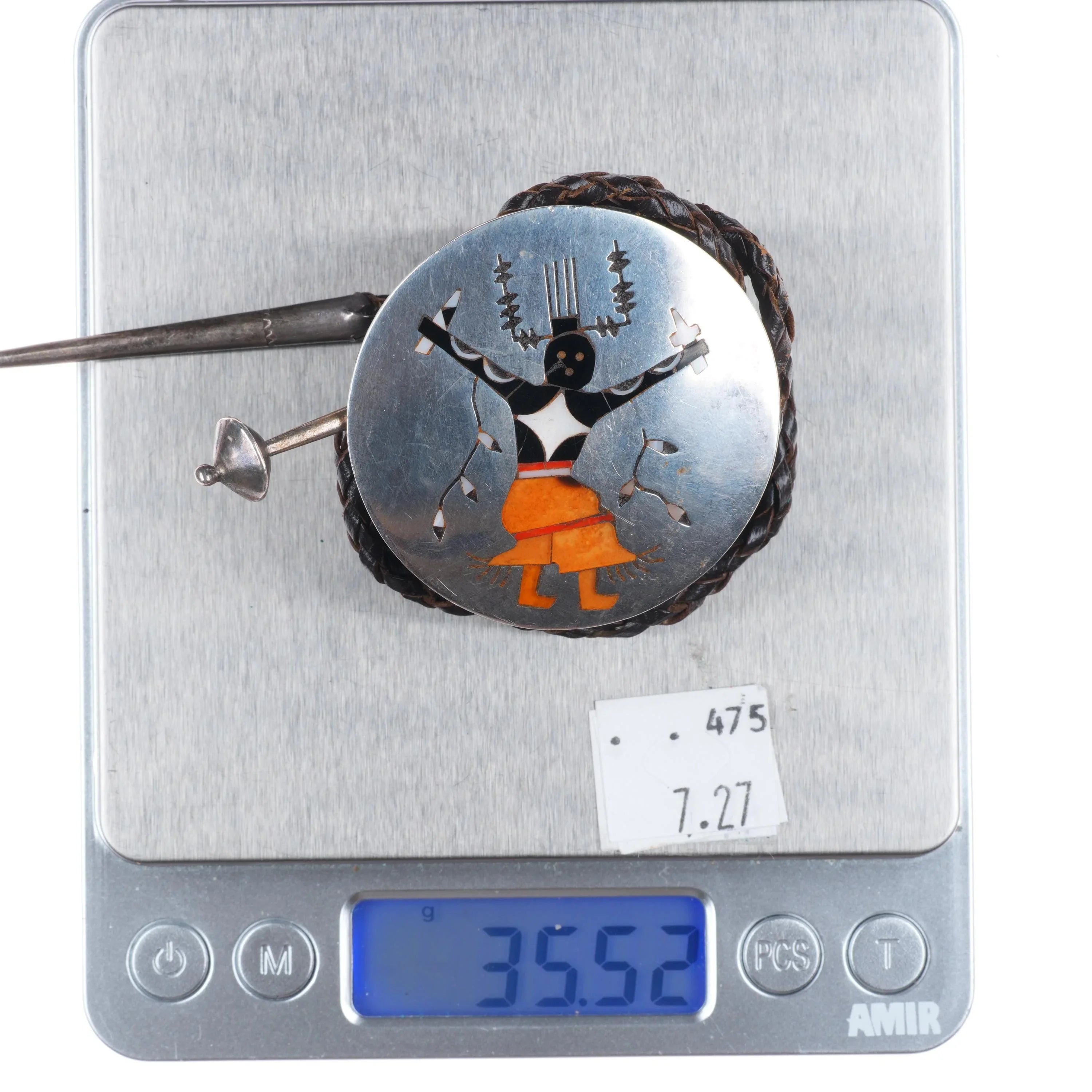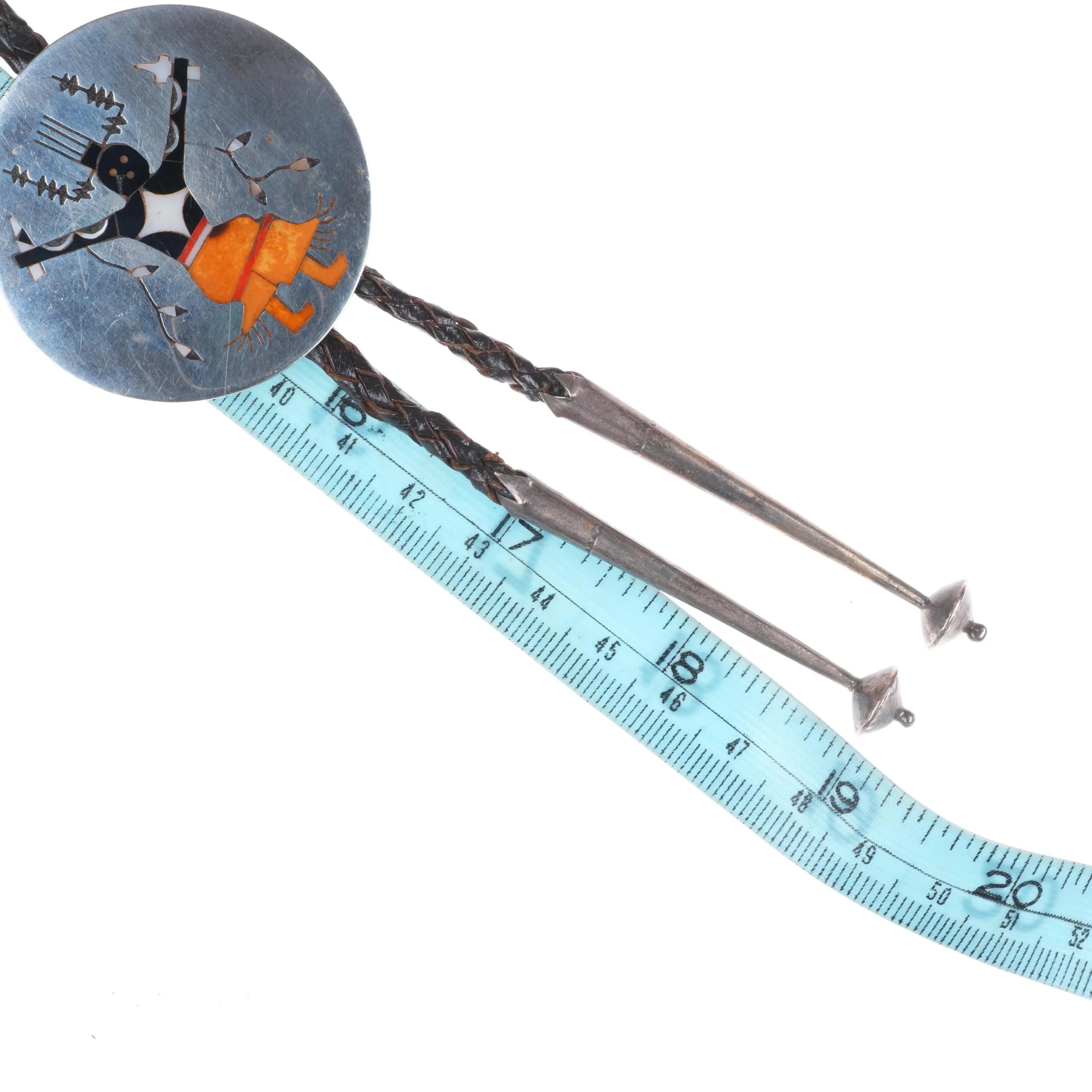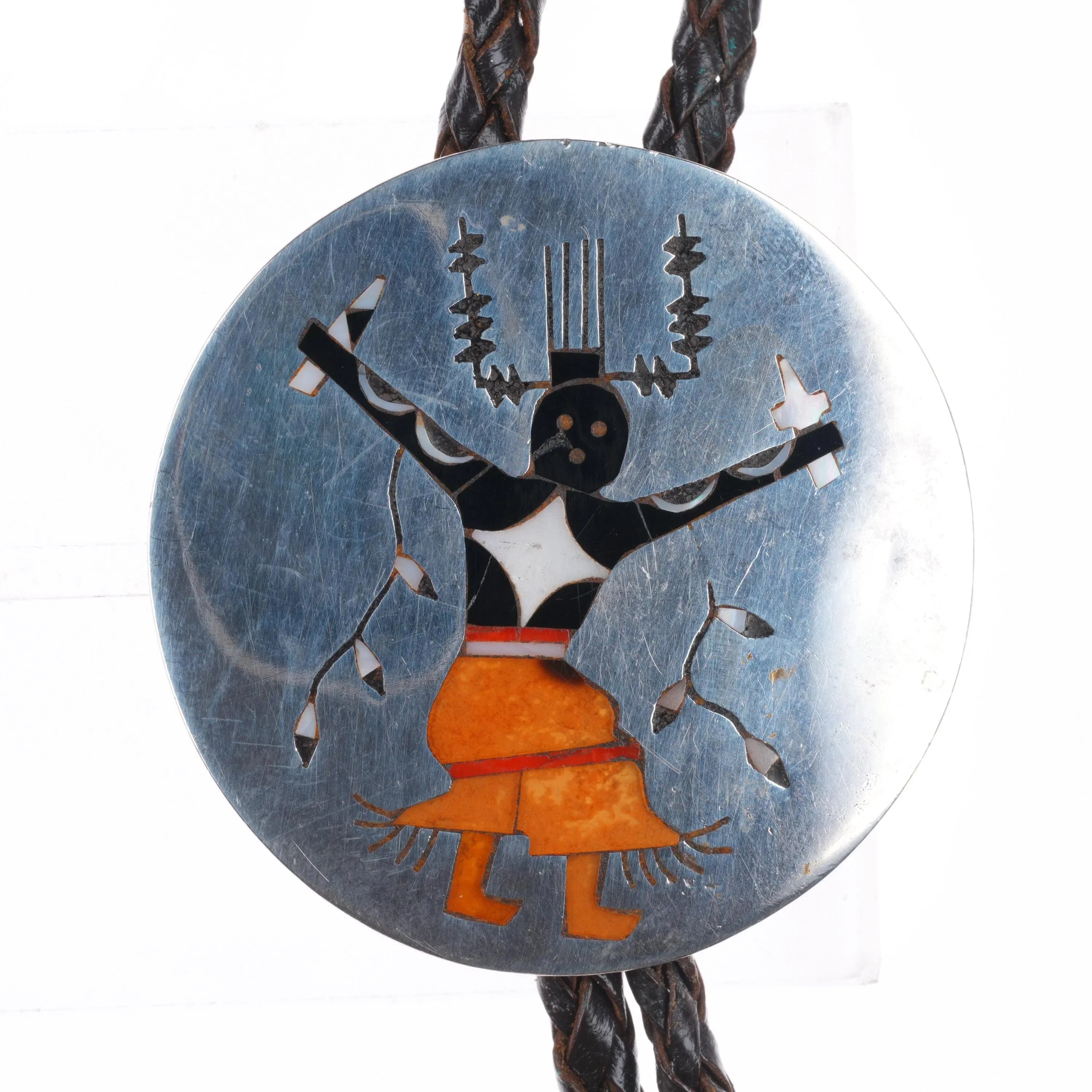 c1960 c-31 Zuni Apache dancer kachina sterling silver inlaid bolo tie L.N.. Tested and guaranteed solid sterling silver slide and tips. Weight and measurements in pictures. Great bolo, 39" long with no issues. Tray is tared out, so weight shown is just the bolo of course. High quality, unmarked, unknown maker. I am not sure who L.N. is, but they did this type of work, very clean work but not very prolific.