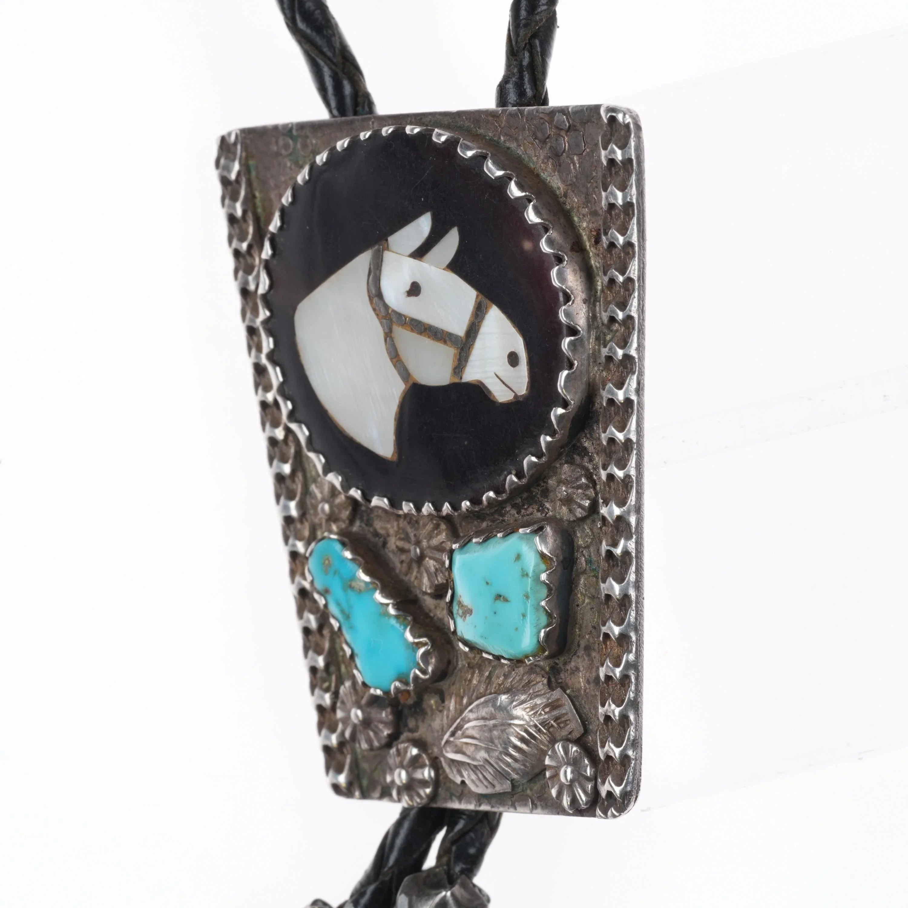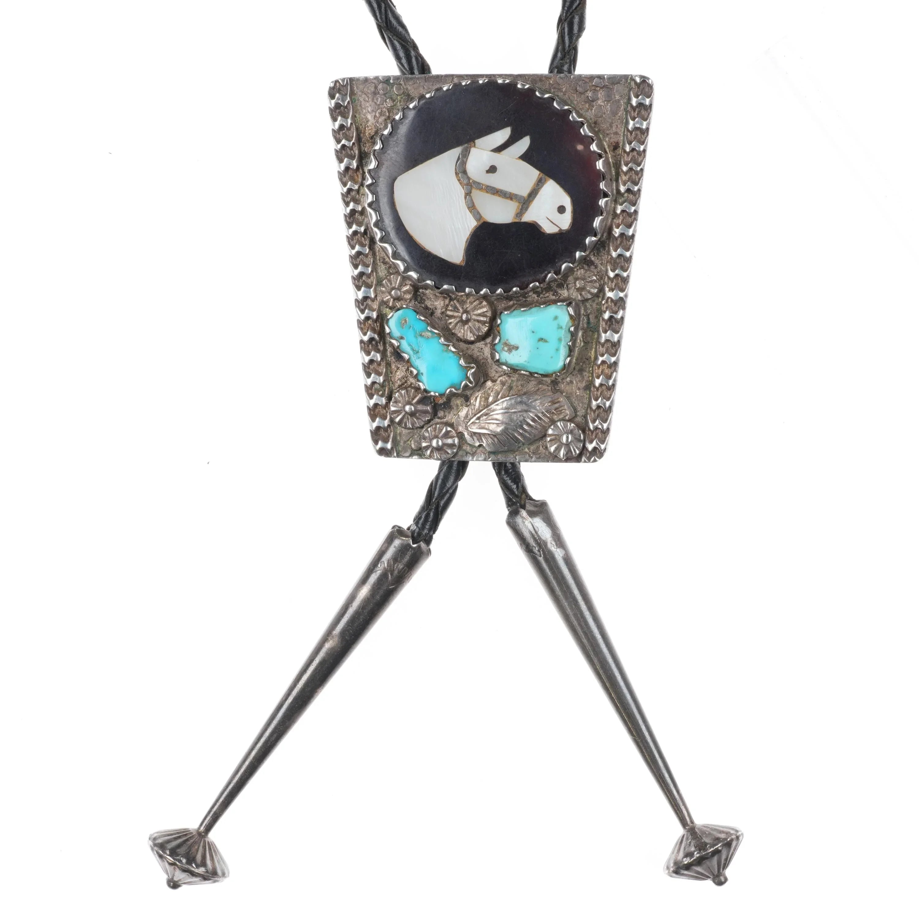 c1970 Isabelle Simplicio Zuni sterling silver, turquoise, horse inlay bolo tie