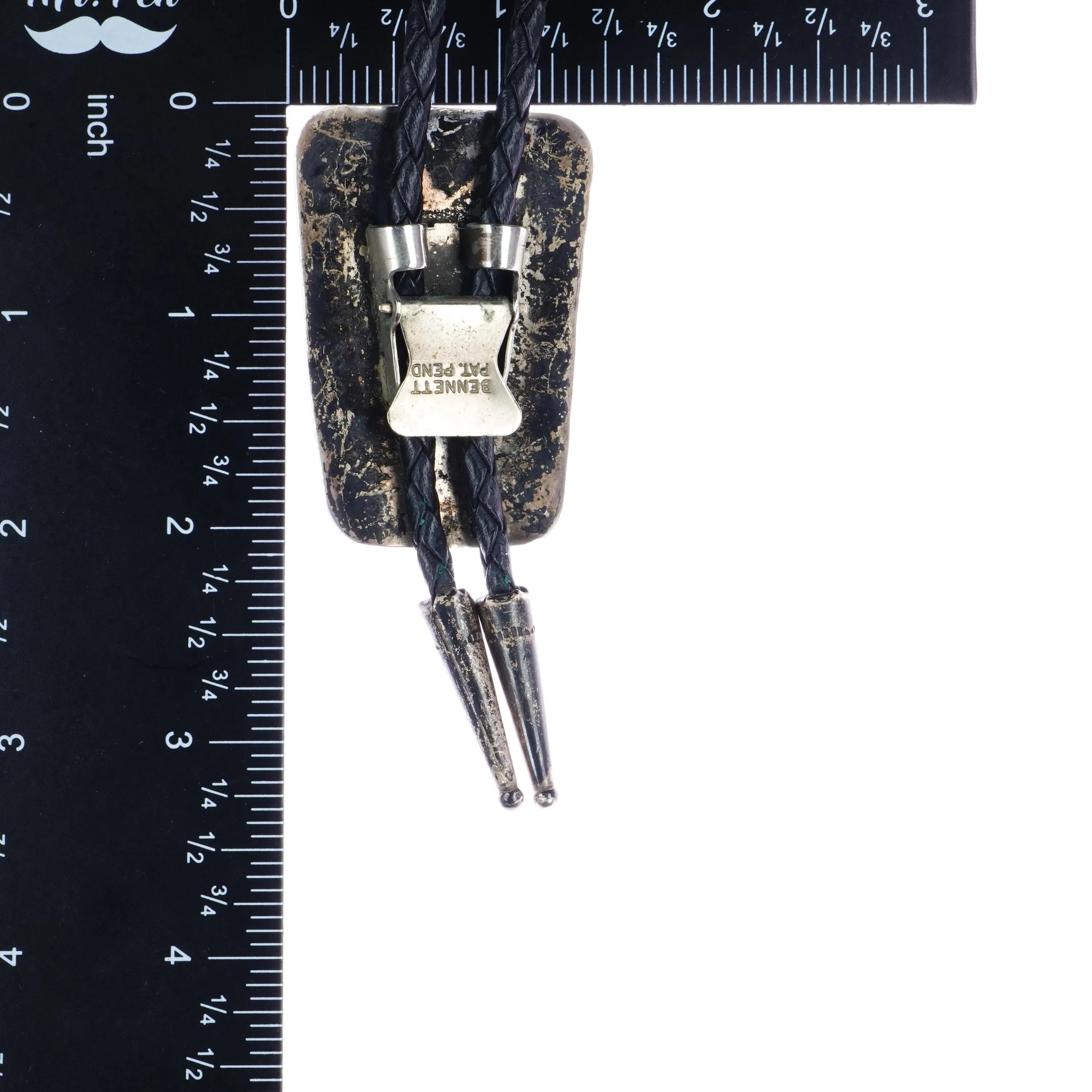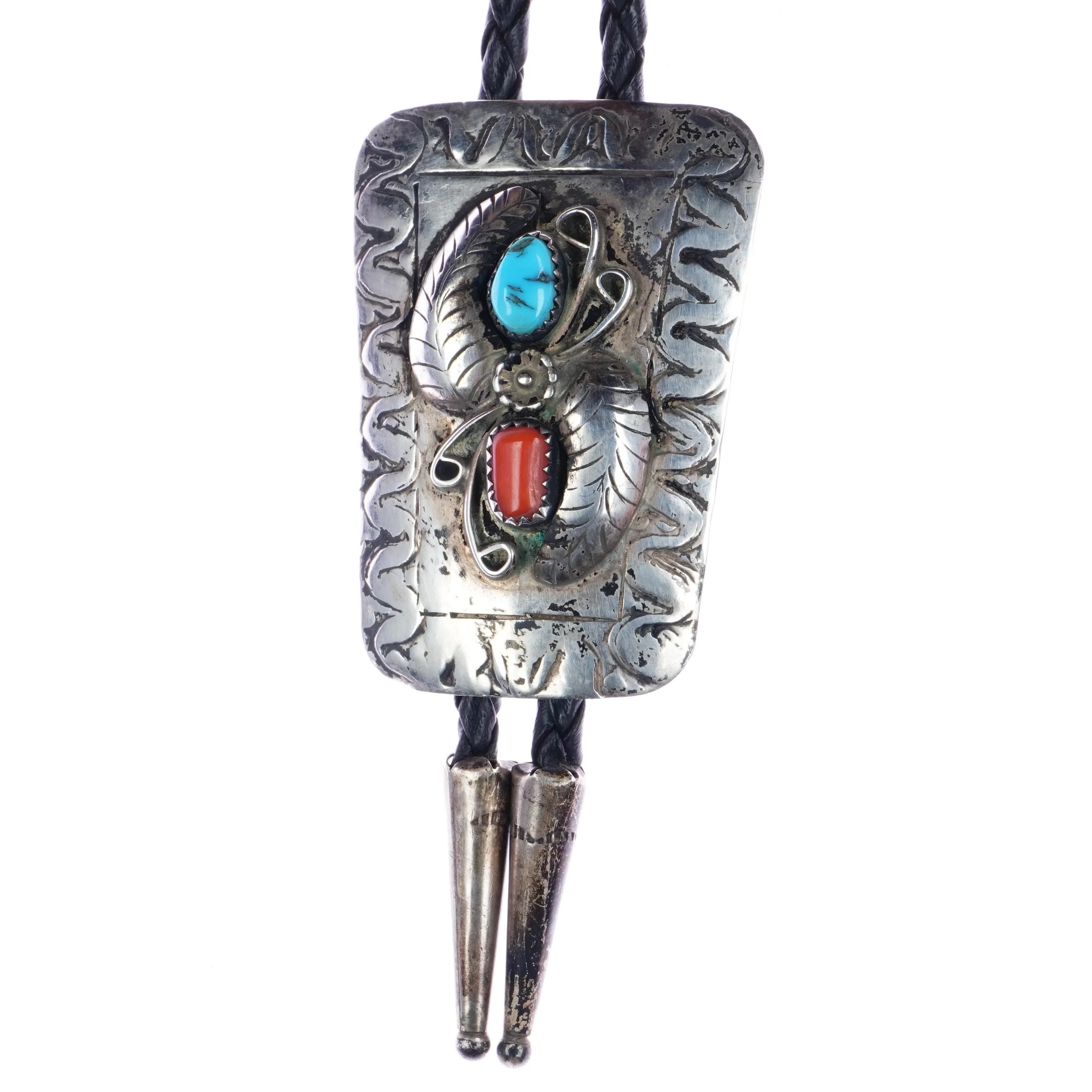 c1970 Navajo sterling turquoise, and coral feather design bolo tie