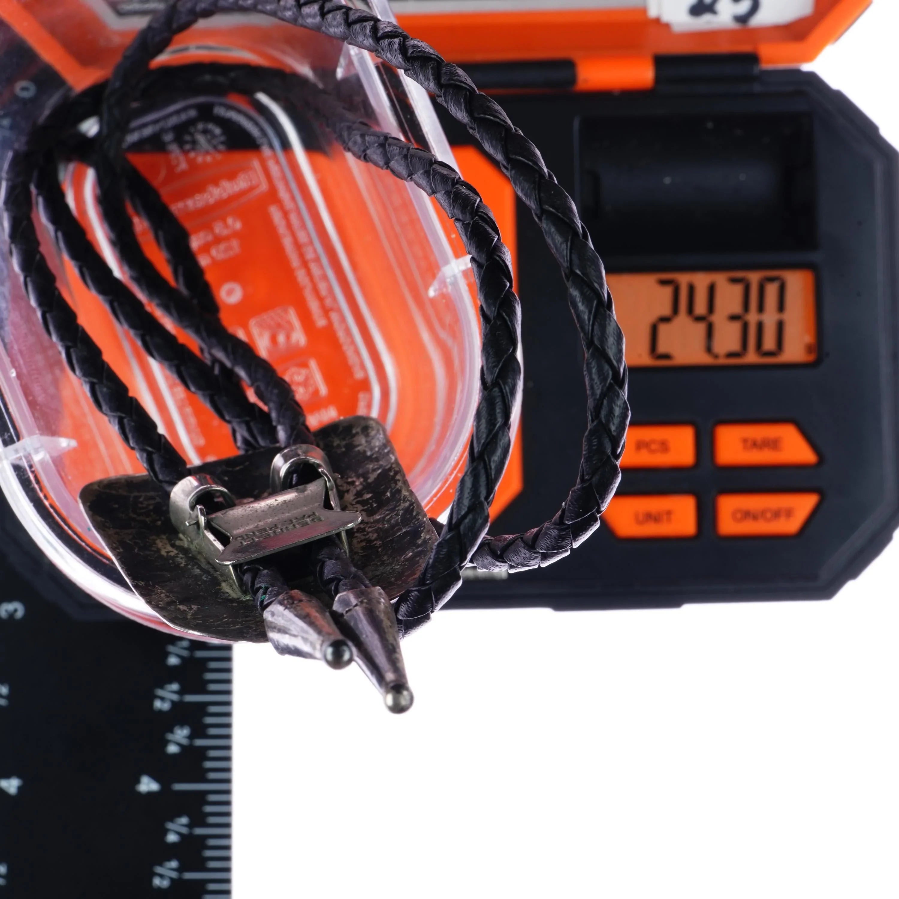 c1970 Navajo sterling turquoise, and coral feather design bolo tie. Solid sterling, weight and measurements in pics (scale tared out with containter, weight shown is just the bolo). No damage, sterling tips and bolo slide. 35" total length, unmarked.