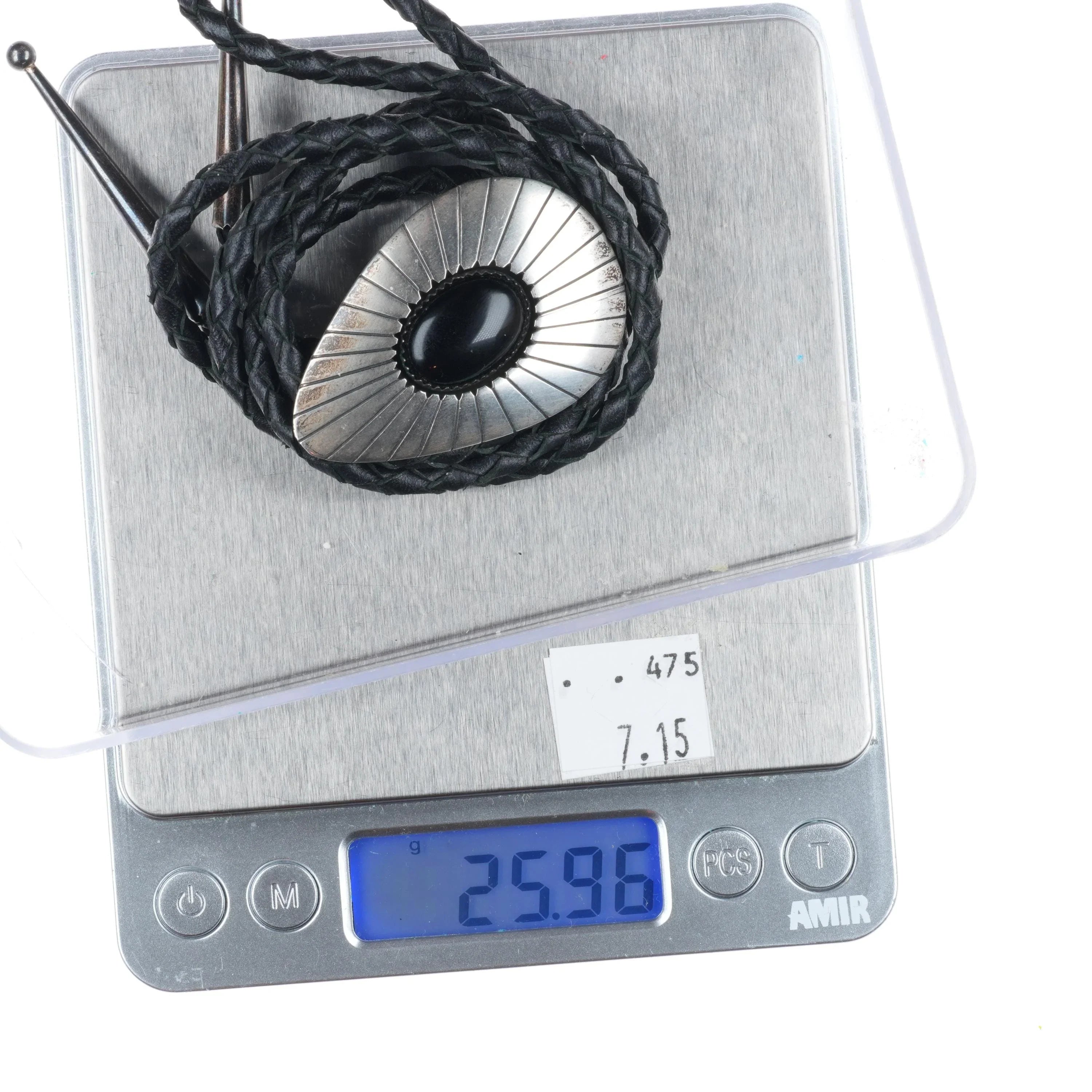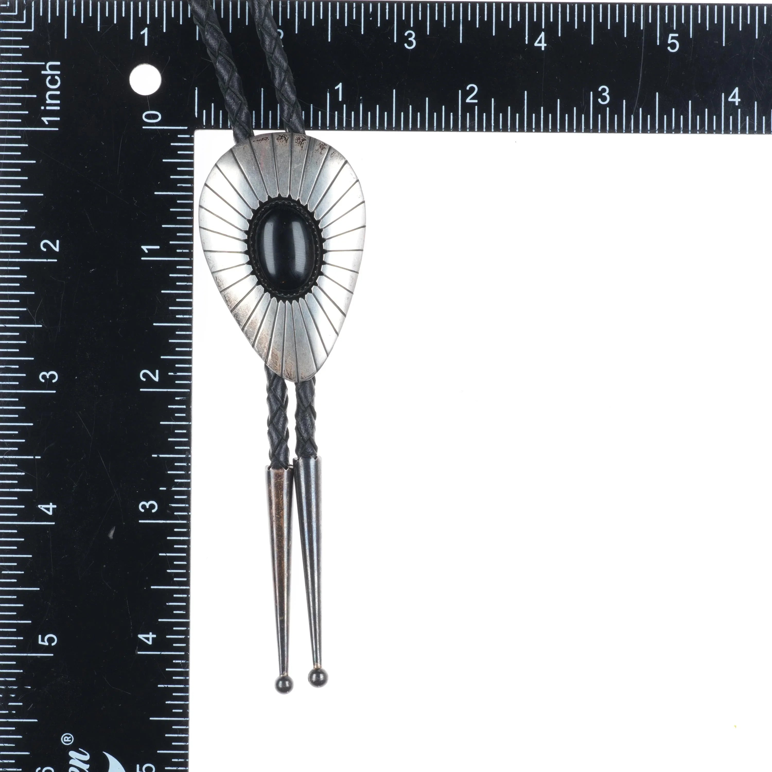 c1980 Vintage TN Navajo shadowbox sterling silver onyx bolo tie. Tested and guaranteed solid sterling silver slide and tips. Weight and measurements in pictures. Great bolo, 37" long with no issues. Tray is tared out, so weight shown is just the bolo of course. unmarked.