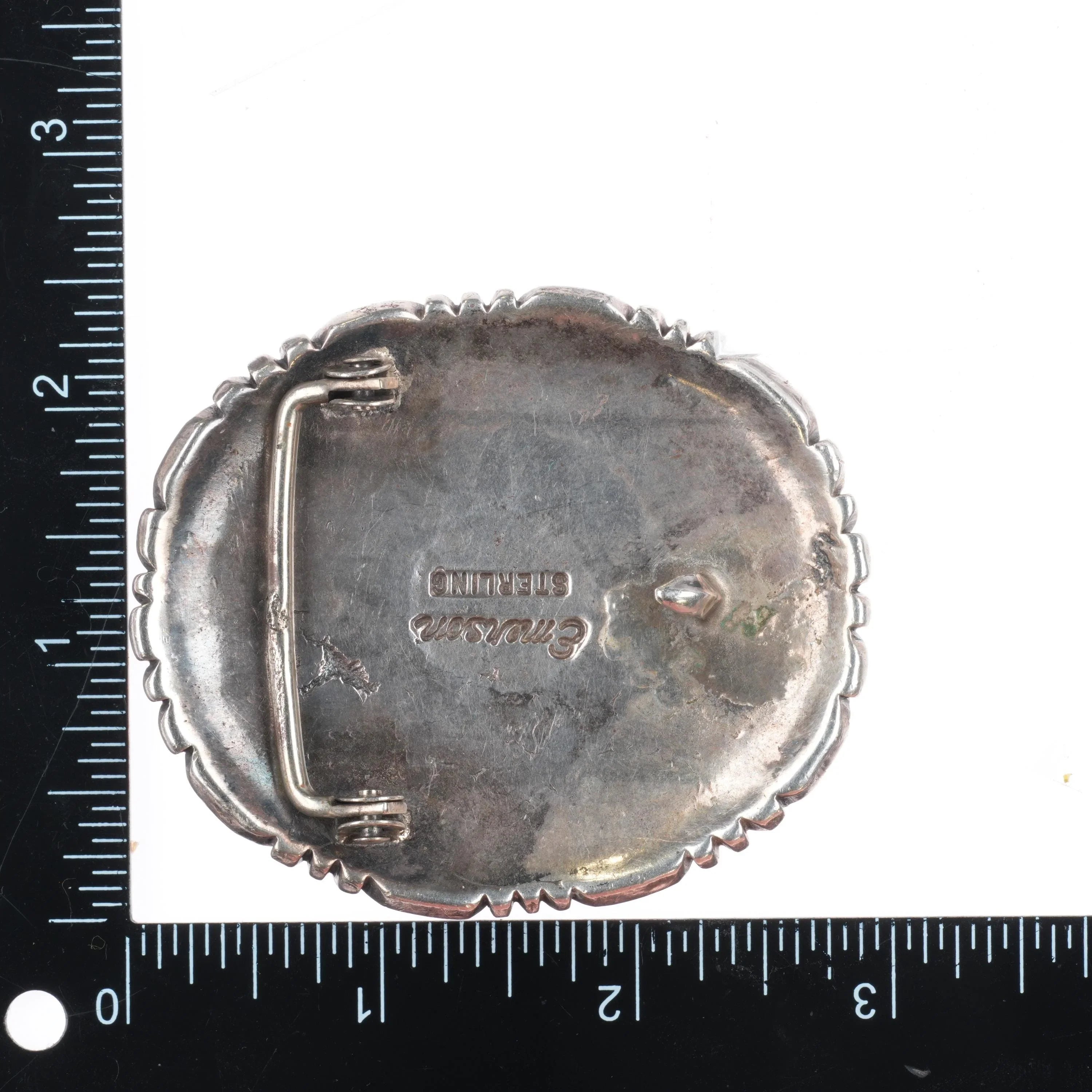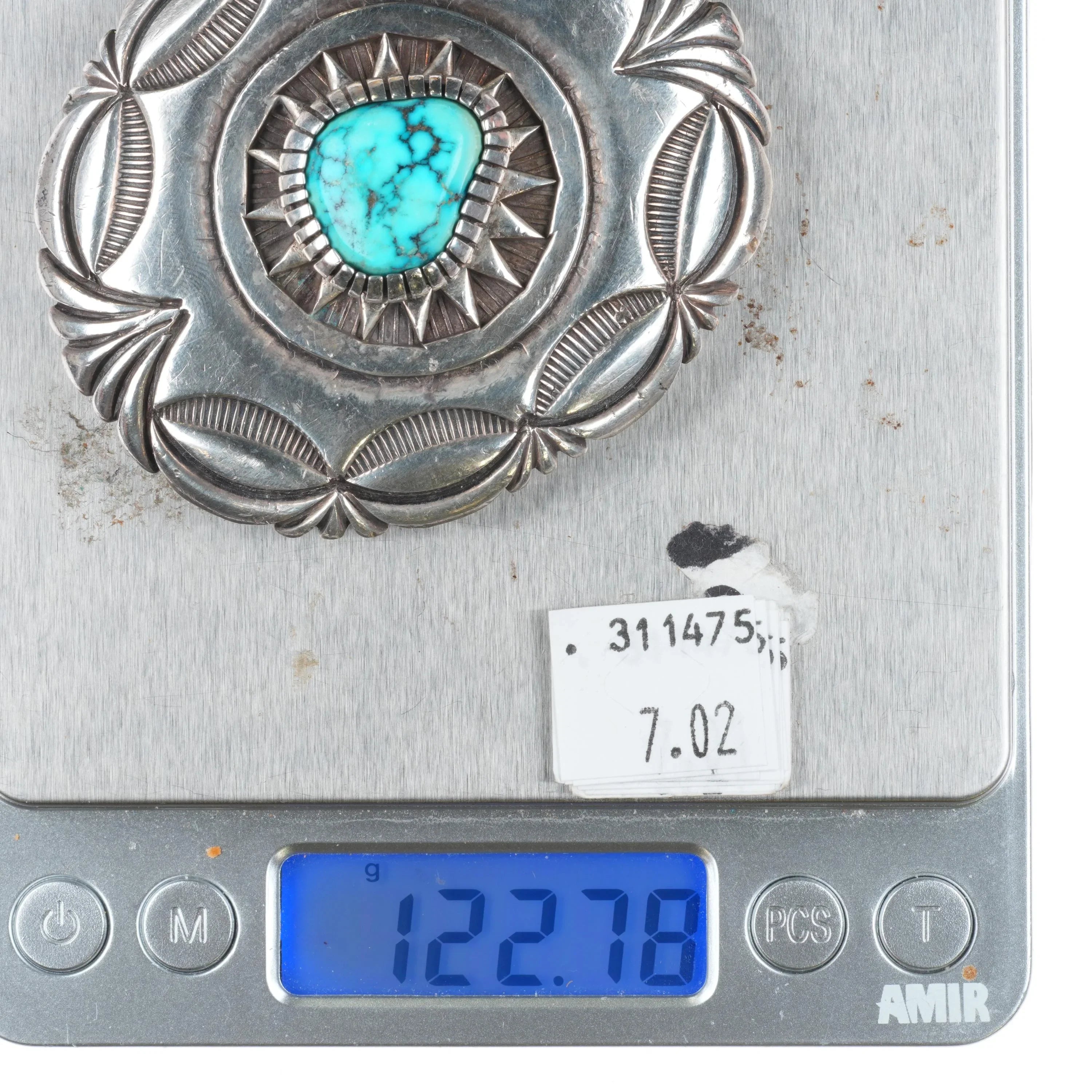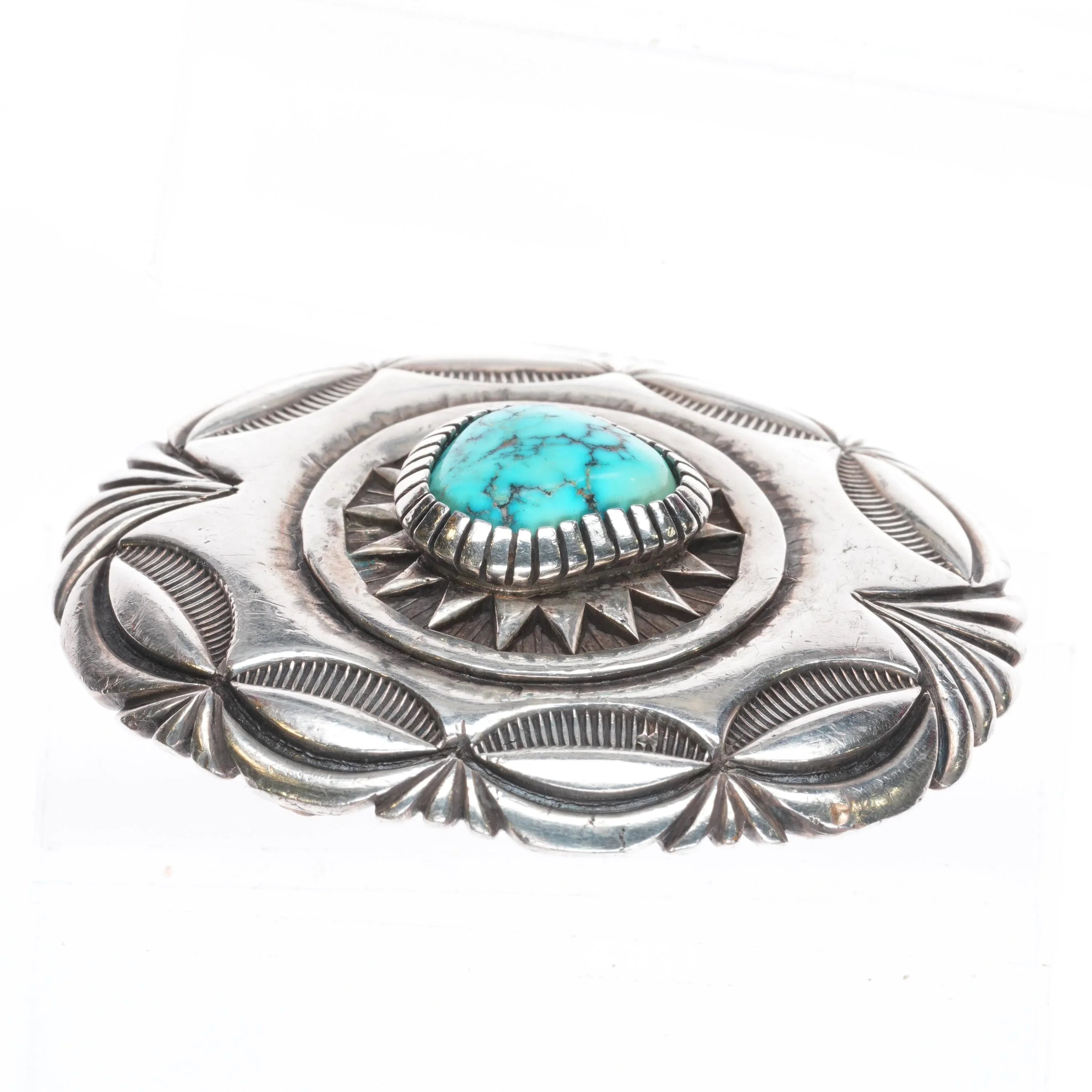 Emerson Bill Navajo Deep stamped sterling silver hi-grade turquoise belt buckle. Tested and guaranteed solid sterling silver, high grade natural American turquoise. Fits up to a 1.5" wide belt. Some expected wear. Good condition, functional with no damage or unsightly wear..