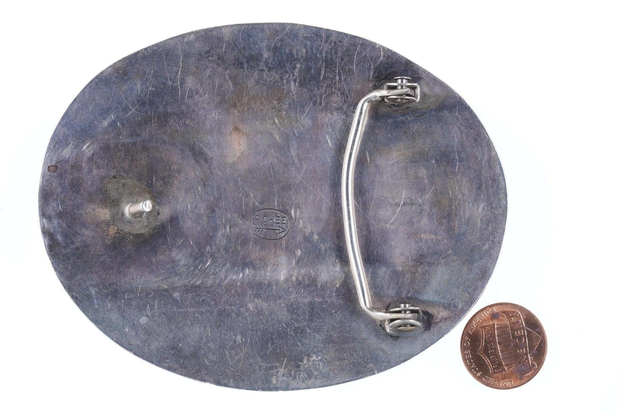 Large 1964 Native American sterling/turquoise Silver half dollar belt buckle. 4" x 3 1/8", takes up to a 1.75" belt. 110.3 grams. Tested sterling by the Navajo artist R Chee.