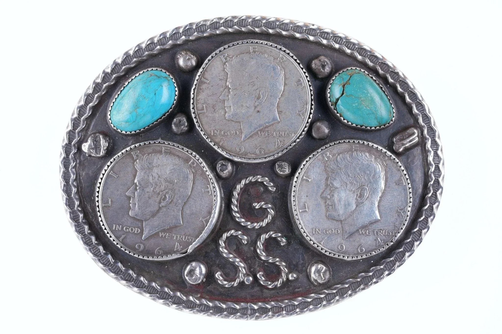 Large 1964 Native American sterling/turquoise Silver half dollar belt buckle