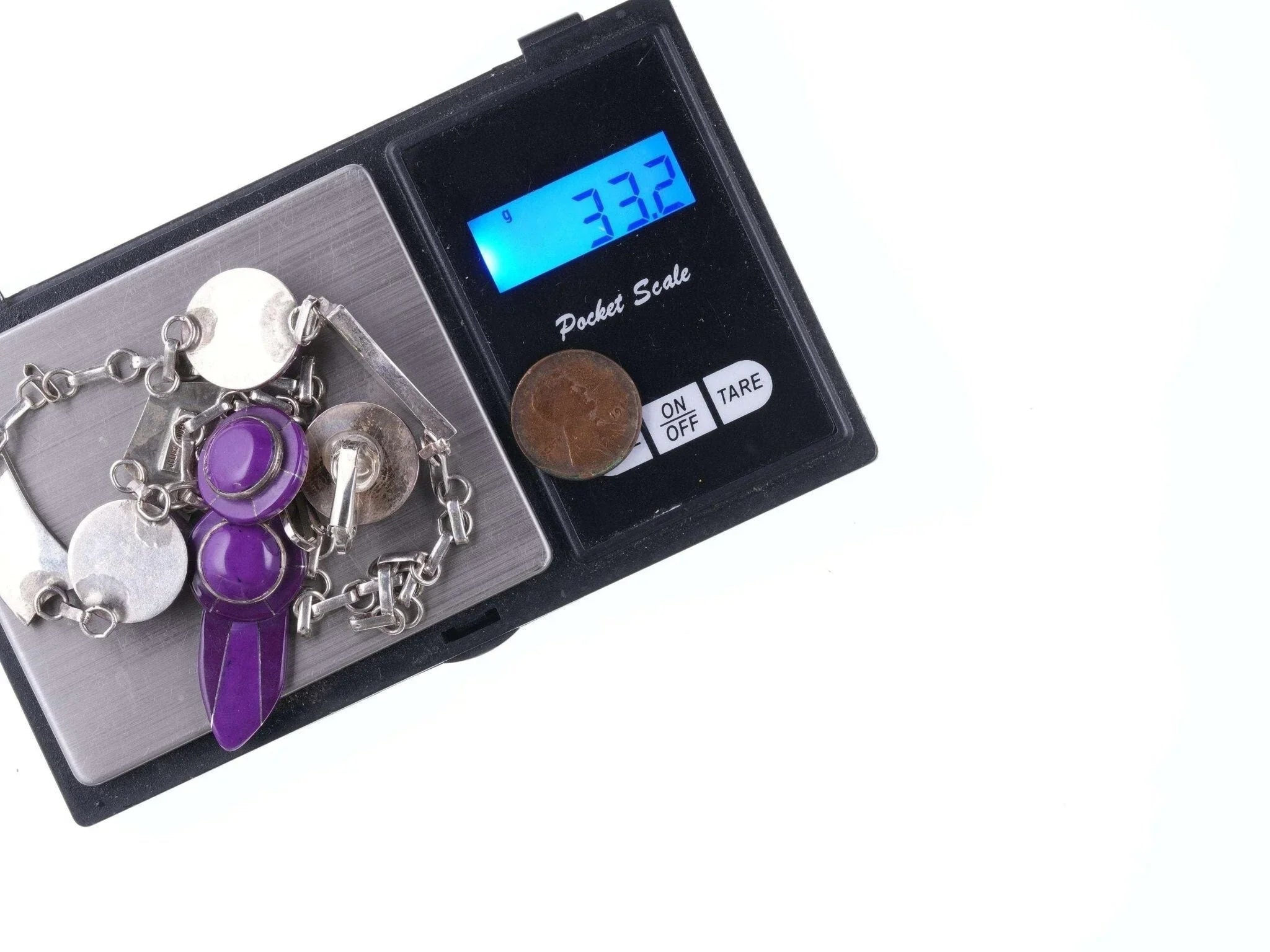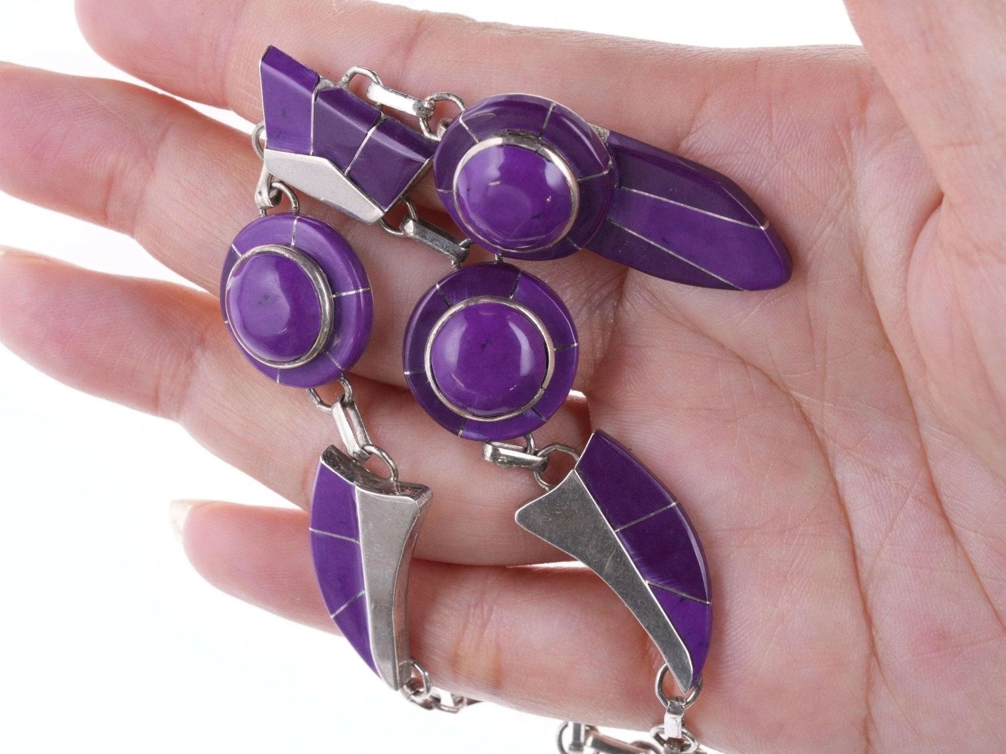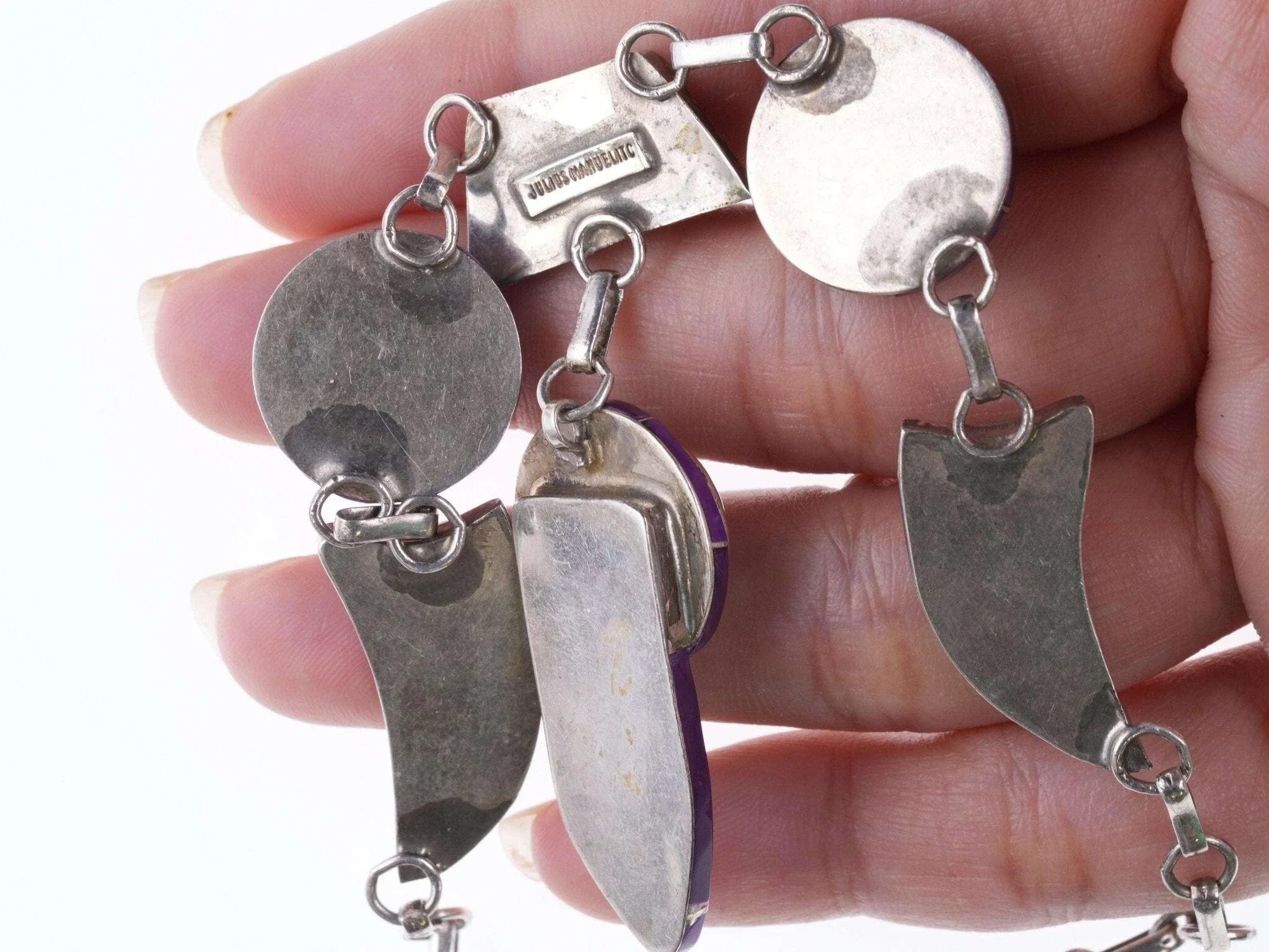 Julius Manuelito Southwestern Sterling purple stone channel inlay necklace and<br>earrings. 16" necklace, .75" earrings without clips. Strong clips with no<br>issues. I'm unsure what the stones are but it's a great looking set with no<br>issues.<br><br>All precious metals are tested and guaranteed, any Native American jewelry<br>referred to as Silver or Sterling is guaranteed to be a minimum of 90% (coin)<br>silver and possibly higher content. Most cuff bracelets are shown photographed<br>on a 6" woman's wrist and will include a photo showing the inside circumference<br>where the metal tip meets the number on the tape measure.