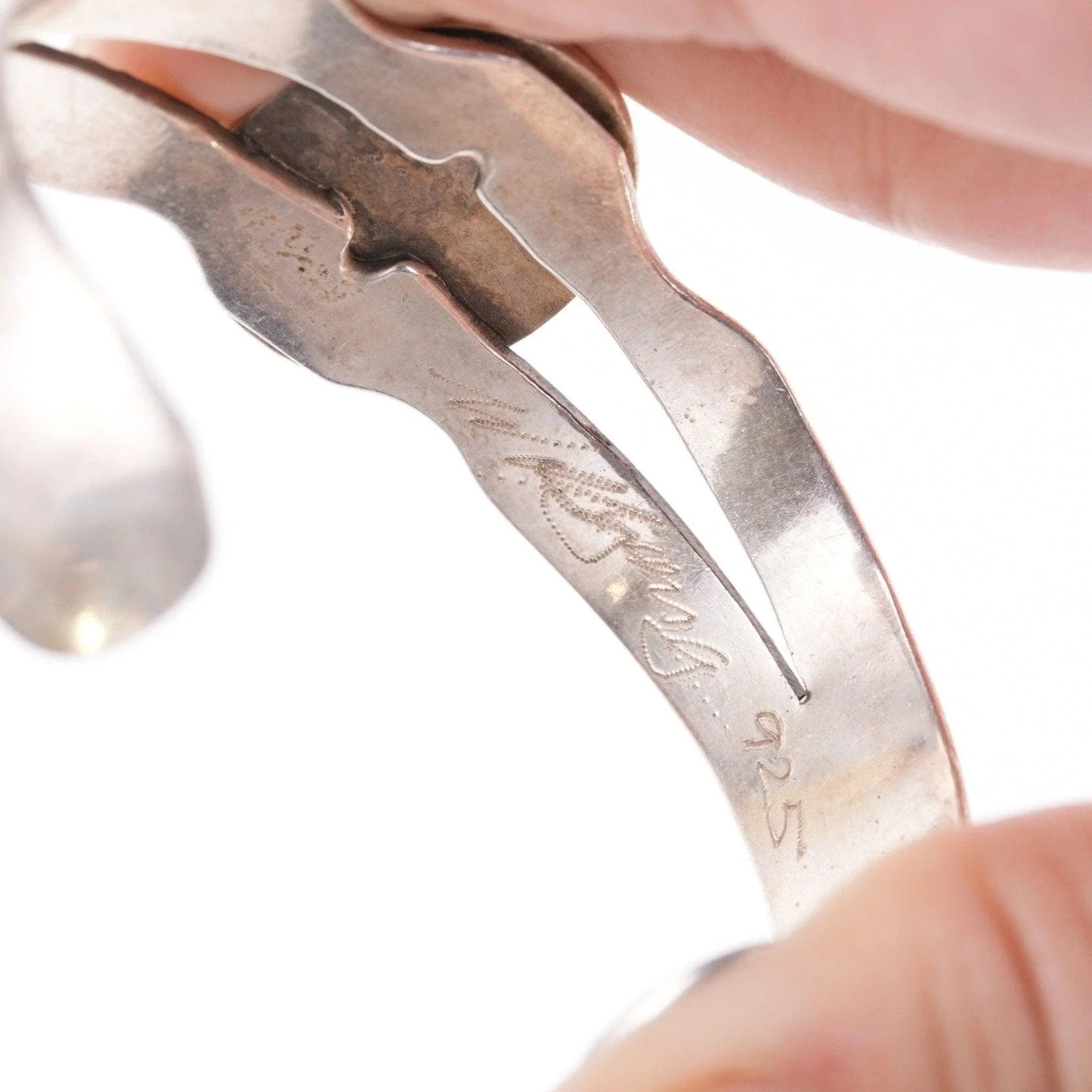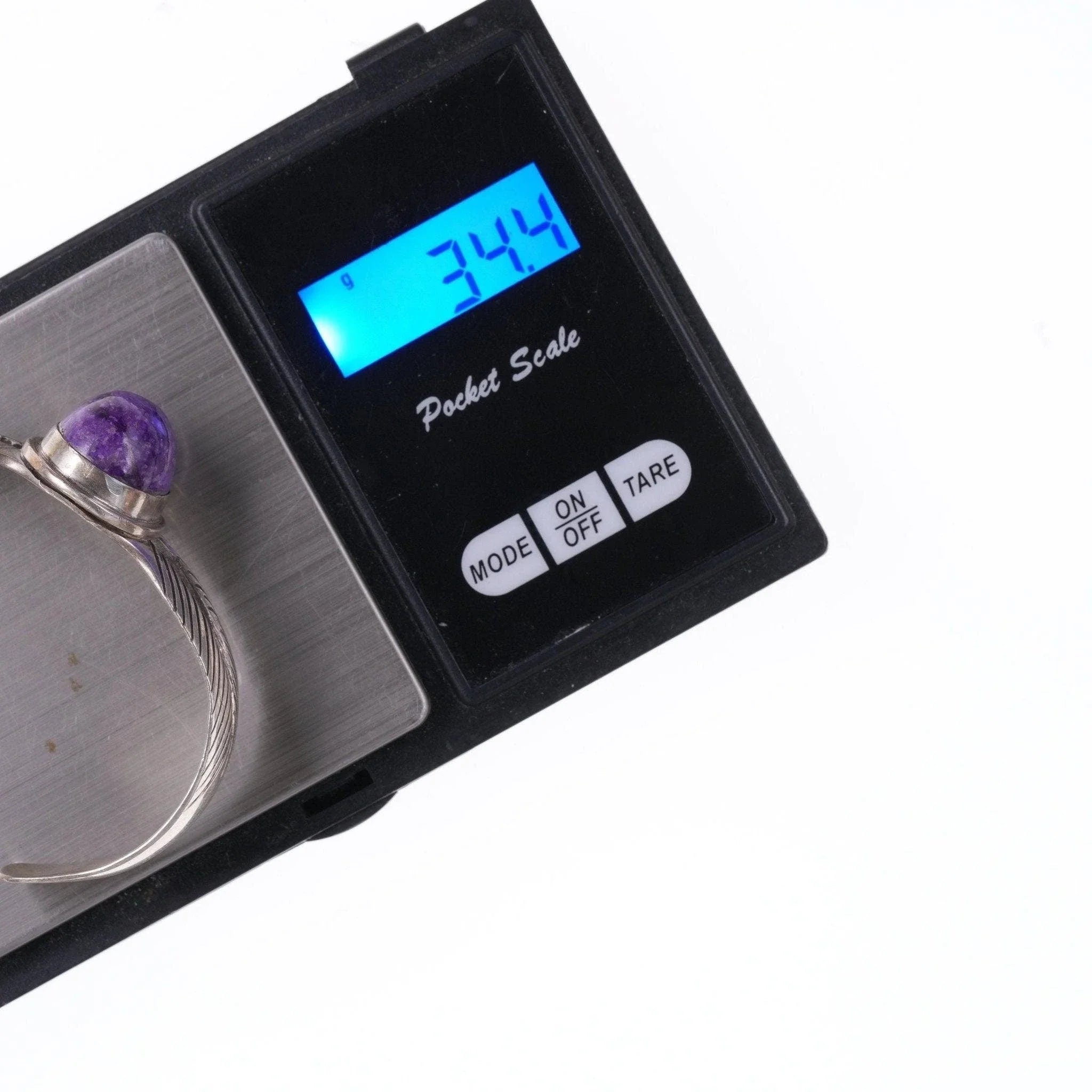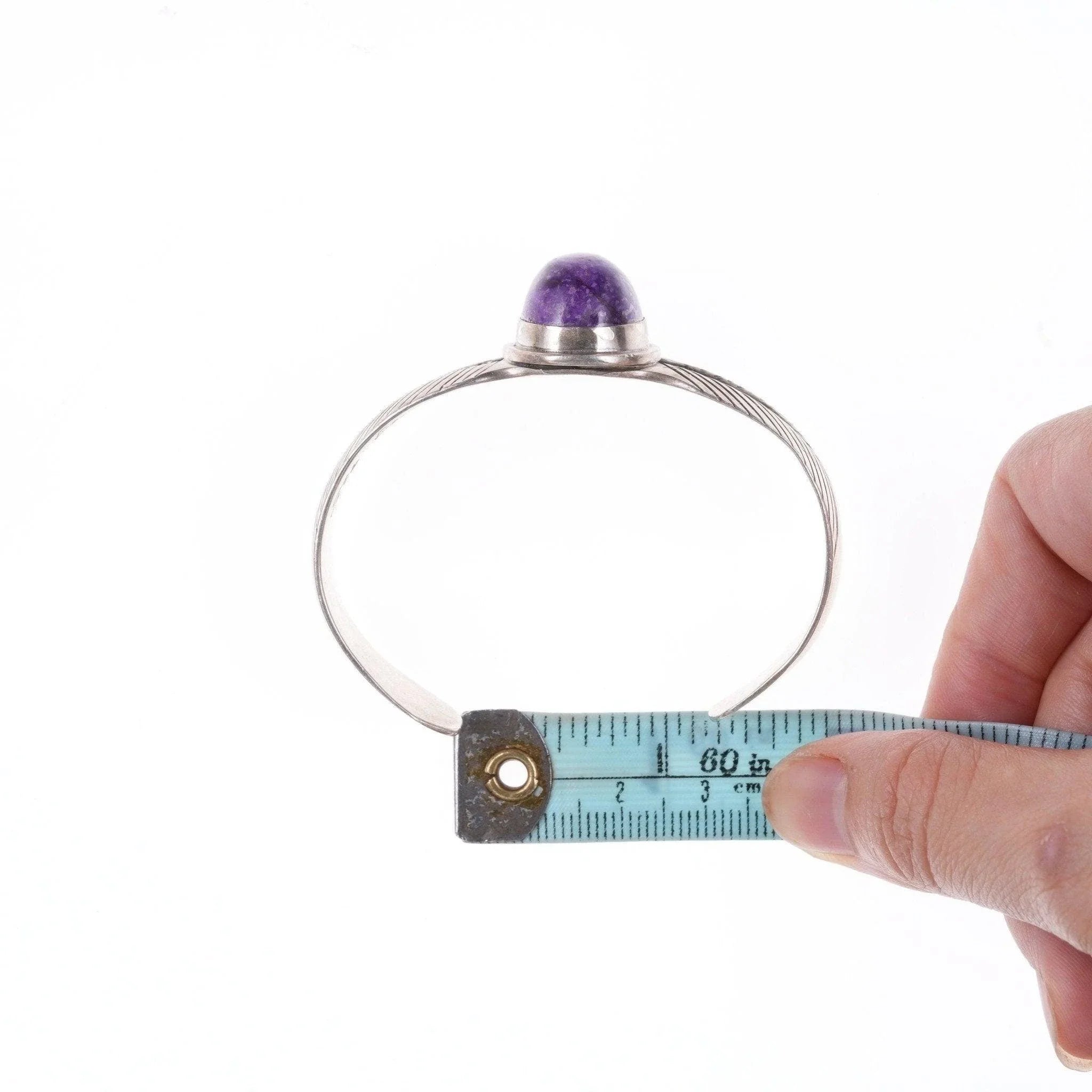 1980's Wolfgang Southwestern Sterling silver charoite bracelet Fits up to a 6<br>3/8" wrist.<br><br>All precious metals are tested and guaranteed, any Native American jewelry<br>referred to as Silver or Sterling is guaranteed to be a minimum of 90% (coin)<br>silver and possibly higher content. Most cuff bracelets are shown photographed<br>on a 6" woman's wrist and will include a photo showing the inside circumference<br>where the metal tip meets the number on the tape measure.