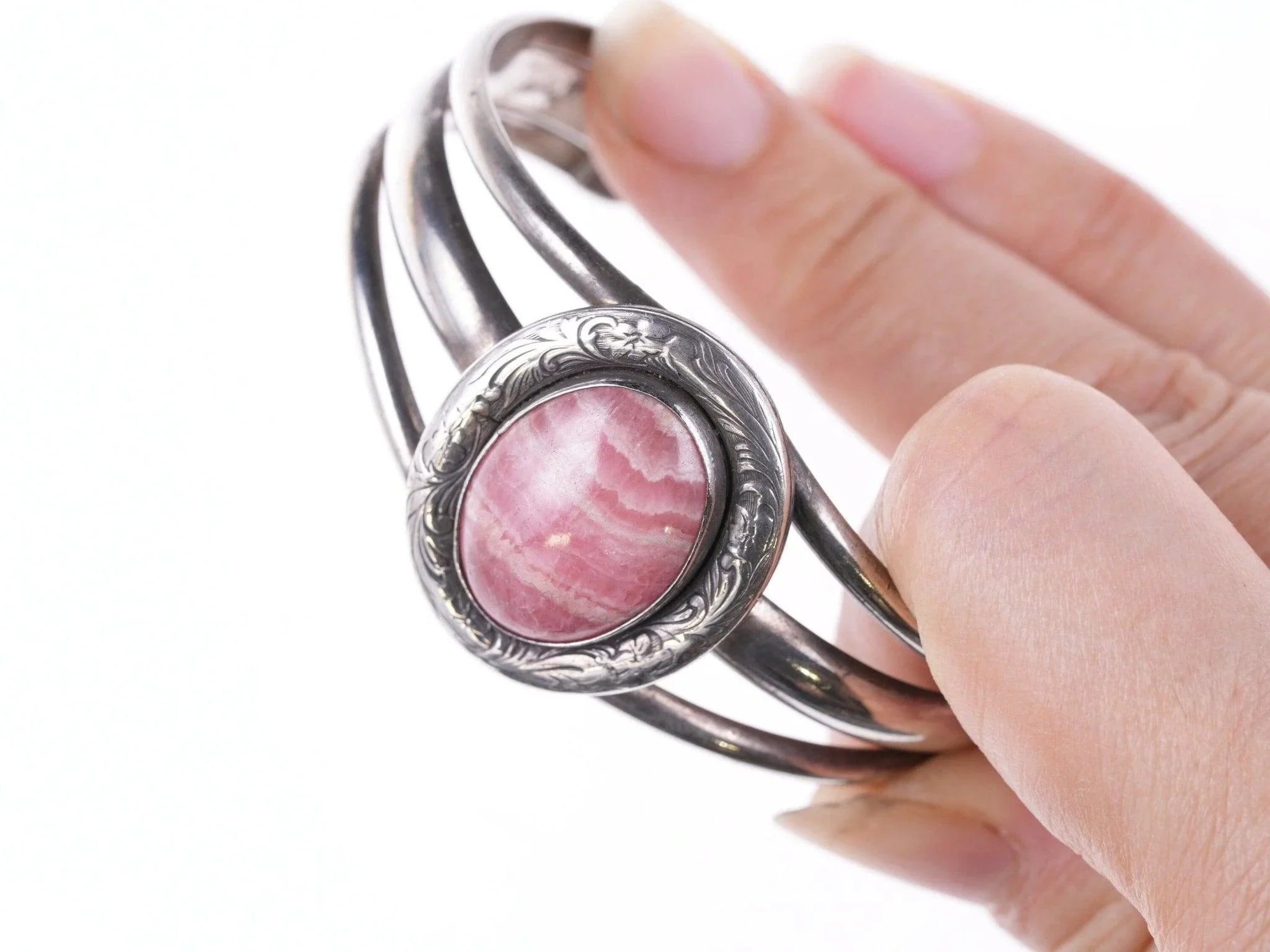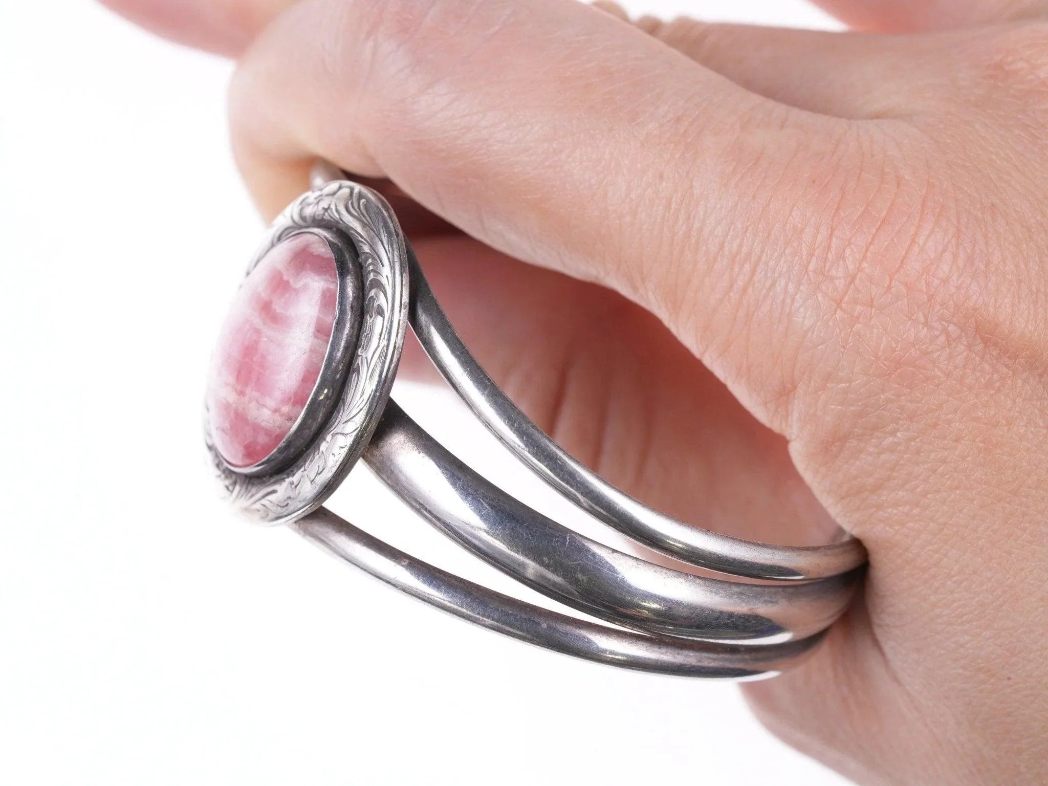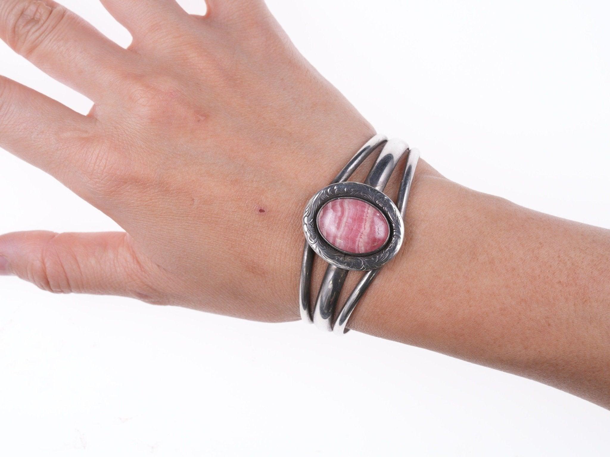 6.375" Vintage Southwestern Sterling hand engraved Rhodochrosite cuff bracelet