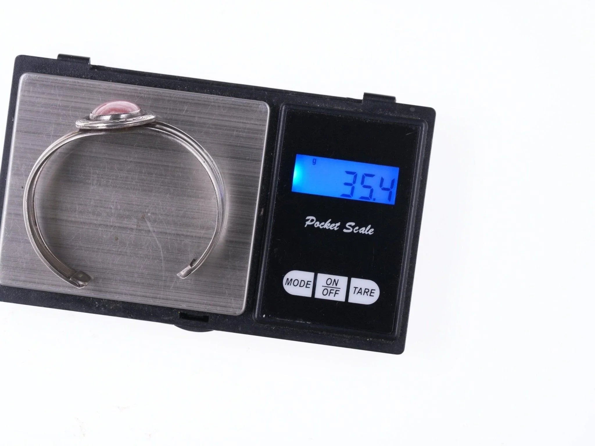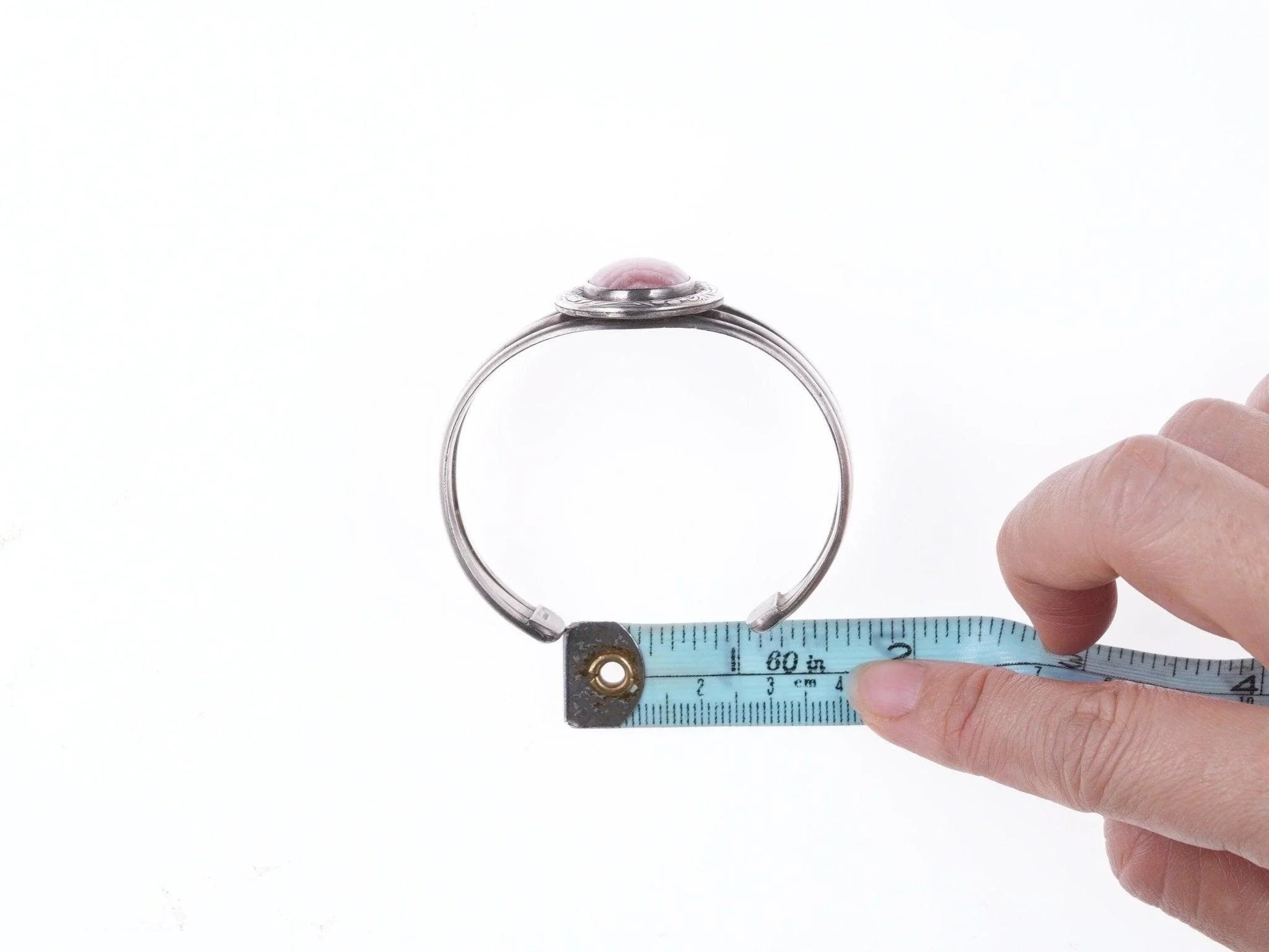 6 3/8" Vintage Southwestern Sterling hand engraved Rhodochrosite bracelet. Great looking solid bracelet with no issues. All precious metals are tested and guaranteed,