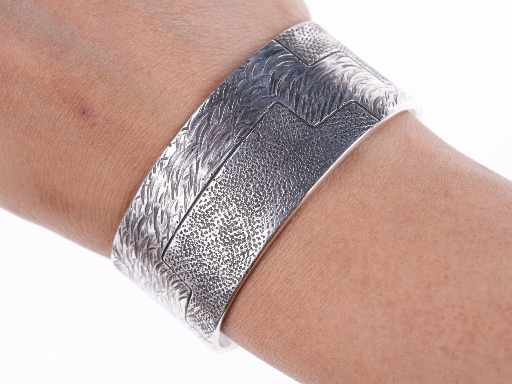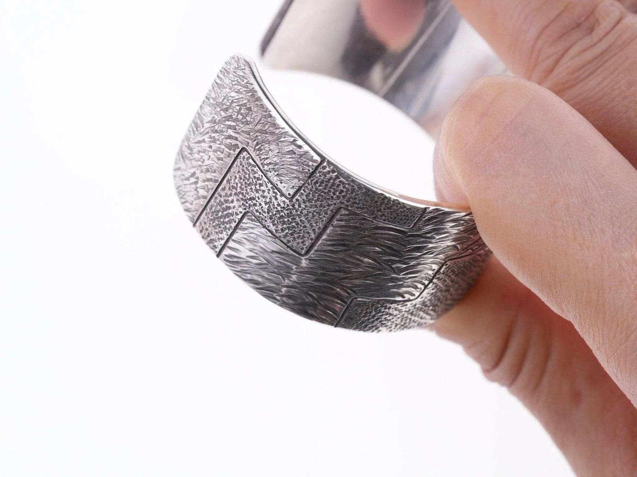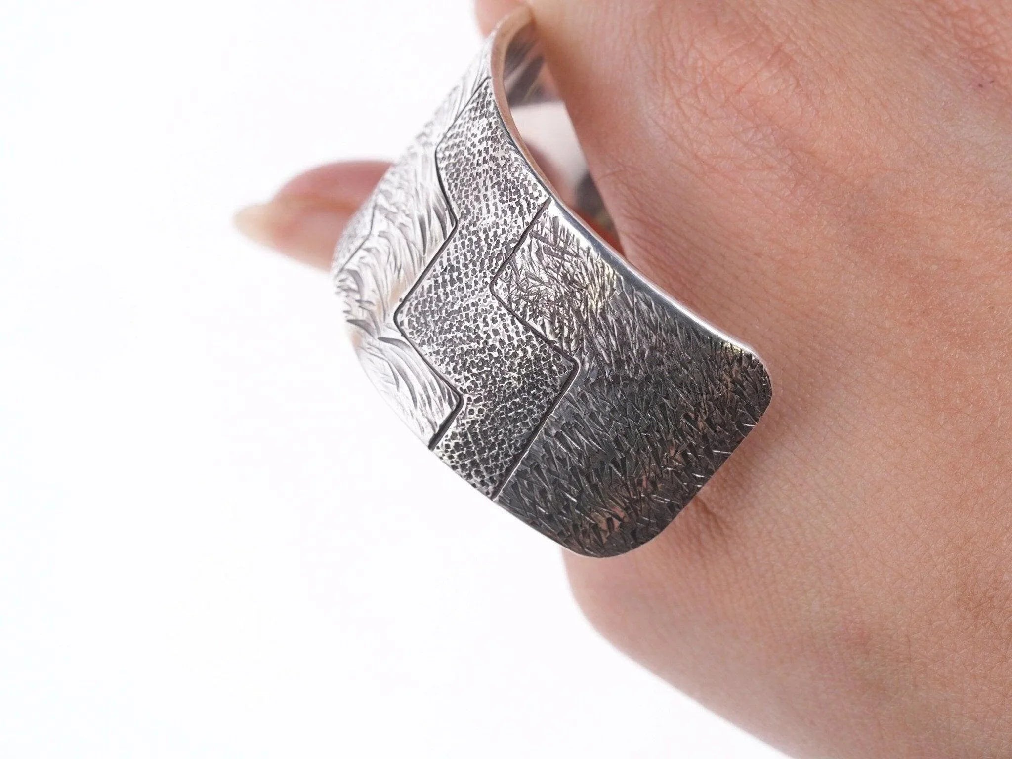 6 3/8" Jared Chavez San Felipe Sterling silver heavily worked bracelet, clean<br>with no issues. Unmarked, purchased directly from the Artist in 2002. With<br>obvious quality, style, and workmanship. I've had quite a few both Richard and<br>Jared Chavez pieces that weren't marked but were purchased directly from them.<br><br><br>Jared J. Chavez<br>I began my journey as an artist learning to craft jewelry from my father,<br>Richard I Chavez, a renowned lapidary artist. I was not given exact direction as<br>to what to make but was only given the tools and instruction on how to use them.<br>Along the way my work would be critiqued by my father and I would continually<br>strive to evolve my designs and fabrication processes. He stressed the quality<br>of the design and construction making sure that every aspect of a piece looked<br>“finished” and no corners were cut.<br><br>Along with all that I learned in my father’s studio, I would receive a Bachelor<br>of Arts from Georgetown University in Studio Arts with a focus in Digital Art<br>and Printmaking. After I graduated, I would attend The Revere Academy of Jewelry<br>Arts’, Intensive Bench Jeweler Program in San Francisco. Each of these<br>educational experiences added a particular technical or visual aspect to my work<br>and would encourage me to continue to explore all the ways I could enhance my<br>designs.<br><br>My current work focuses on the reflective nature of polished silver. Though<br>fabrication, metal stamping, and some casting, I explore how light and<br>reflection interacts with the materials I utilize. I’ve found that polished<br>silver takes in the colors and the light of the world around, and through the<br>use of surface texture a dynamic play of light is created across the surface of<br>my designs. I further enhance my work thought the use of semi-precious stones<br>(agates, quartz, jades, etc.). However one of the most important qualities in my<br>selection of stones is often translucency. I’ve found that by allowing light to<br>shine though a stone an overall rich and warm effect is created in the overall<br>design.<br><br>Along with my yearly schedule of shows where I sell my designs, I’ve also made<br>it a point to educate the public about my work. Growing up in my father’s<br>studio, I always saw just how much of himself he put into his designs and how<br>sometimes he was met with disbelief as to how much work was put into his pieces.<br>I found this to be a similar case when I entered the business, as the general<br>public only sees the finished piece. For that reason, though in person<br>demonstrations and self-produced video mini-documentaries, we’ve made it a point<br>to show the skill, time, and passion that goes into every design. I continually<br>strive to evolve my work and hold every design to the exacting standards that my<br>father established when he created Chavez Studio 50 years ago.<br><br>All precious metals are tested and guaranteed, any Native American jewelry<br>referred to as Silver or Sterling is guaranteed to be a minimum of 90% (coin)<br>silver and possibly higher content. Anything marked is guaranteed to be what<br>it's marked, most bracelets are photographed on a 6" wrist (non hairy), rings<br>photographed on the appropriate sized finger when possible. With bracelets if<br>the measurement is not given in the description then inside circumference is<br>shown where the metal meets the number on the the cloth tape measure.