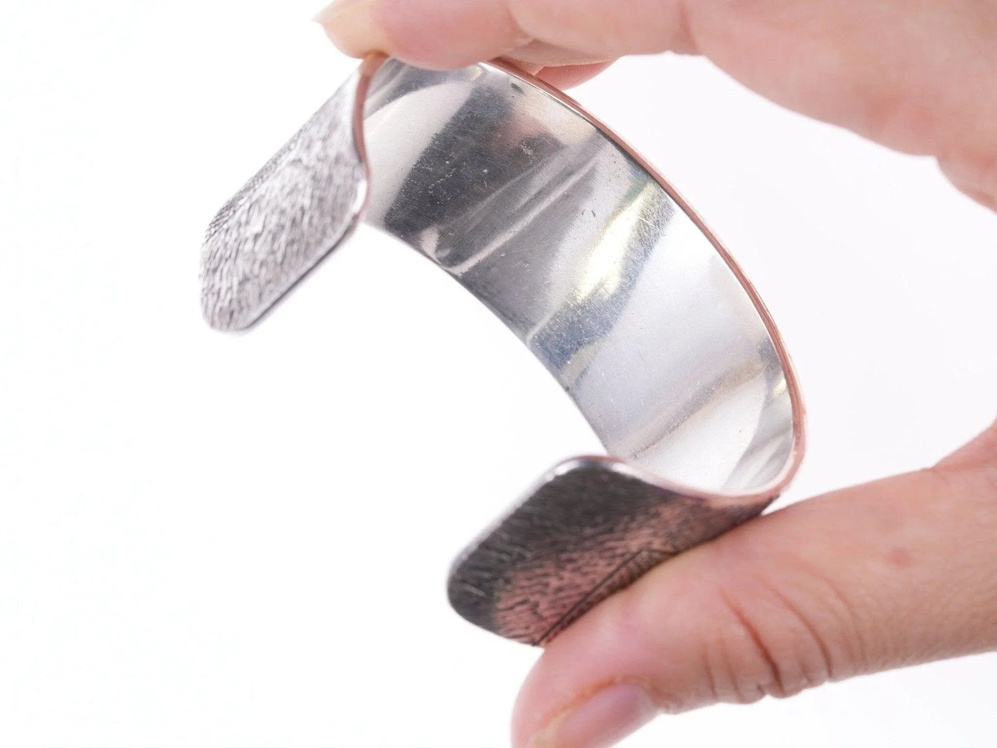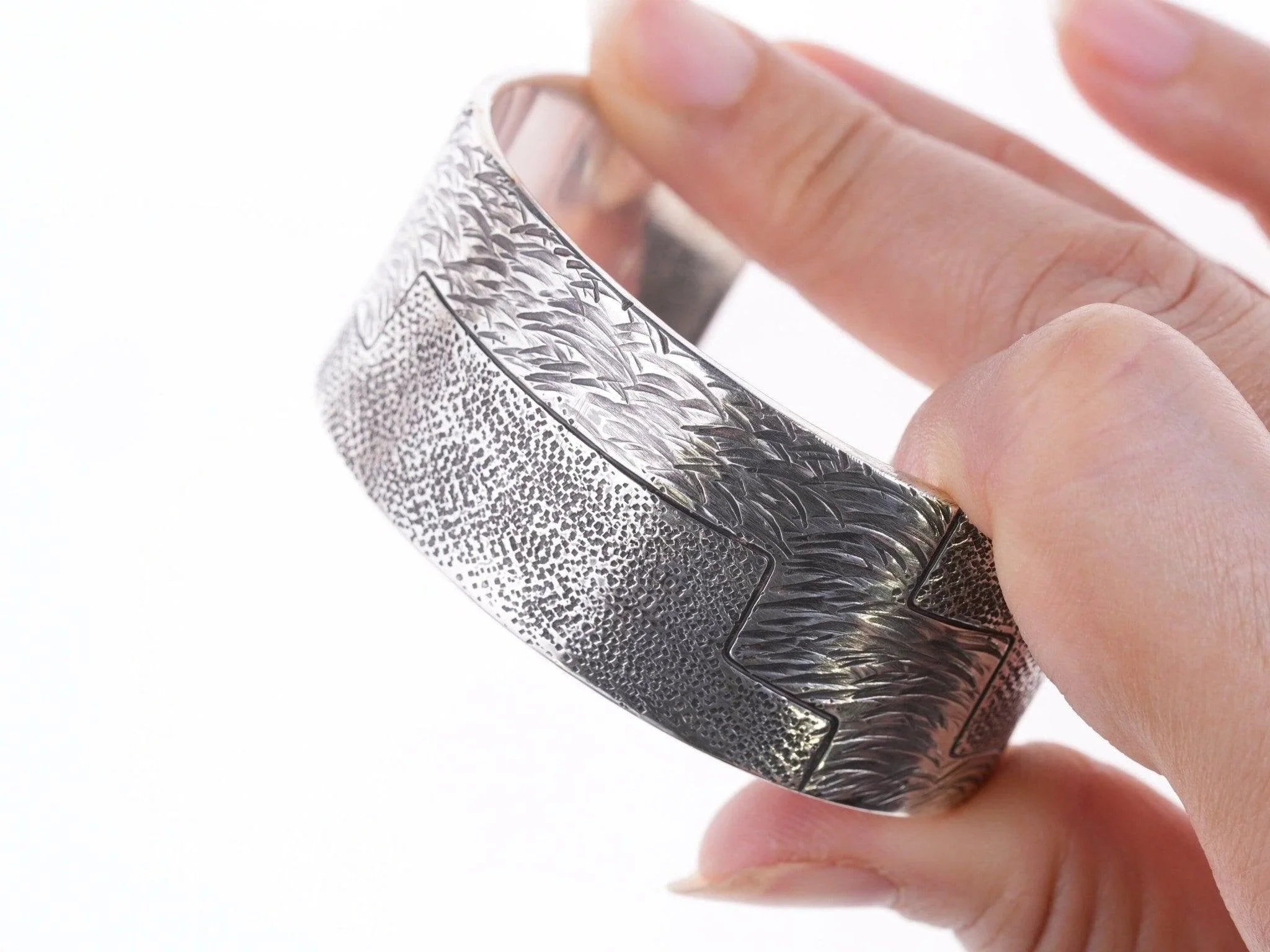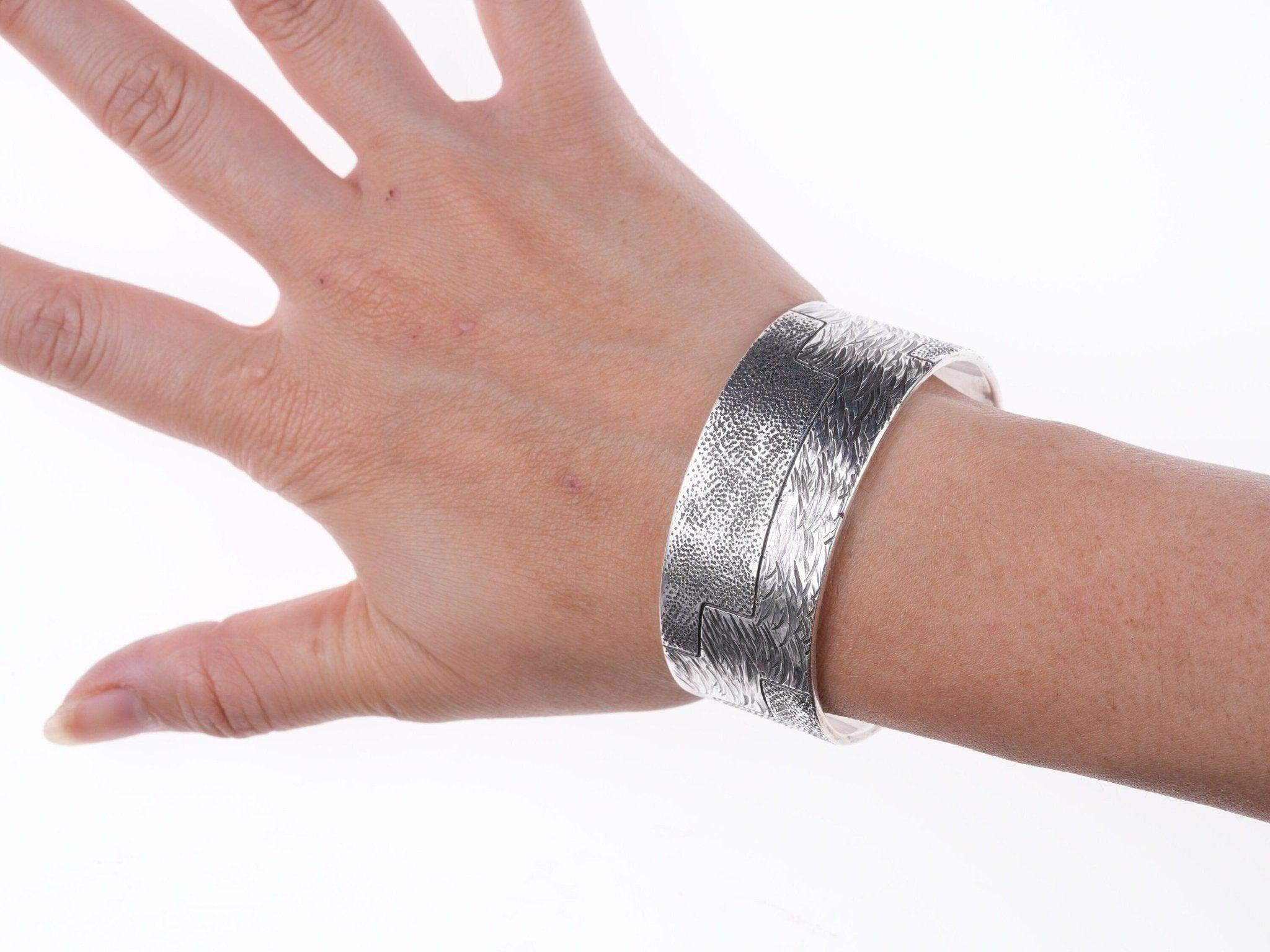 6 3/8" Jared Chavez San Felipe Sterling silver heavily worked bracelet, clean<br>with no issues. Unmarked, purchased directly from the Artist in 2002. With<br>obvious quality, style, and workmanship. I've had quite a few both Richard and<br>Jared Chavez pieces that weren't marked but were purchased directly from them.<br><br><br>Jared J. Chavez<br>I began my journey as an artist learning to craft jewelry from my father,<br>Richard I Chavez, a renowned lapidary artist. I was not given exact direction as<br>to what to make but was only given the tools and instruction on how to use them.<br>Along the way my work would be critiqued by my father and I would continually<br>strive to evolve my designs and fabrication processes. He stressed the quality<br>of the design and construction making sure that every aspect of a piece looked<br>“finished” and no corners were cut.<br><br>Along with all that I learned in my father’s studio, I would receive a Bachelor<br>of Arts from Georgetown University in Studio Arts with a focus in Digital Art<br>and Printmaking. After I graduated, I would attend The Revere Academy of Jewelry<br>Arts’, Intensive Bench Jeweler Program in San Francisco. Each of these<br>educational experiences added a particular technical or visual aspect to my work<br>and would encourage me to continue to explore all the ways I could enhance my<br>designs.<br><br>My current work focuses on the reflective nature of polished silver. Though<br>fabrication, metal stamping, and some casting, I explore how light and<br>reflection interacts with the materials I utilize. I’ve found that polished<br>silver takes in the colors and the light of the world around, and through the<br>use of surface texture a dynamic play of light is created across the surface of<br>my designs. I further enhance my work thought the use of semi-precious stones<br>(agates, quartz, jades, etc.). However one of the most important qualities in my<br>selection of stones is often translucency. I’ve found that by allowing light to<br>shine though a stone an overall rich and warm effect is created in the overall<br>design.<br><br>Along with my yearly schedule of shows where I sell my designs, I’ve also made<br>it a point to educate the public about my work. Growing up in my father’s<br>studio, I always saw just how much of himself he put into his designs and how<br>sometimes he was met with disbelief as to how much work was put into his pieces.<br>I found this to be a similar case when I entered the business, as the general<br>public only sees the finished piece. For that reason, though in person<br>demonstrations and self-produced video mini-documentaries, we’ve made it a point<br>to show the skill, time, and passion that goes into every design. I continually<br>strive to evolve my work and hold every design to the exacting standards that my<br>father established when he created Chavez Studio 50 years ago.<br><br>All precious metals are tested and guaranteed, any Native American jewelry<br>referred to as Silver or Sterling is guaranteed to be a minimum of 90% (coin)<br>silver and possibly higher content. Anything marked is guaranteed to be what<br>it's marked, most bracelets are photographed on a 6" wrist (non hairy), rings<br>photographed on the appropriate sized finger when possible. With bracelets if<br>the measurement is not given in the description then inside circumference is<br>shown where the metal meets the number on the the cloth tape measure.
