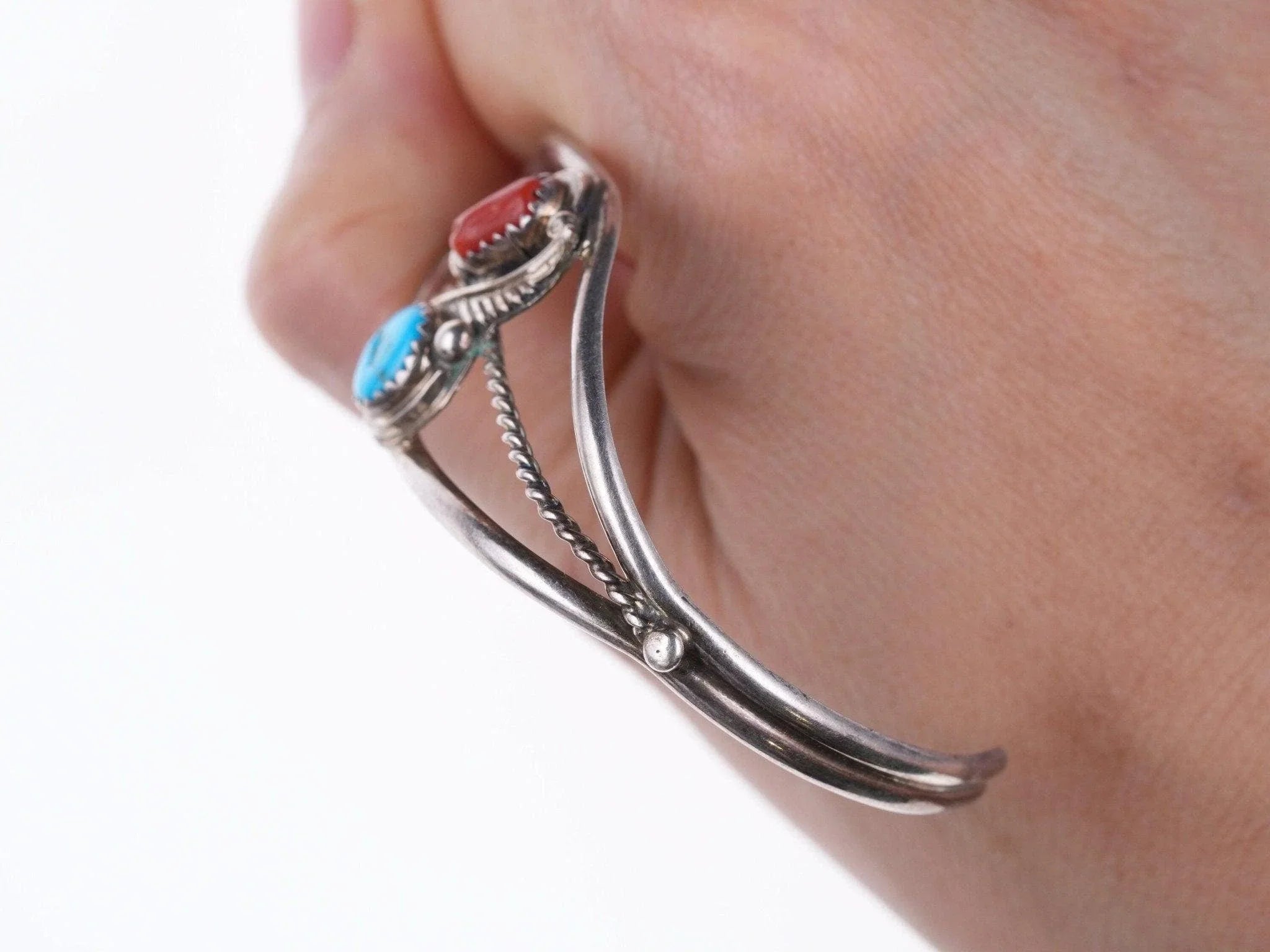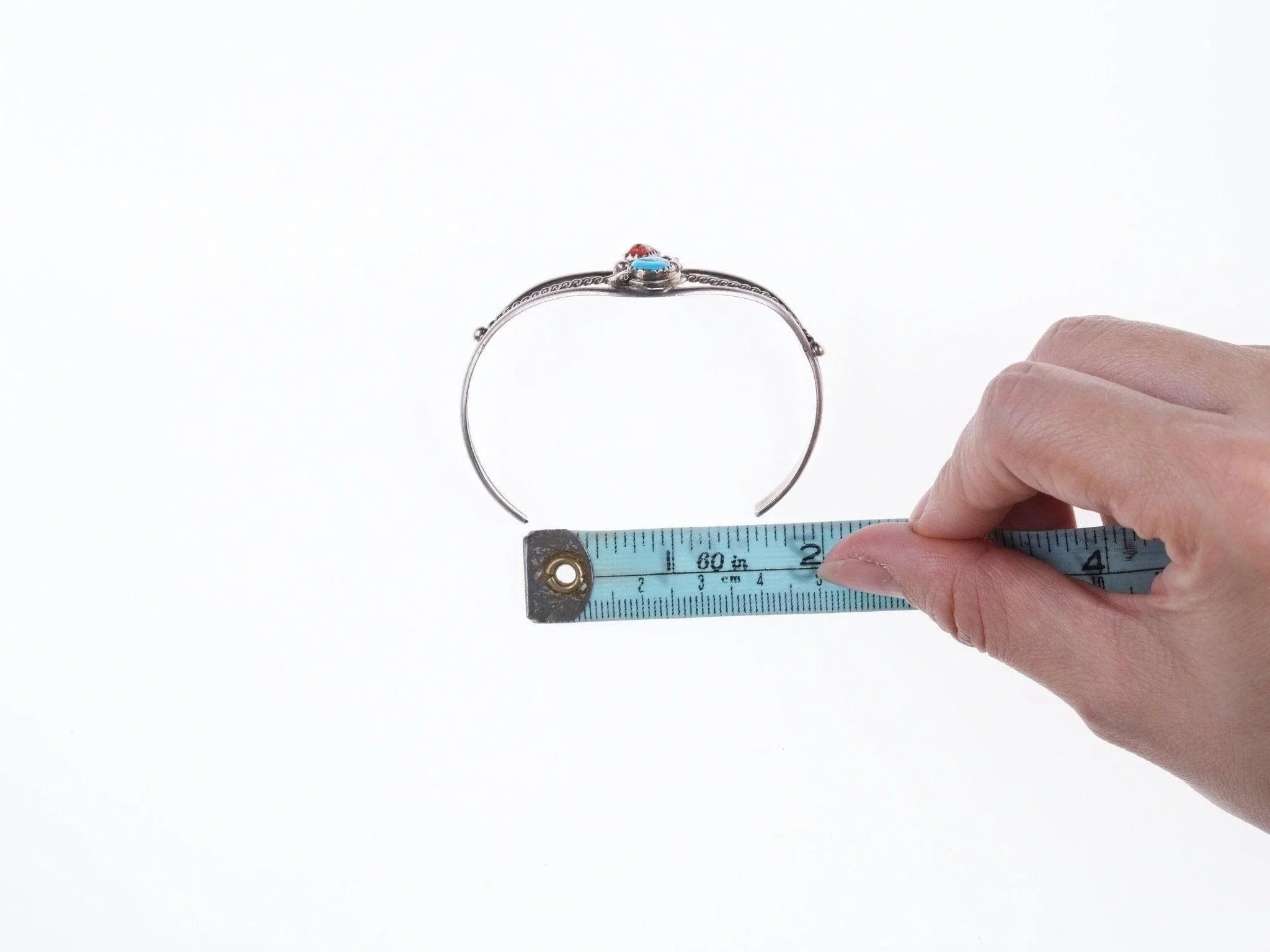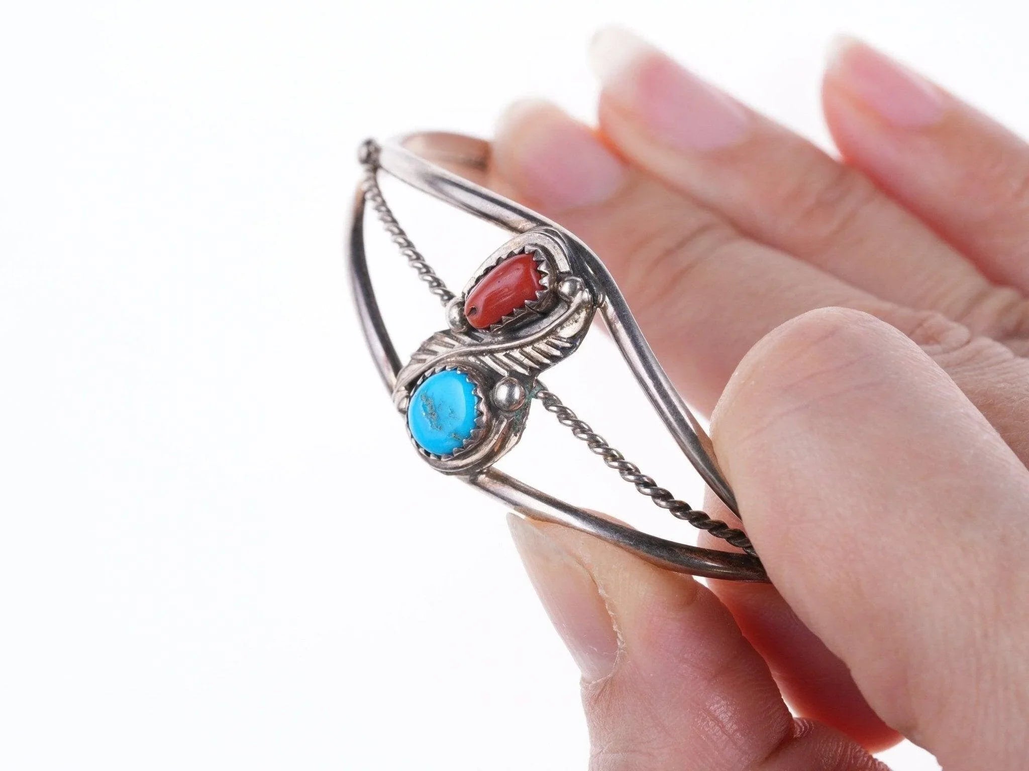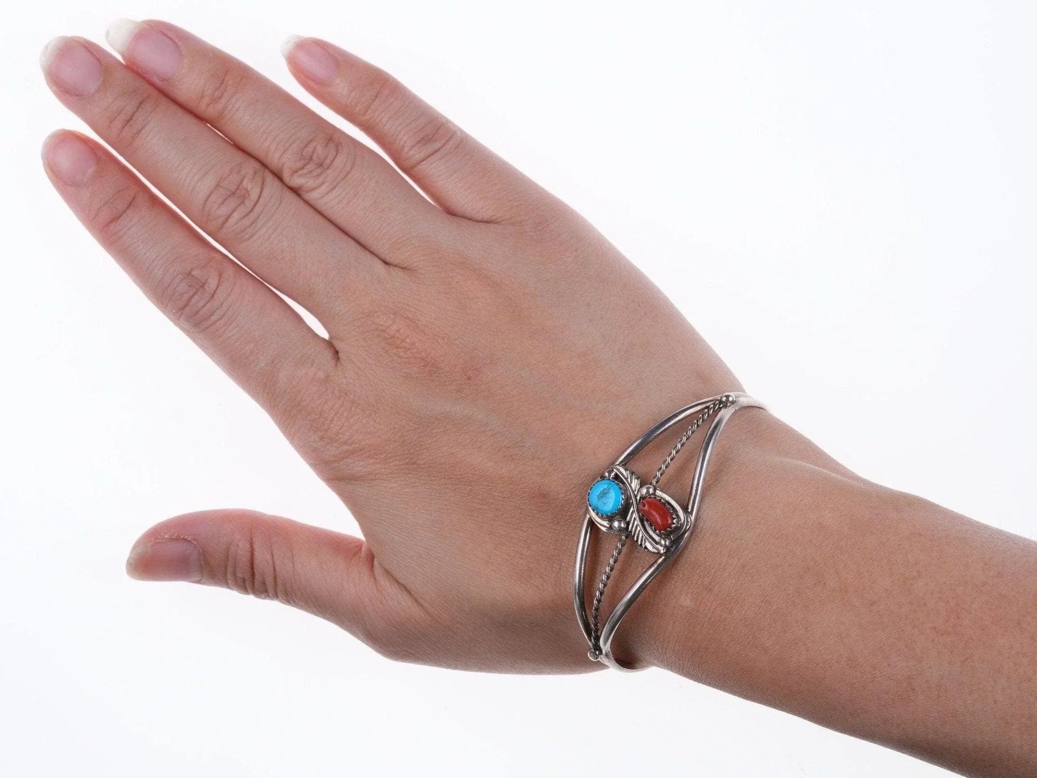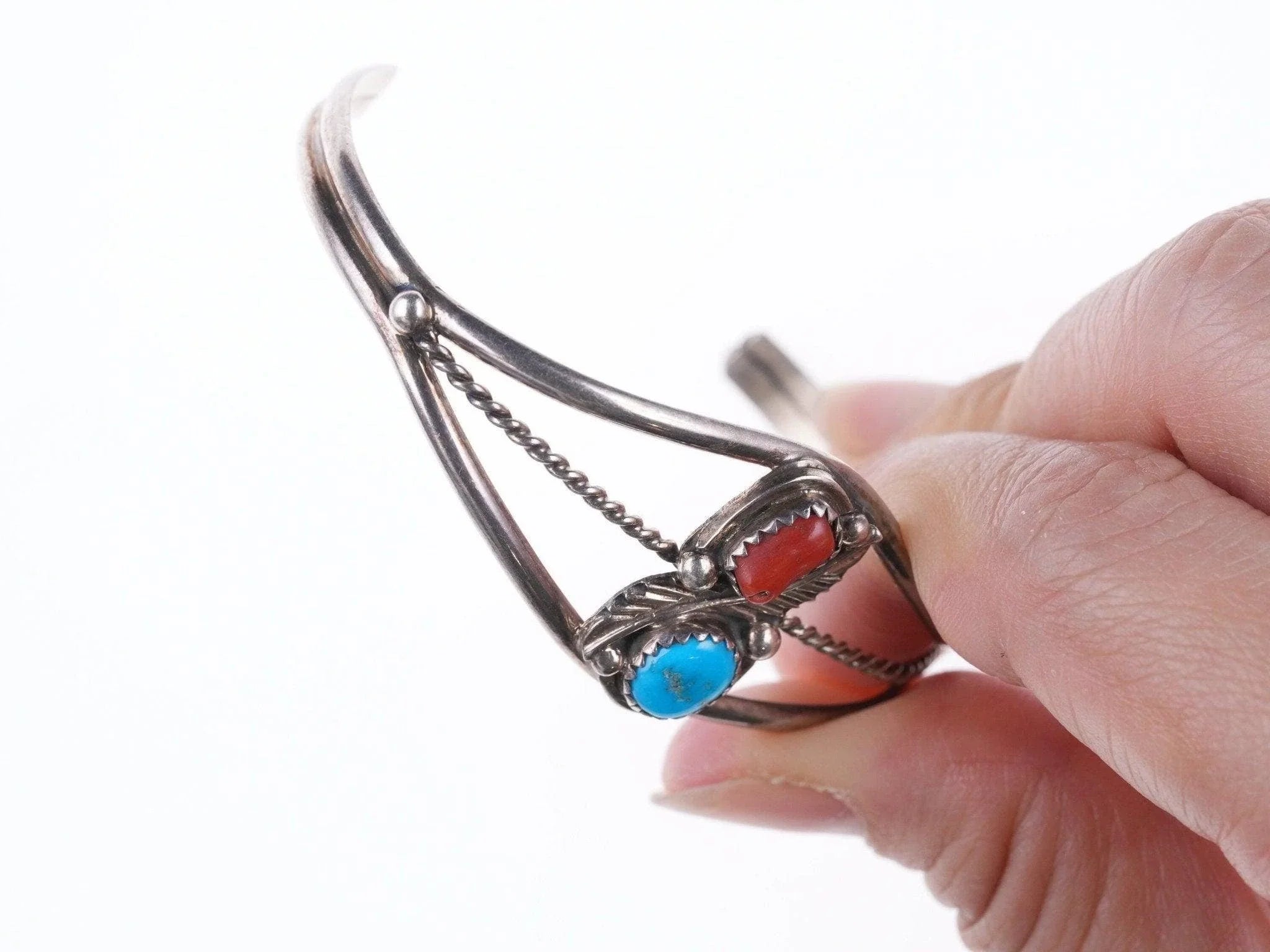 6.5" Navajo turquoise and coral sterling bracelet<br><br>All precious metals are tested and guaranteed, any Native American jewelry<br>referred to as Silver or Sterling is guaranteed to be a minimum of 90% (coin)<br>silver and possibly higher content. Anything marked is guaranteed to be what<br>it's marked, most bracelets are photographed on a 6" wrist (non hairy), rings<br>photographed on the appropriate sized finger when possible. With bracelets if<br>the measurement is not given in the description then inside circumference is<br>shown where the metal meets the number on the the cloth tape measure.