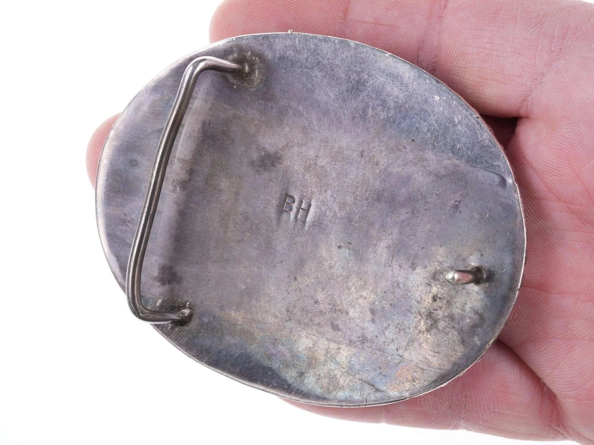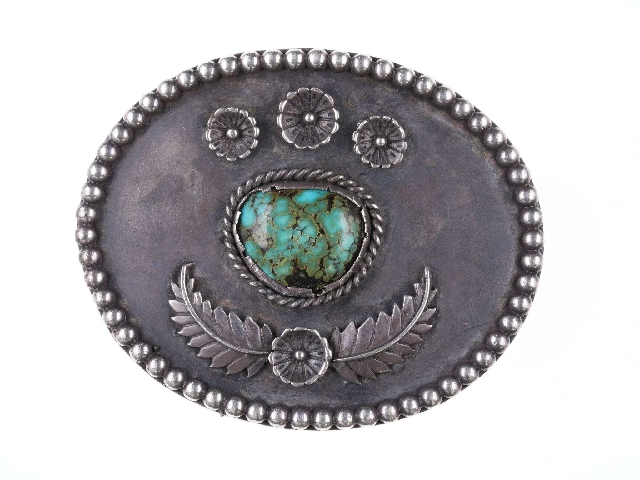c1950's Navajo Silver and spiderweb turquoise buckle. 3.25" x 2 5/8", fits up to<br>a 1.75" belt, 80 grams with no issues.<br><br>All precious metals are tested and guaranteed, any Native American jewelry<br>referred to as Silver or Sterling is guaranteed to be a minimum of 90% (coin)<br>silver and possibly higher content. Anything marked is guaranteed to be what<br>it's marked, most bracelets are photographed on a 6" wrist (non hairy), rings<br>photographed on the appropriate sized finger when possible. With bracelets if<br>the measurement is not given in the description then inside circumference is<br>shown where the metal meets the number on the the cloth tape measure.<br><br>anderas