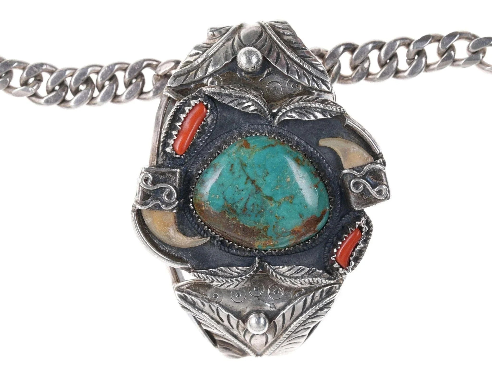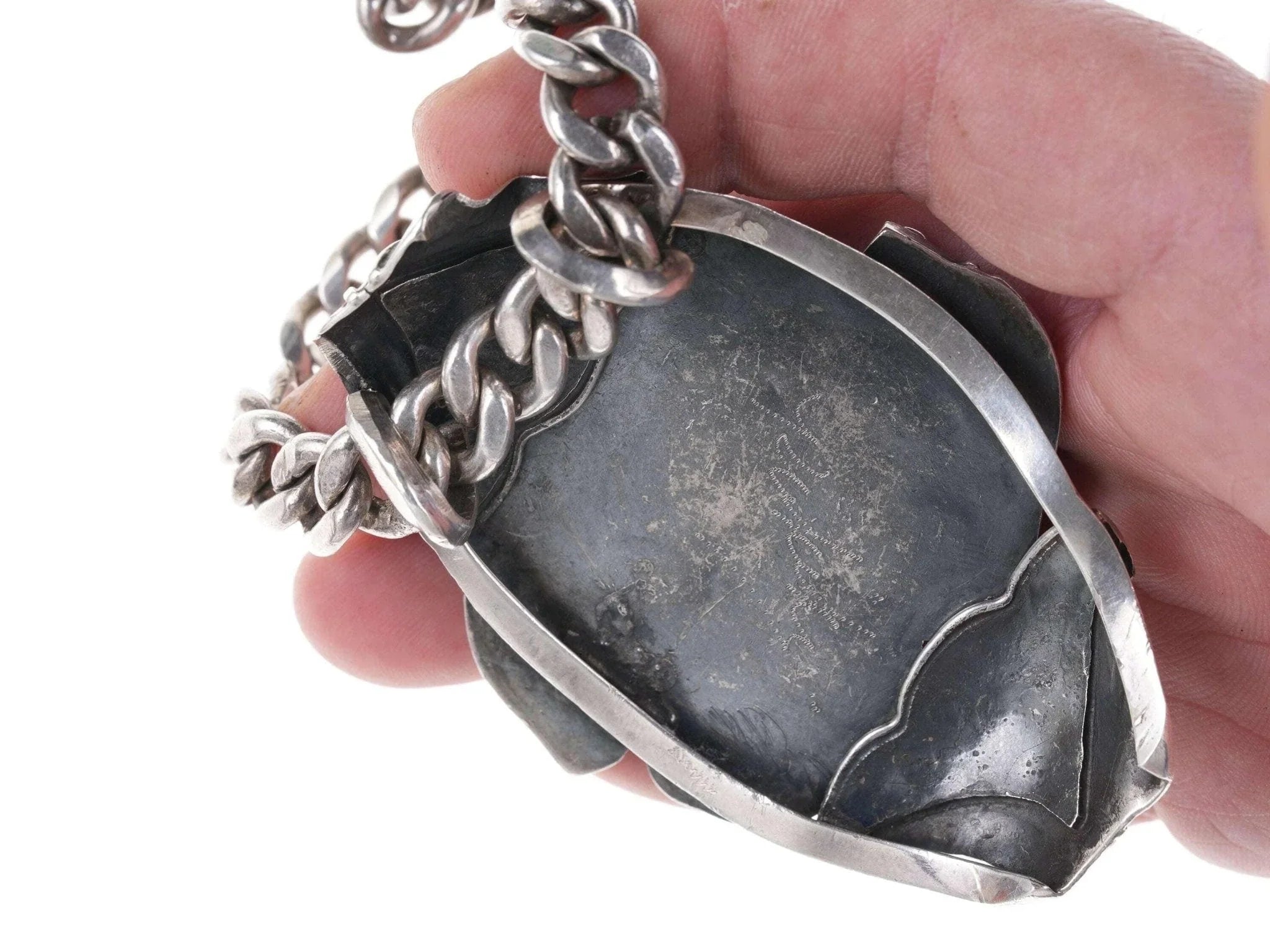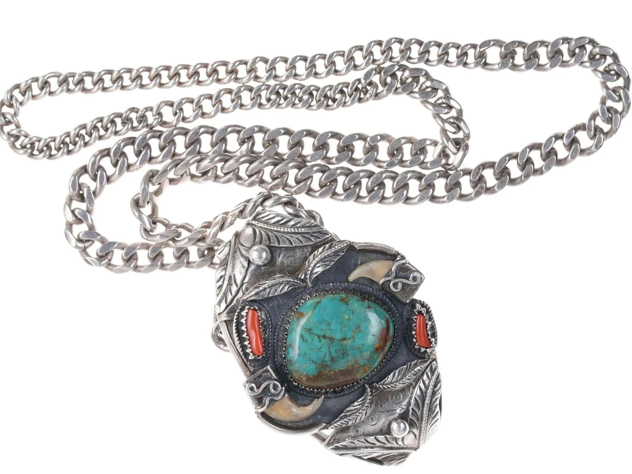 Huge Beastly Native American Sterling turquoise/coral pendant/necklace. Nice old piece, illegible artists signature on back, tested sterling with no sterling