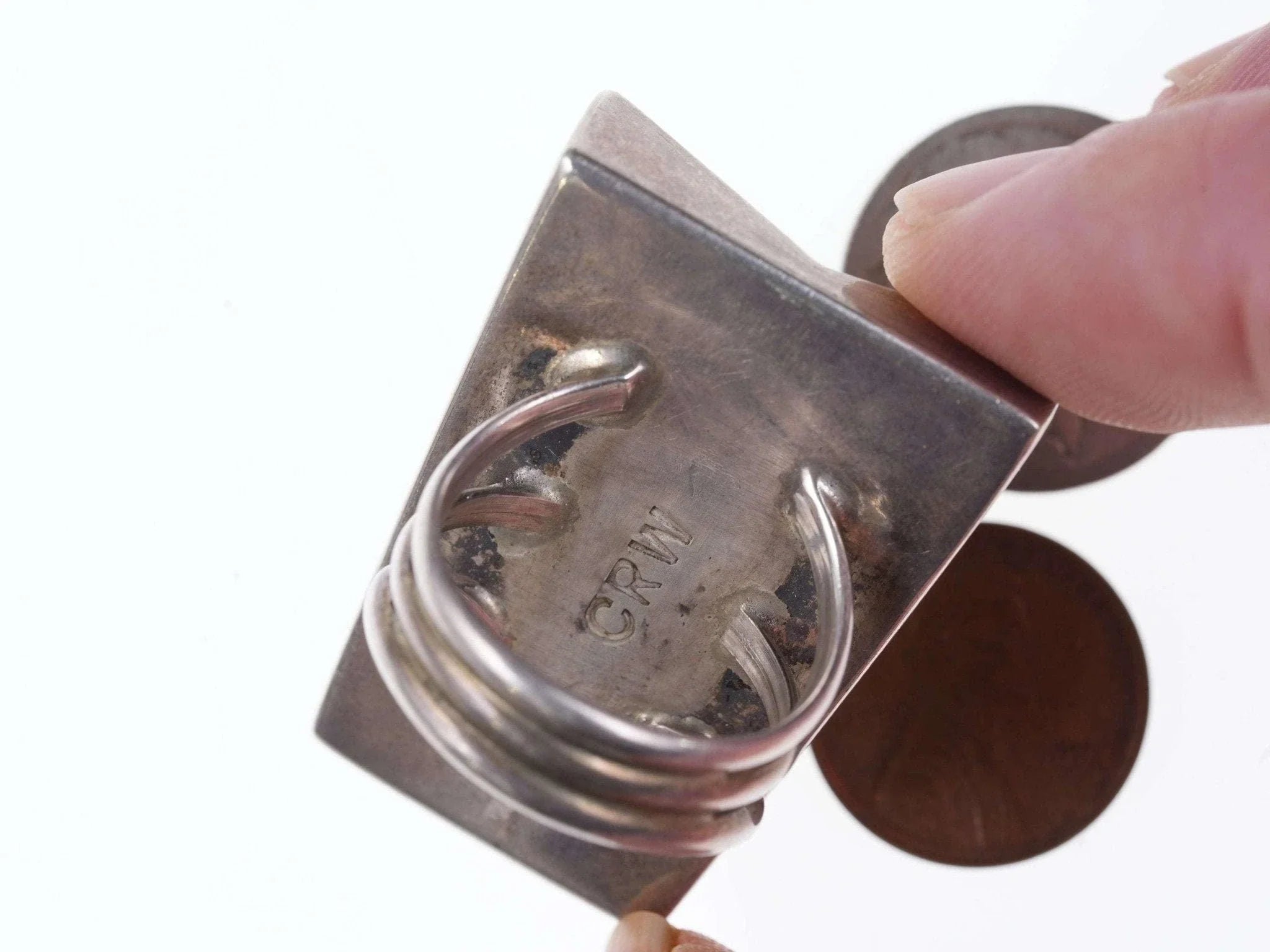 Large Navajo Overlay ring with inlaid sides. Size 9 Stamped CRW, no other marks tested and guaranteed at least Coin (90%) silver. Great condition with little wear 1.5" x 1 1/8" face 36.4 grams.