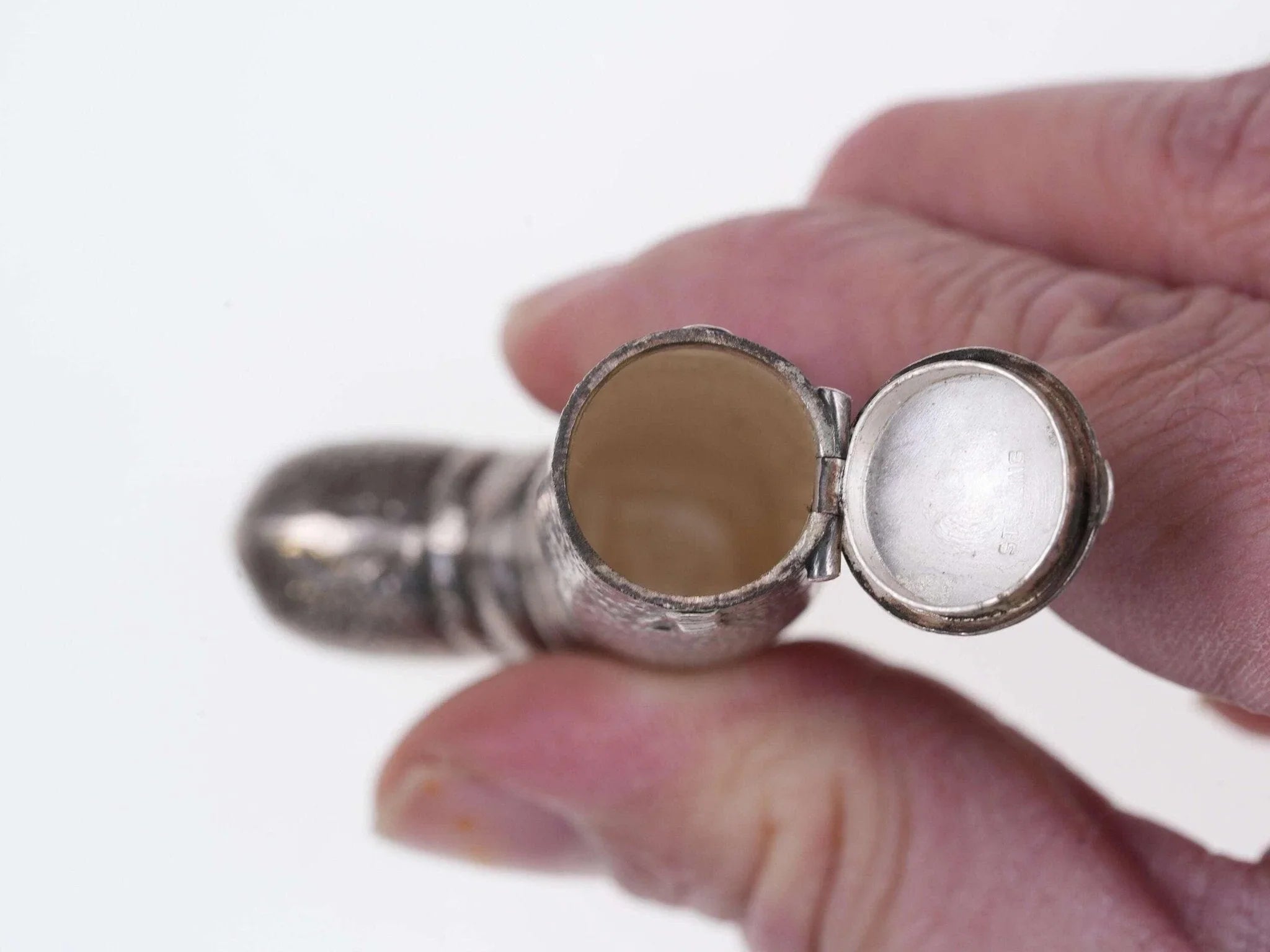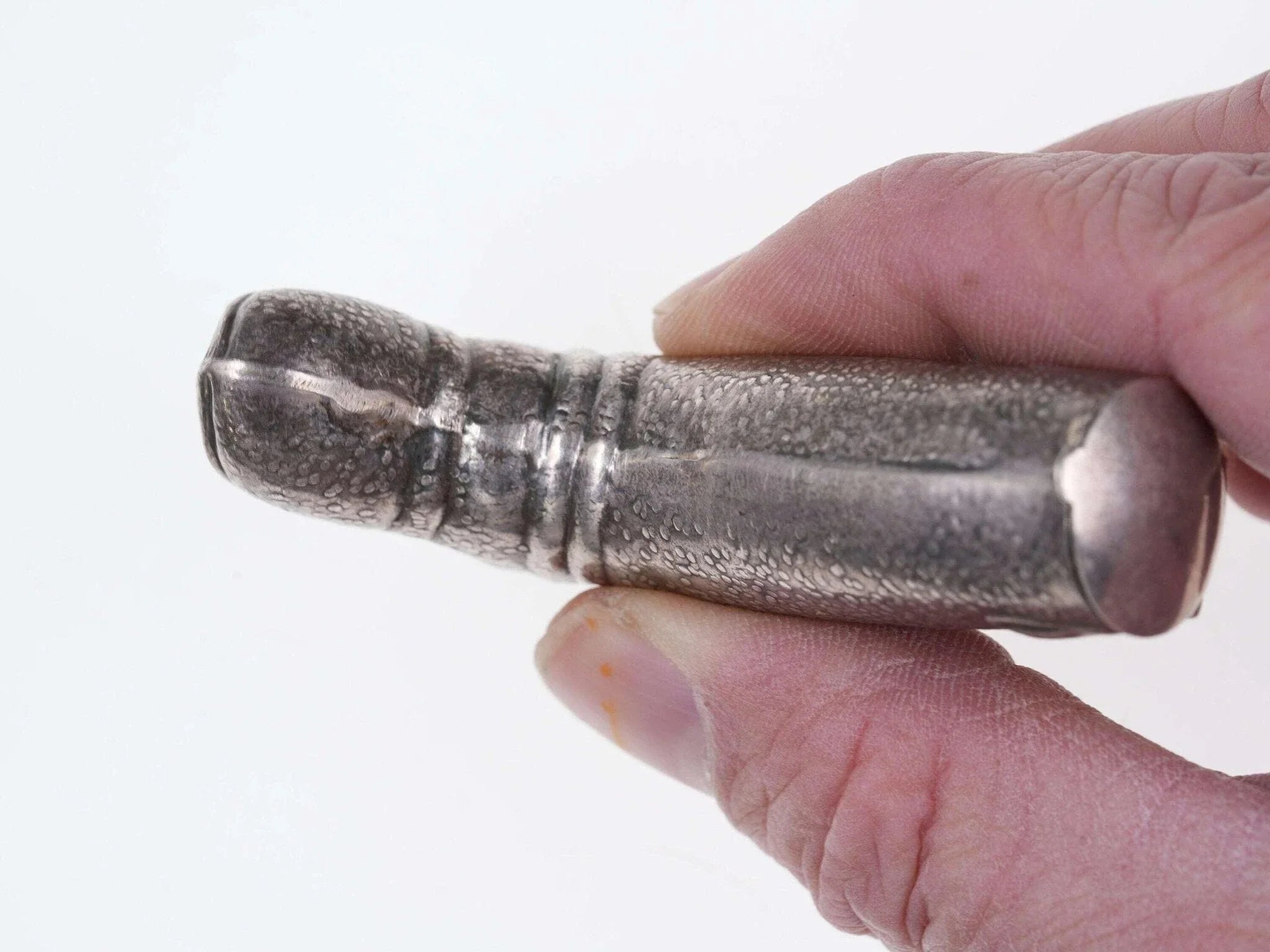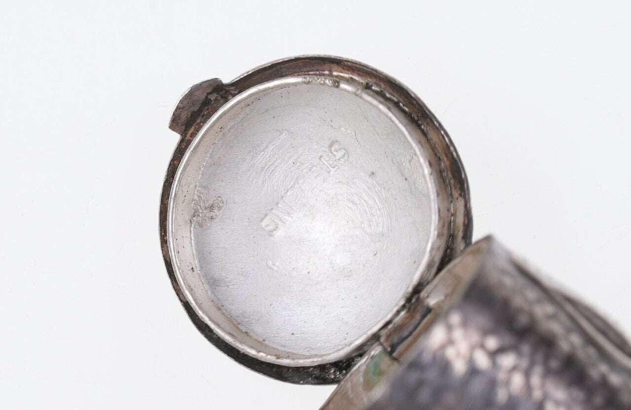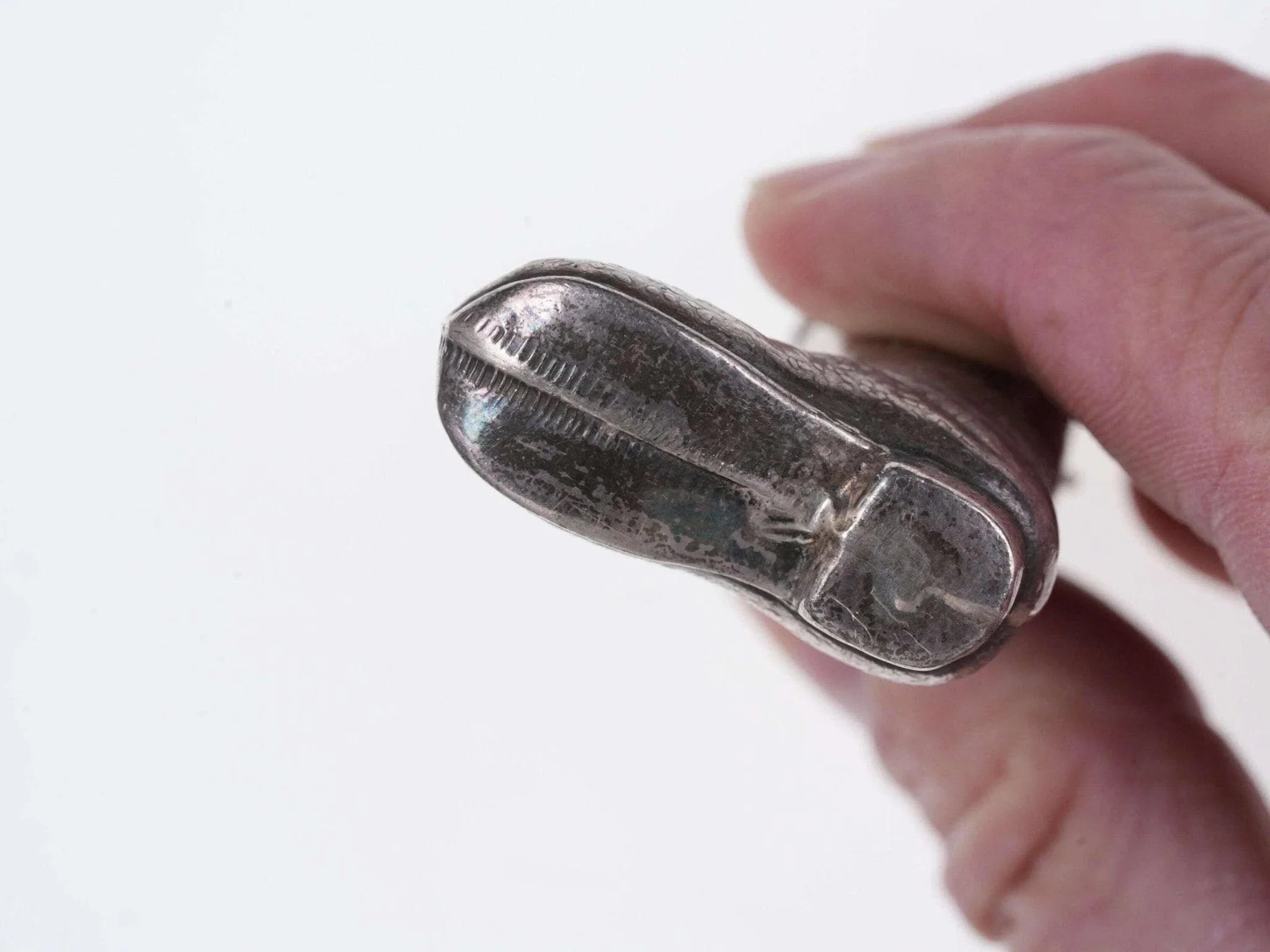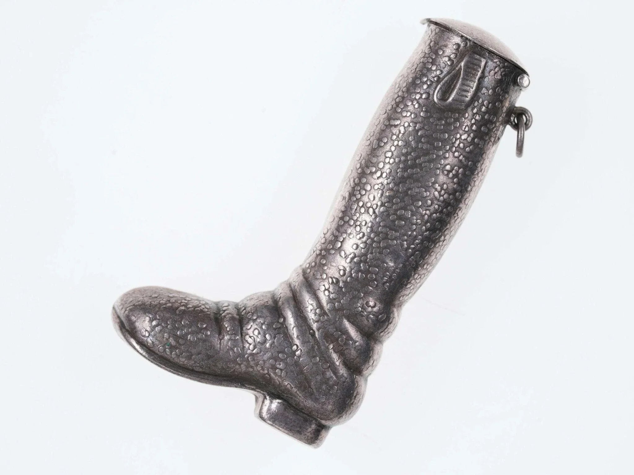 c1910 Sterling Silver Boot Form match holder pendant. 2 5/8" tall x 1.5" long<br>with no damage. Great detail, stamped sterling inside lid. 21.4 grams.<br><br>pendants