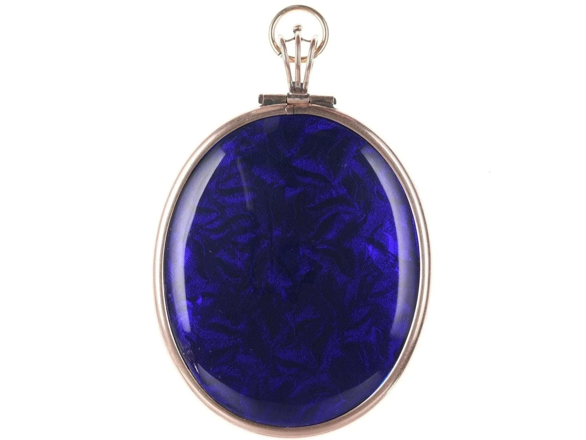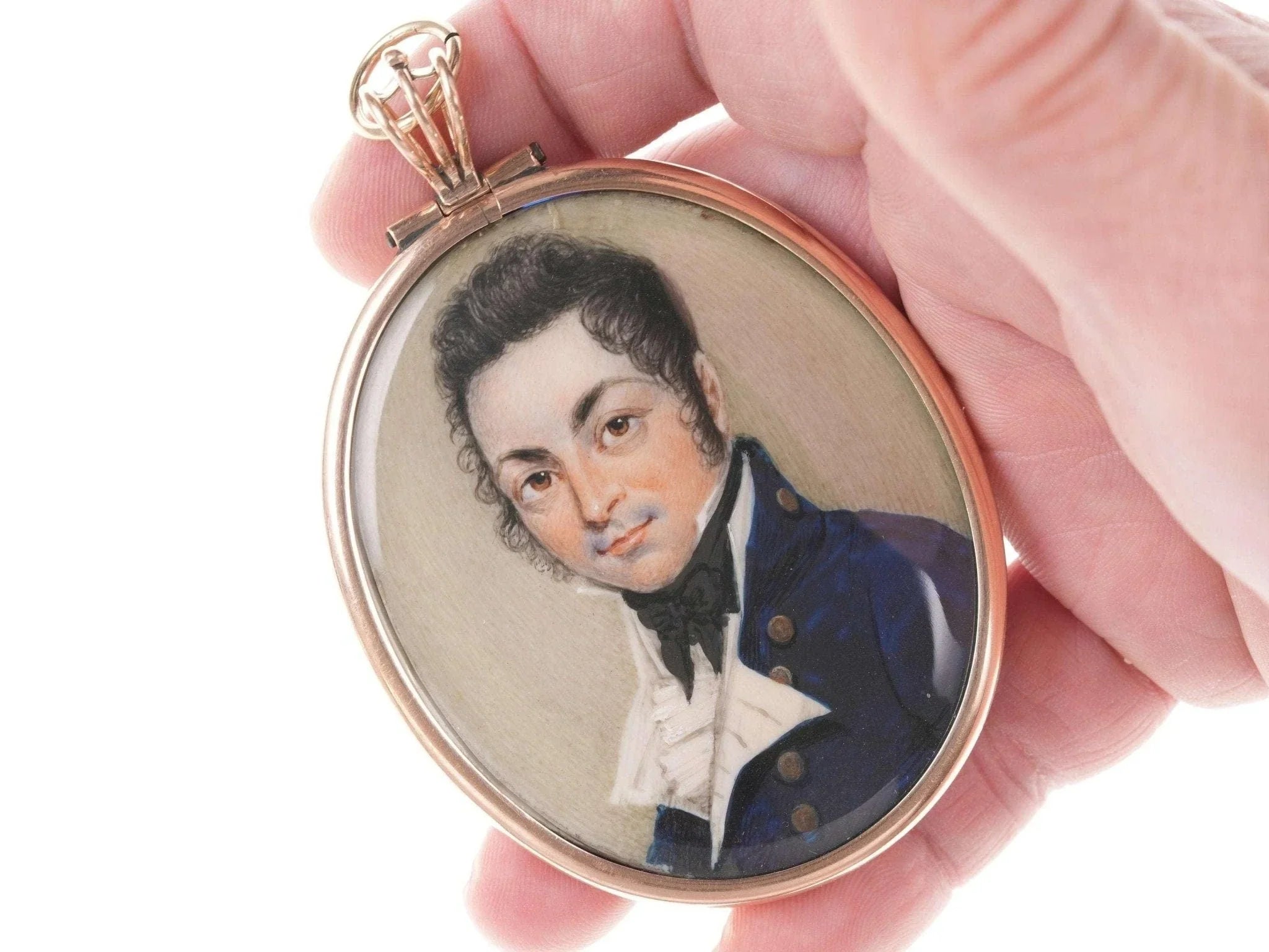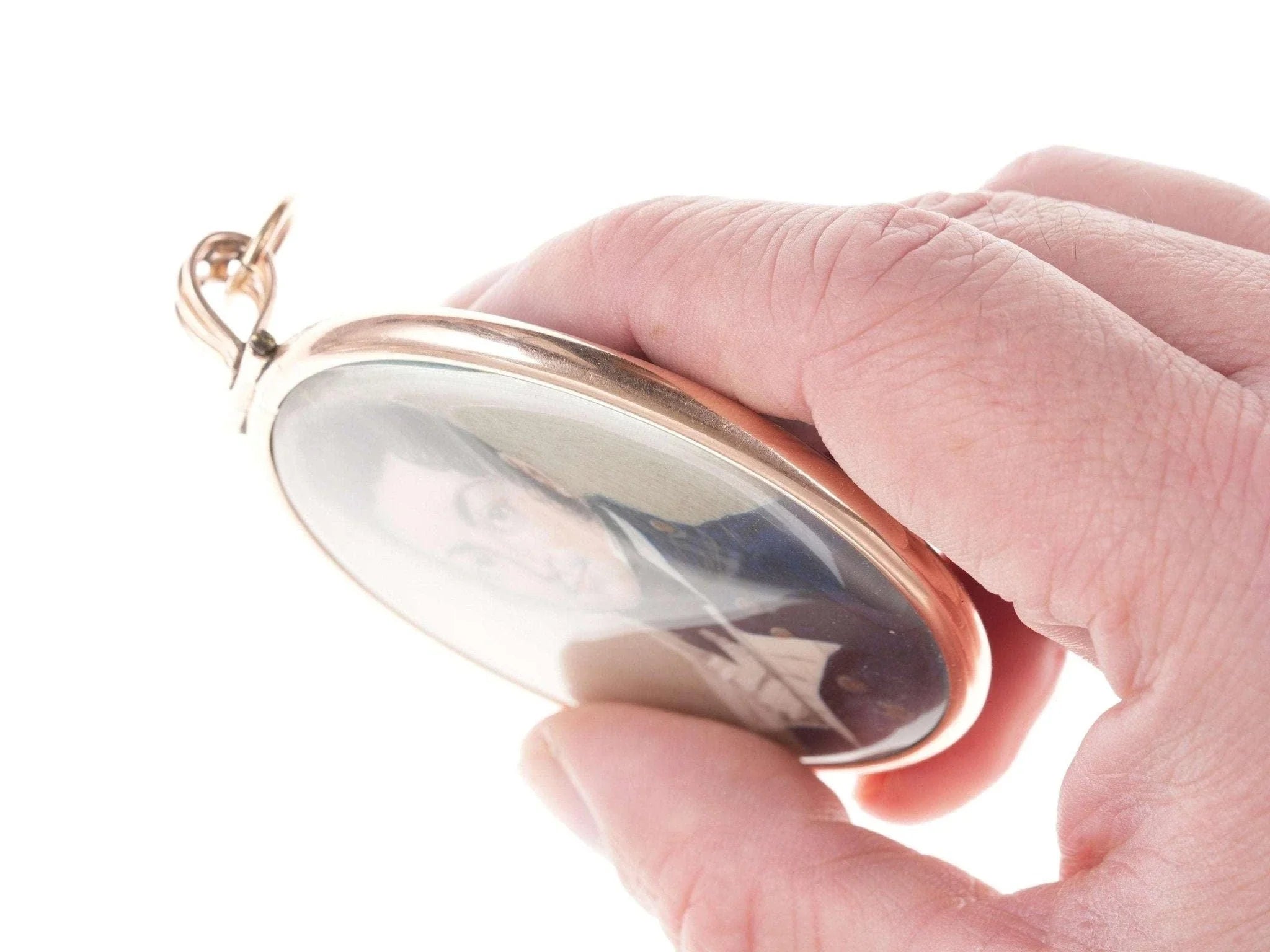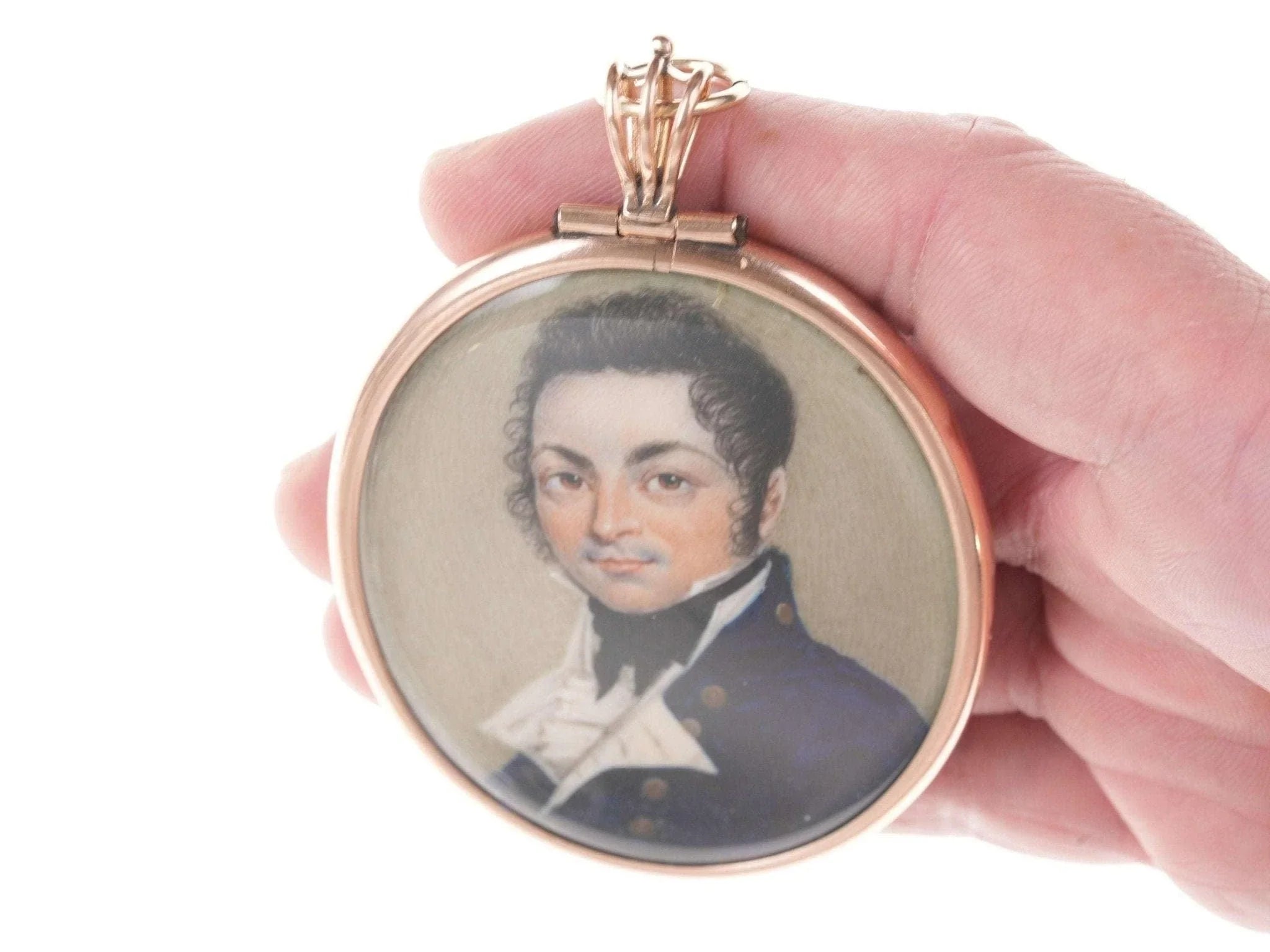 Large Georgian 14k Gold Mounted Portrait miniature pendant. Very fine portrait<br>miniature from the 18th to early 19th century mounted in a thick frame made of<br>solid 14+K gold. I disassembled this to get an accurate test without damaging<br>the exterior and it is solid 14k or more but less than 18k gold. Upon<br>disassembly I found three pieces of paper shown in the interior, one was the cut<br>in half, when put together it reads<br><br>Lane Portrait and Miniature Painter 135 High Street Portsmouth, then on the back<br>perhaps the reciept for this portrait.<br><br>Then the other paper reads this<br>Mr Oct. _______<br>Great George Street<br>Westminister<br><br>I was really surprised to find these clues though I don't have much time to<br>follow up on them they are interesting. I have put the pieces of paper back<br>inside where they have safely hid for the past 200 or so years. It is 3.5" tall<br>without the extra loose top ring x 2 3/8" wide 44.8 grams. The pictures were<br>taken after reassembly and careful cleaning of the 200+ year old gold frame.
