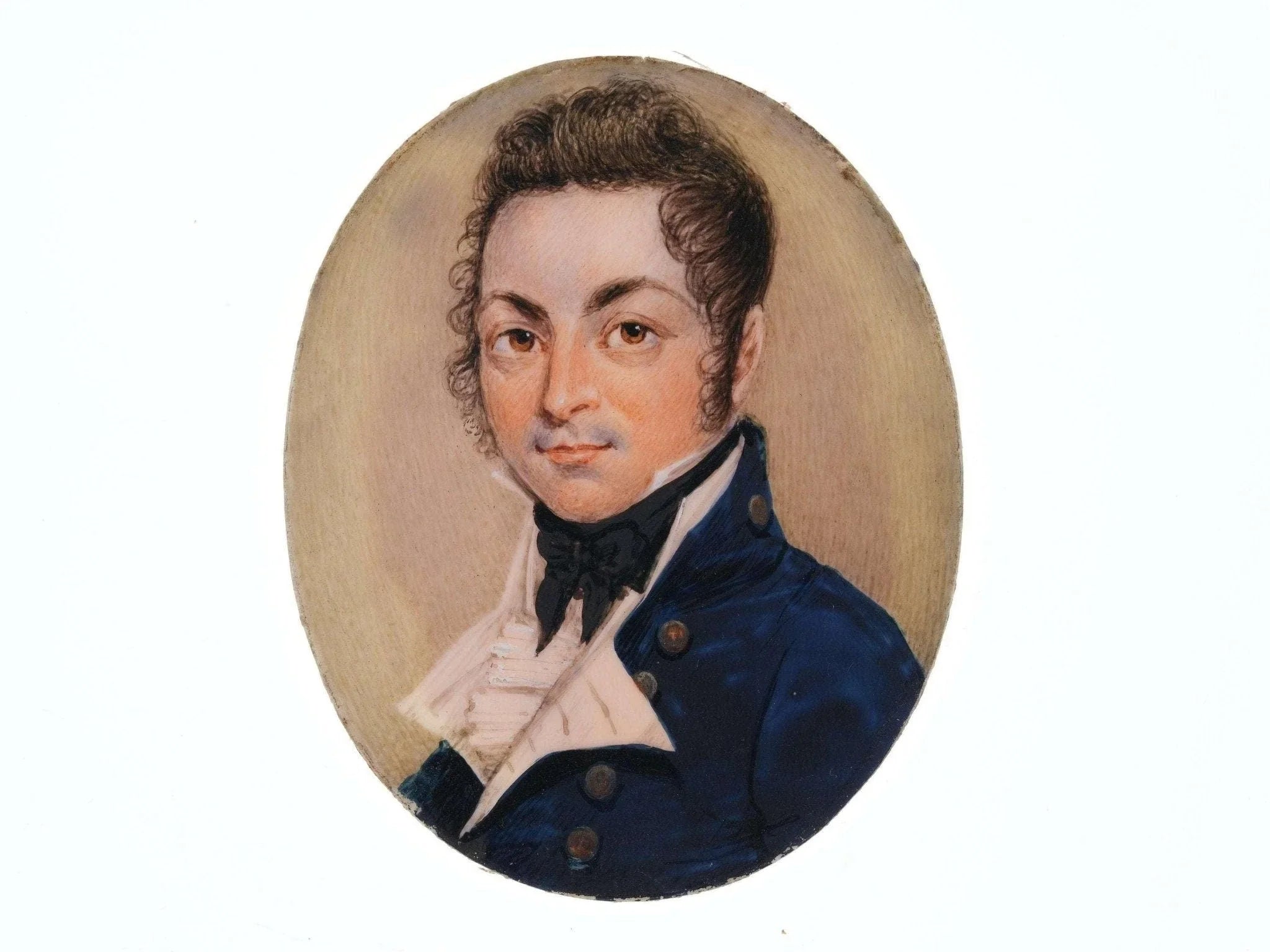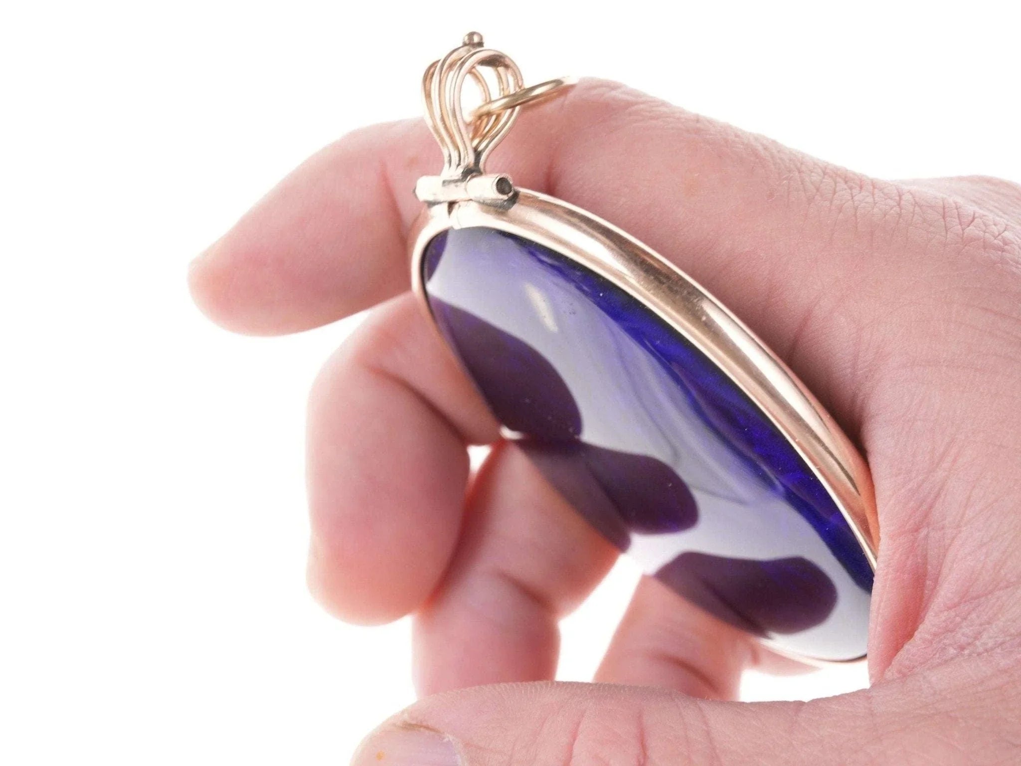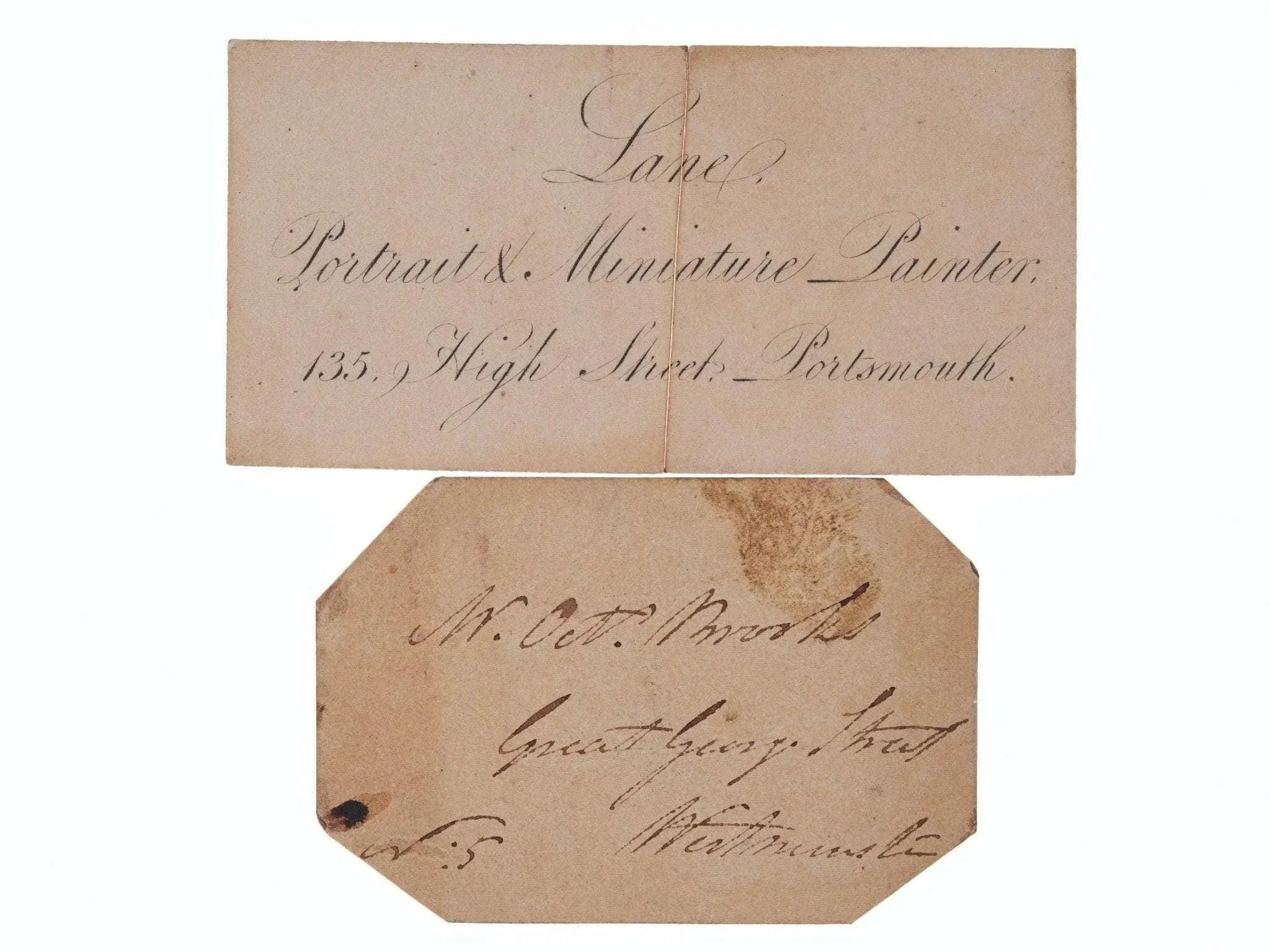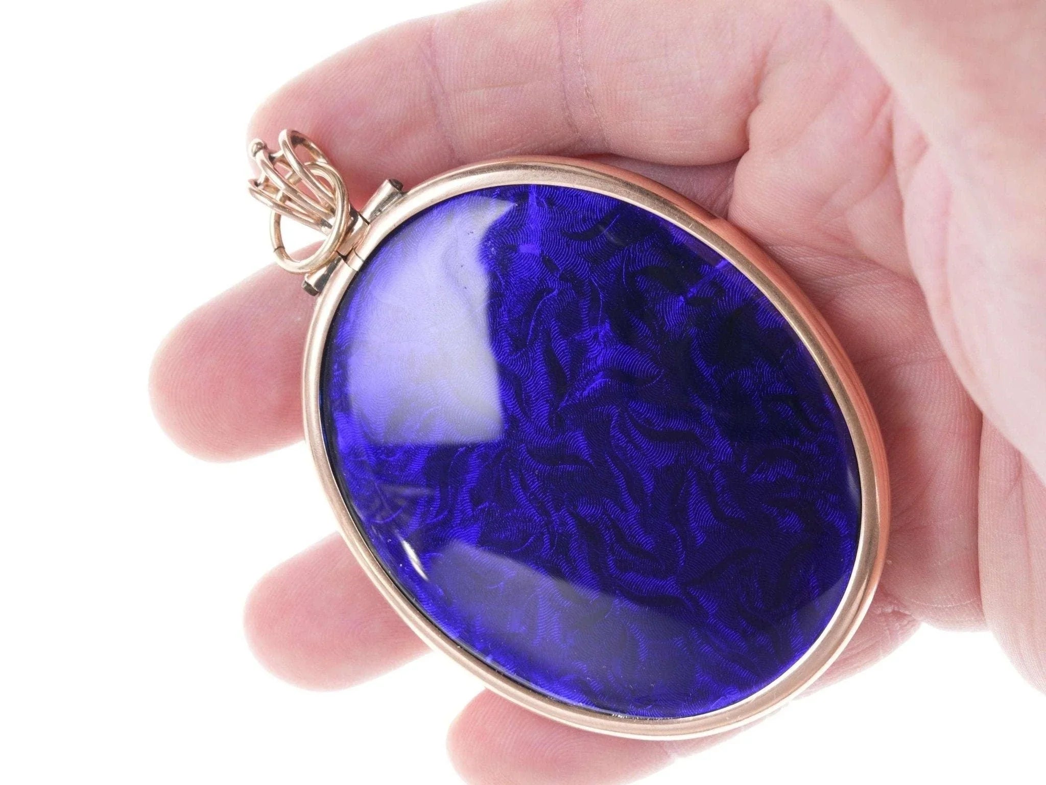 Large Georgian 14k Gold Mounted Portrait miniature pendant. Very fine portrait<br>miniature from the 18th to early 19th century mounted in a thick frame made of<br>solid 14+K gold. I disassembled this to get an accurate test without damaging<br>the exterior and it is solid 14k or more but less than 18k gold. Upon<br>disassembly I found three pieces of paper shown in the interior, one was the cut<br>in half, when put together it reads<br><br>Lane Portrait and Miniature Painter 135 High Street Portsmouth, then on the back<br>perhaps the reciept for this portrait.<br><br>Then the other paper reads this<br>Mr Oct. _______<br>Great George Street<br>Westminister<br><br>I was really surprised to find these clues though I don't have much time to<br>follow up on them they are interesting. I have put the pieces of paper back<br>inside where they have safely hid for the past 200 or so years. It is 3.5" tall<br>without the extra loose top ring x 2 3/8" wide 44.8 grams. The pictures were<br>taken after reassembly and careful cleaning of the 200+ year old gold frame.