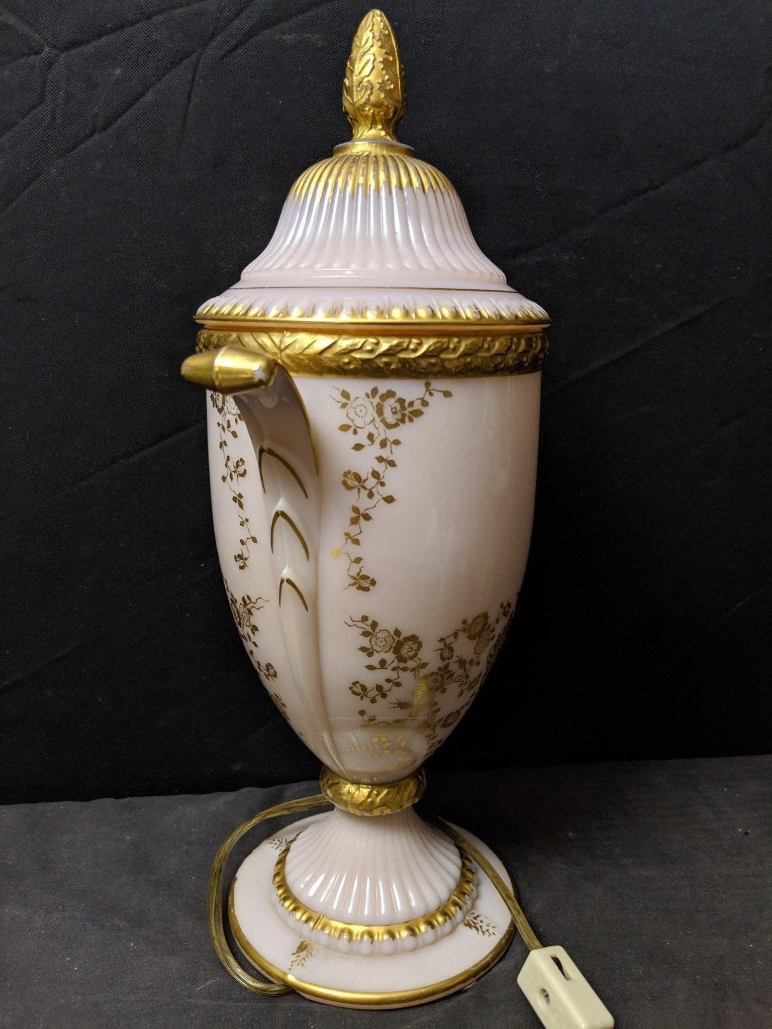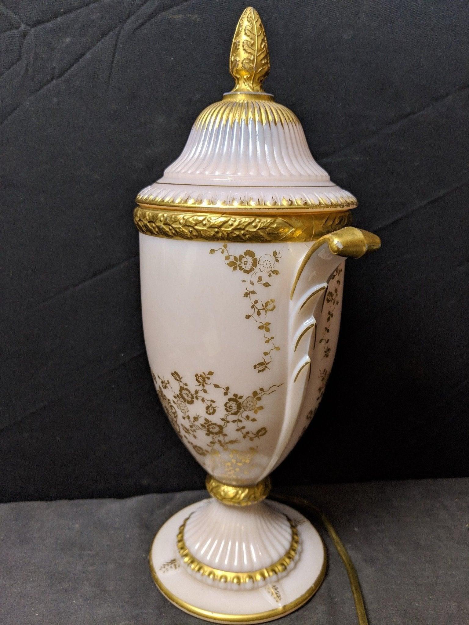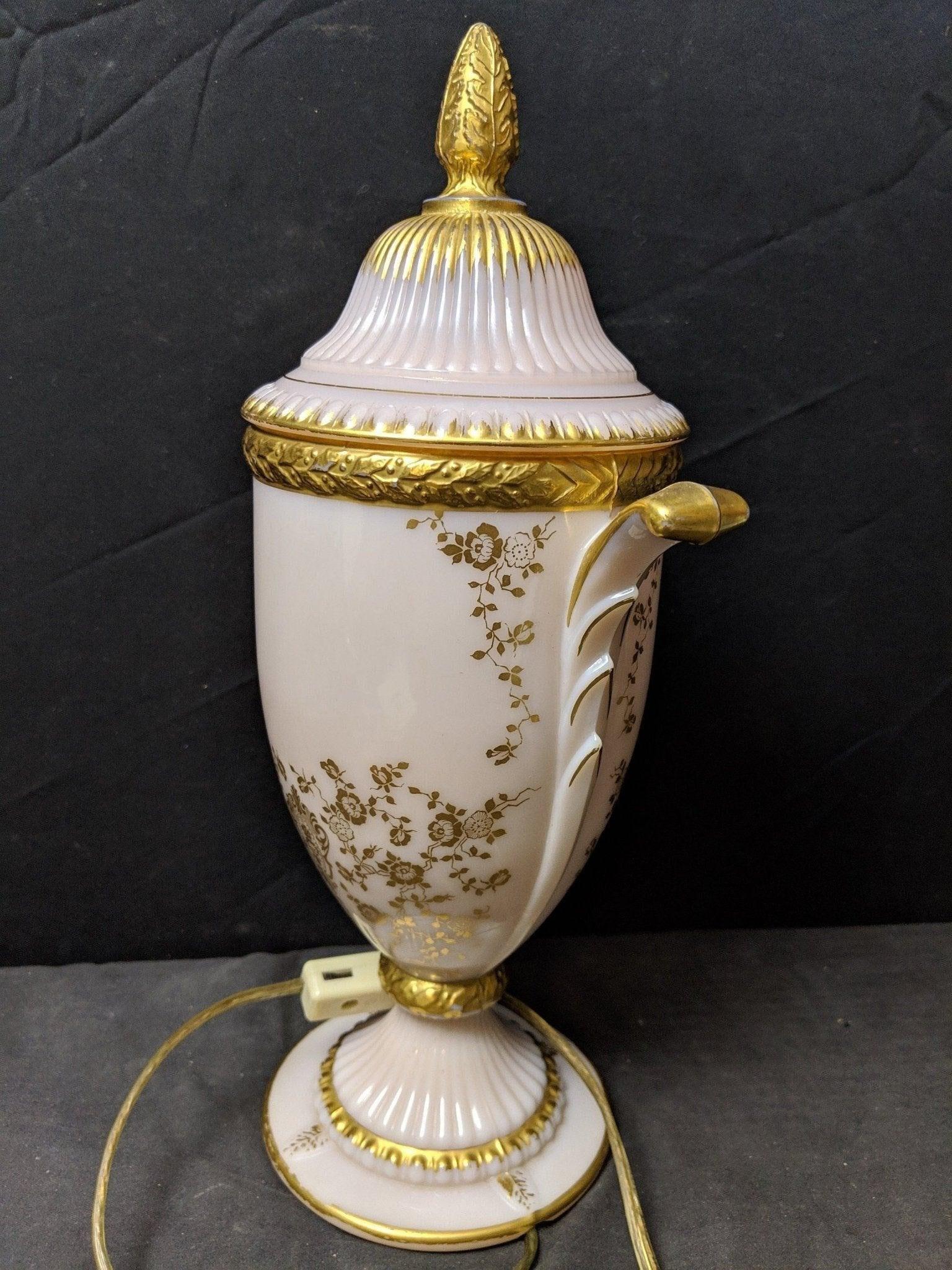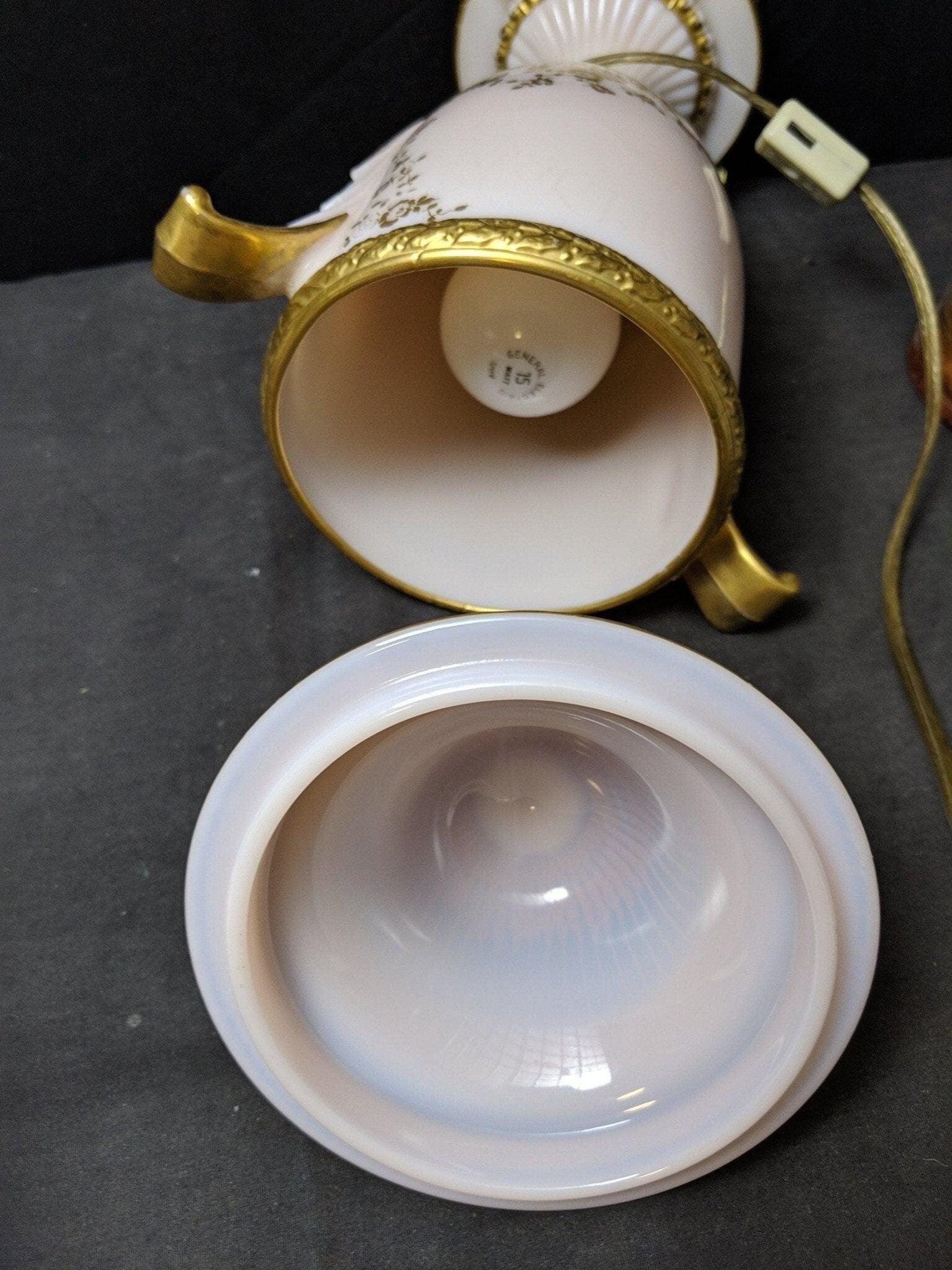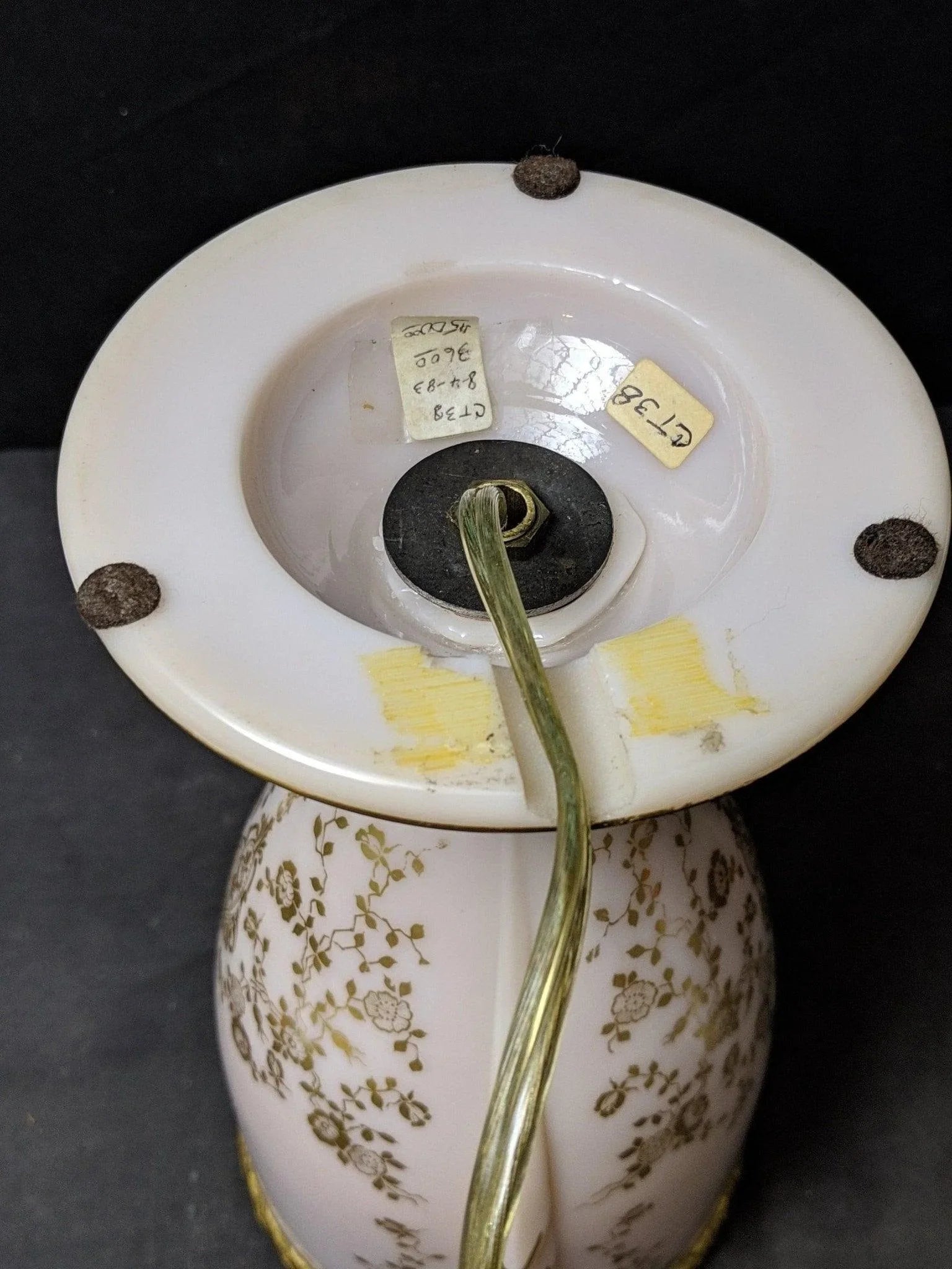 1930's Cambridge Crown Tuscan Rose Point Lamp. 13" tall, my camera is washing<br>out the color. It's the gorgeous pink that crown Tuscan is. No cracks, chips,<br>nicks, or restorations. Lamp works. It was an advertising piece that said<br>Cambridge rose point on both sides in gold. That was removed, if you look very<br>close you can see traces of it. The rest of the gold is clean with minimal wear<br>shown in pics. Very few of these exist, the previous piece paid $500 for this in<br>1983.