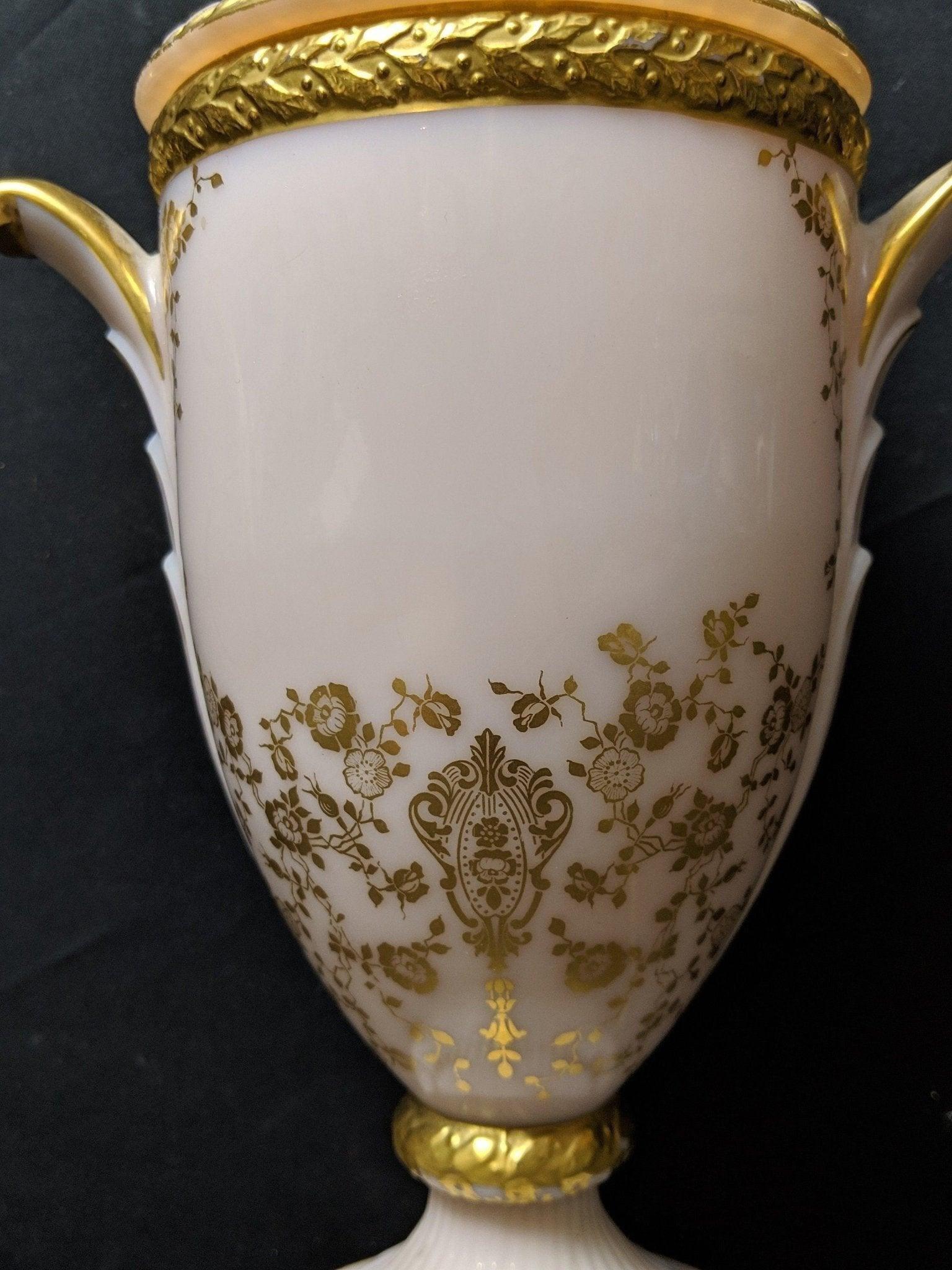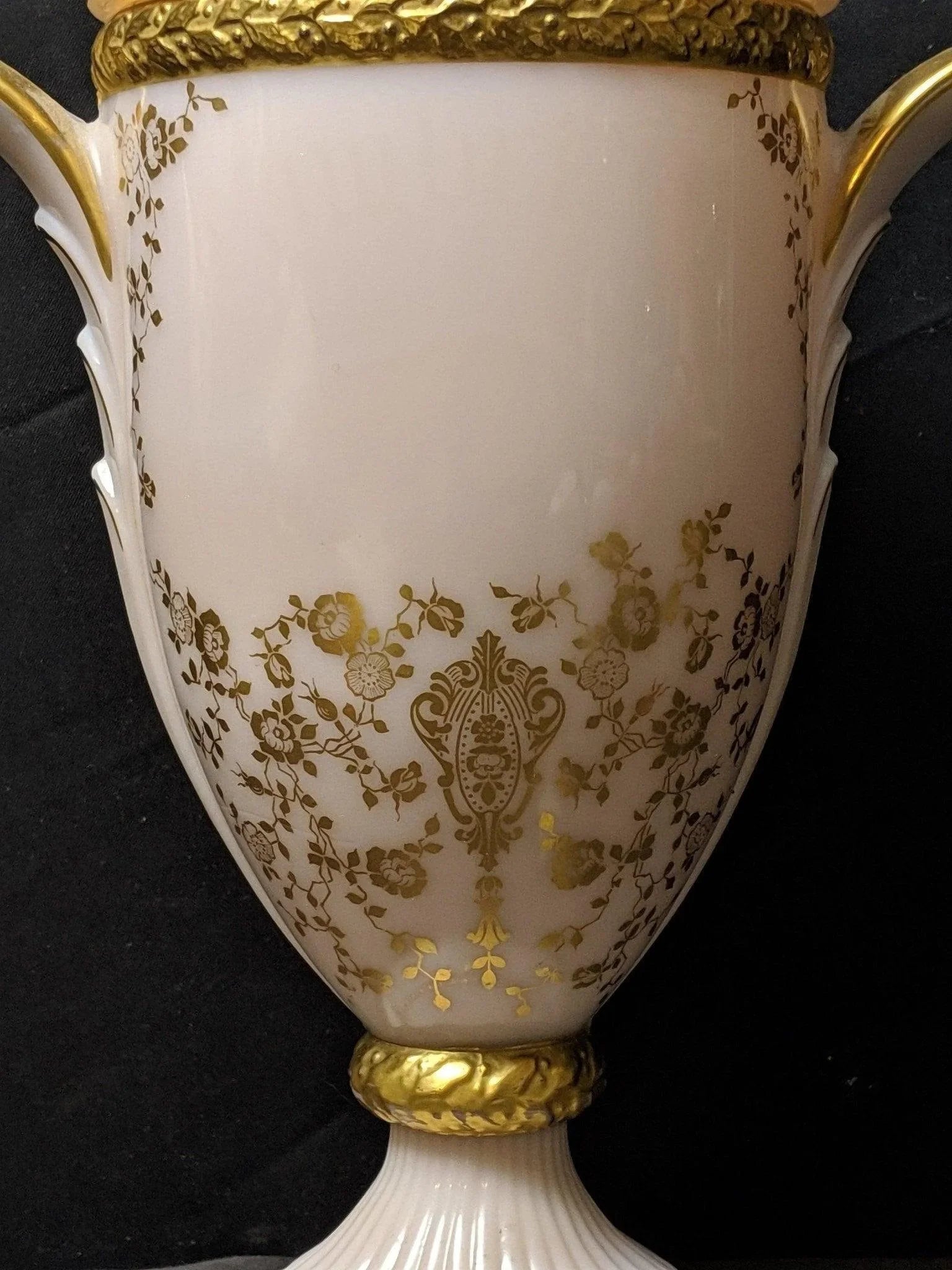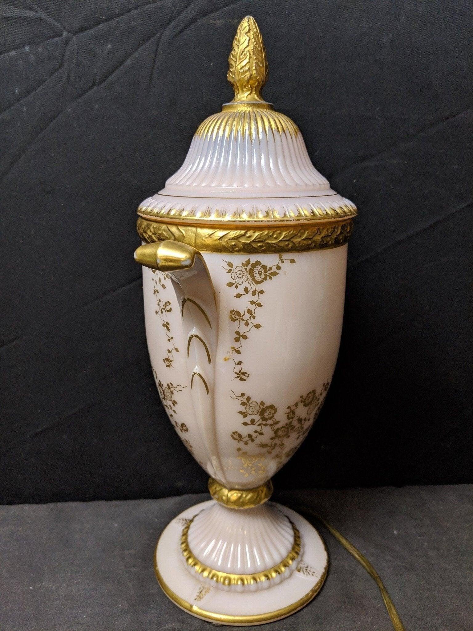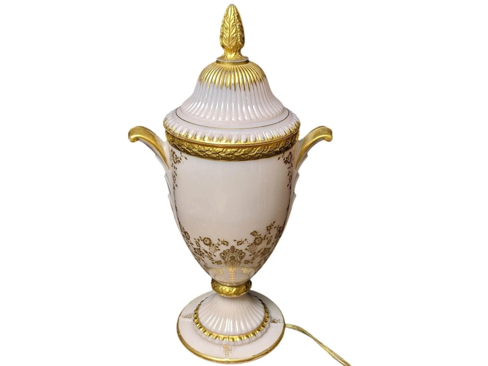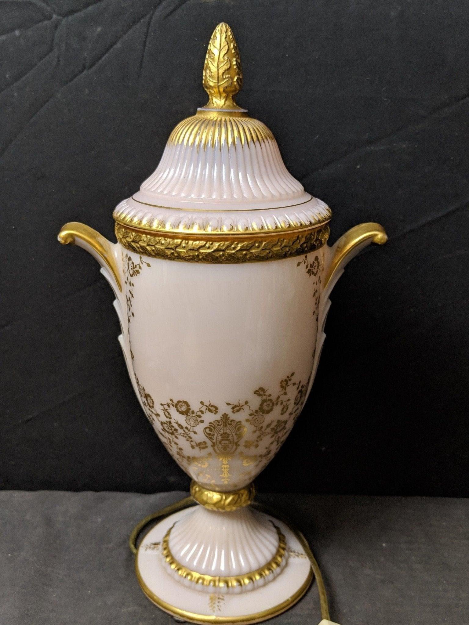1930's Cambridge Crown Tuscan Rose Point Lamp. 13" tall, my camera is washing<br>out the color. It's the gorgeous pink that crown Tuscan is. No cracks, chips,<br>nicks, or restorations. Lamp works. It was an advertising piece that said<br>Cambridge rose point on both sides in gold. That was removed, if you look very<br>close you can see traces of it. The rest of the gold is clean with minimal wear<br>shown in pics. Very few of these exist, the previous piece paid $500 for this in<br>1983.