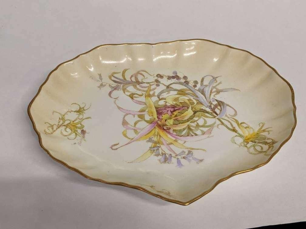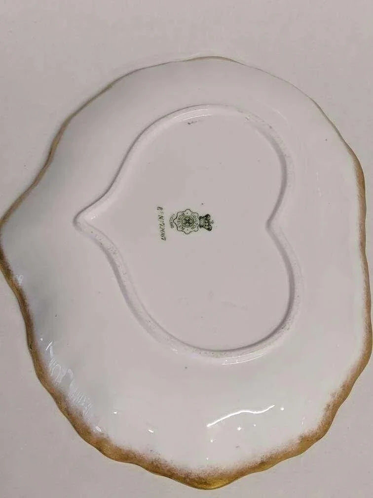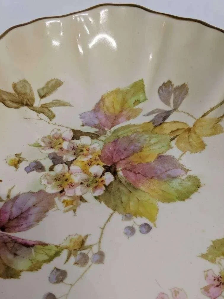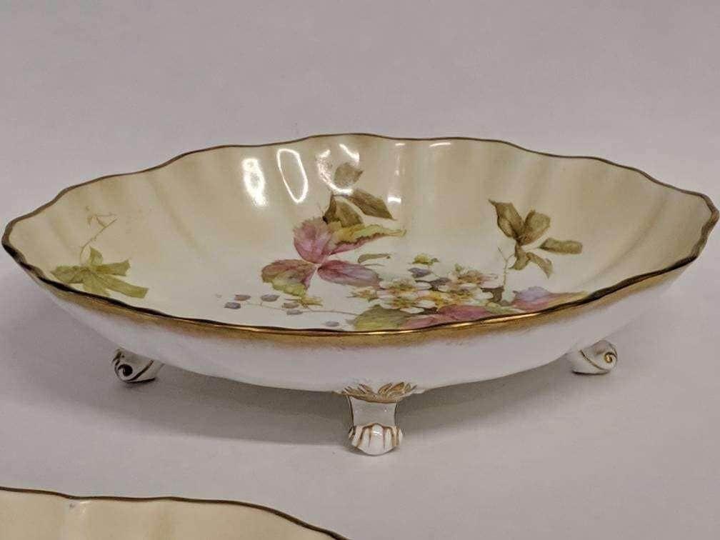 c1884 Royal Doulton Botanical Desert Serving pieces 2 pc one 10.5" oval footed<br>serving bowl, one 10 3/8" heart shaped dish. All pieces in near mint appearing<br>unused condition with no cracks, chips, scratches, crazing, or wear to gilding.<br>They're hand painted over transfer. I have additional pieces in this pattern I'm<br>listing separately.<br>Tw46
