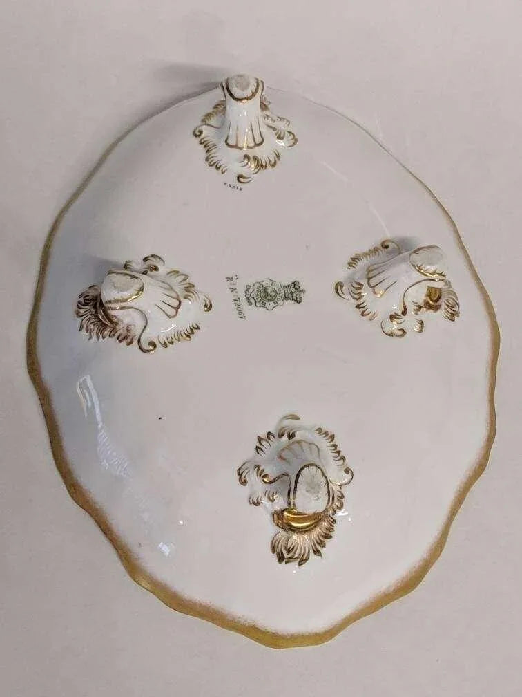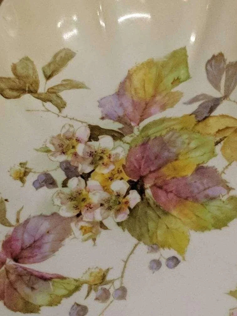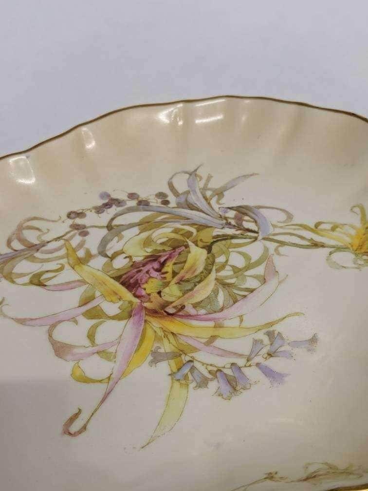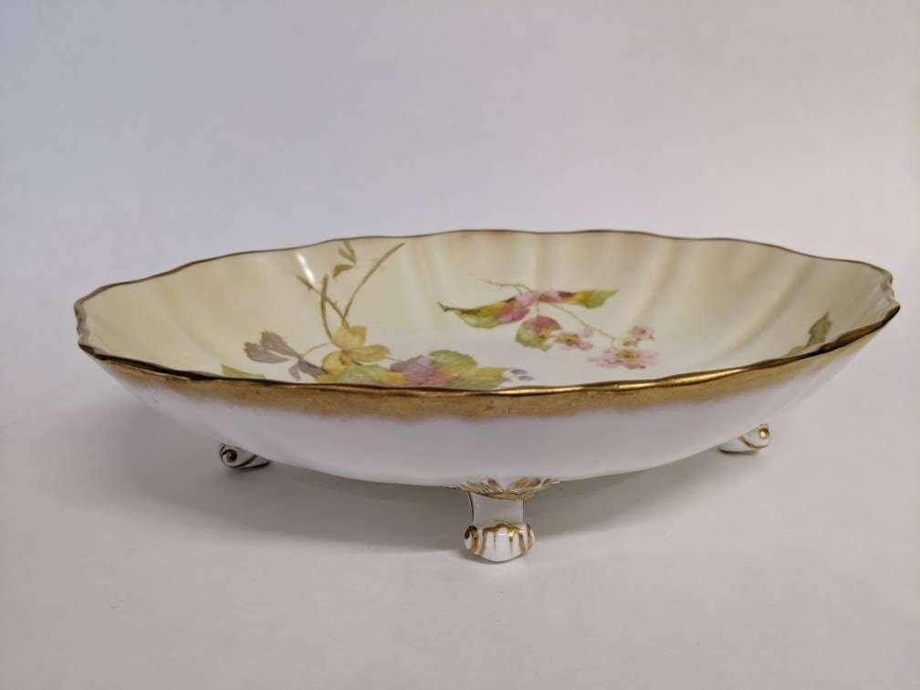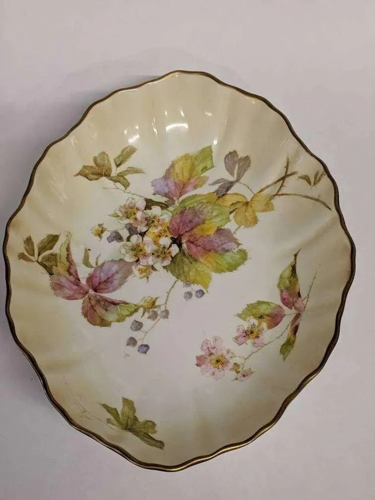 c1884 Royal Doulton Botanical Desert Serving pieces 2 pc one 10.5" oval footed<br>serving bowl, one 10 3/8" heart shaped dish. All pieces in near mint appearing<br>unused condition with no cracks, chips, scratches, crazing, or wear to gilding.<br>They're hand painted over transfer. I have additional pieces in this pattern I'm<br>listing separately.<br>Tw46