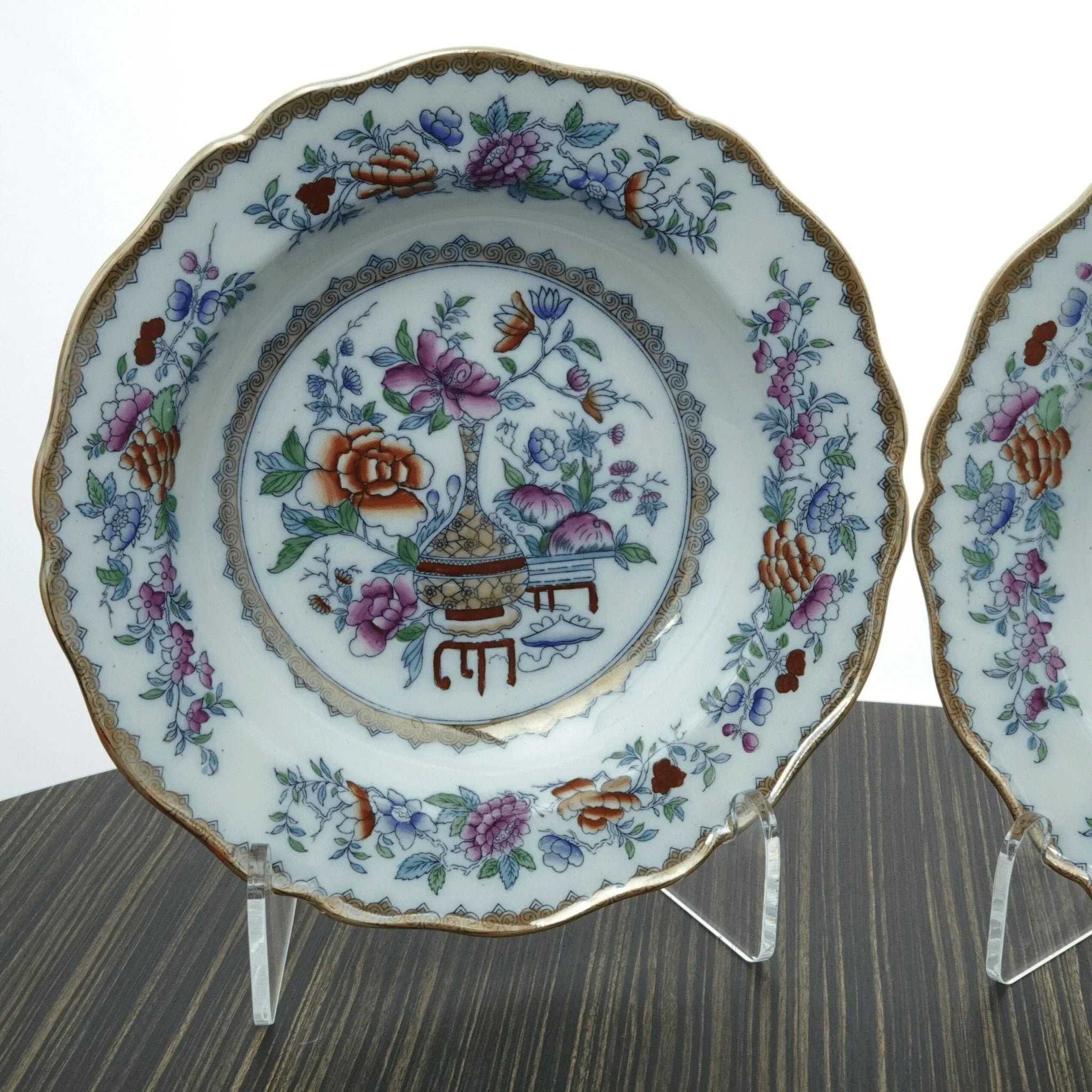 c1910 Royal Doulton Bottle Japan Chinoisiere Imari British Imari Rim Soup Bowls (2) with Polychrome Decoration Peach Lustre Accents. I'm listing other pieces of this scarce and attractive pattern separately. 9 5/8" wide each. They have no cracks, chips, restorations, crazing, or stains. I'm selling multiple lots of these and they are all in the same condition. They have perfect lustre, really don't appear used. I believe they've been in a cabinet for 100 years. Selling two in each lot with multiple lots available. tw12