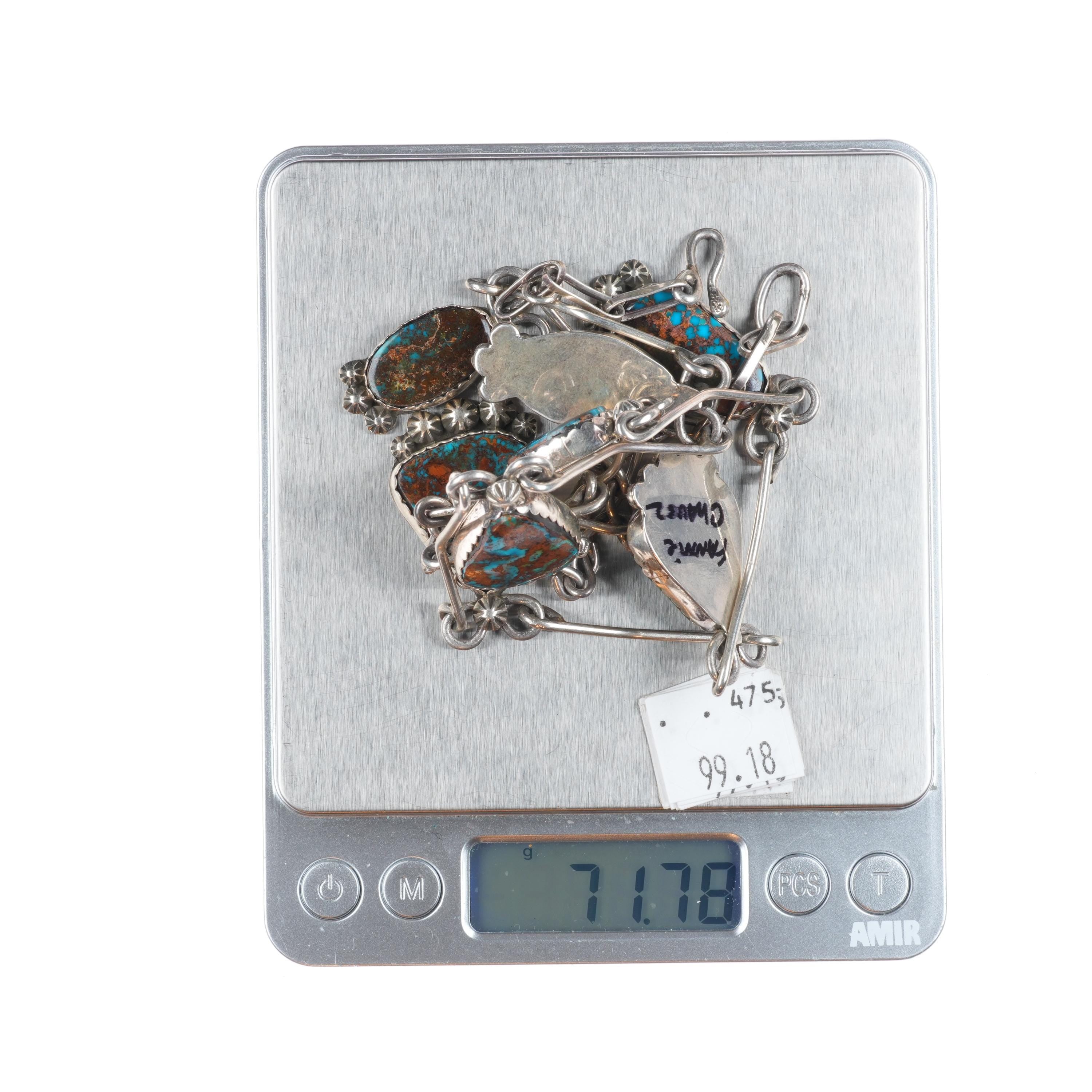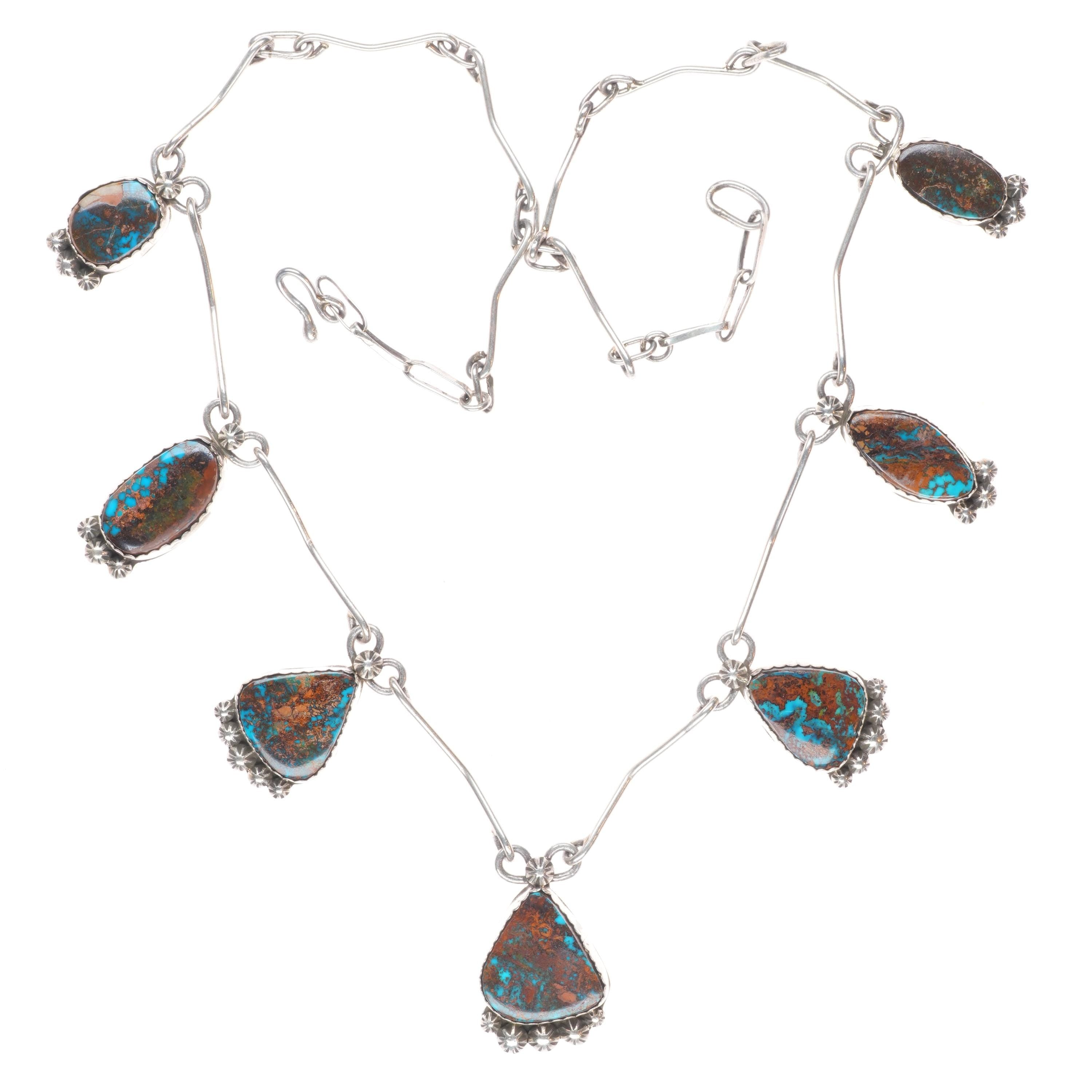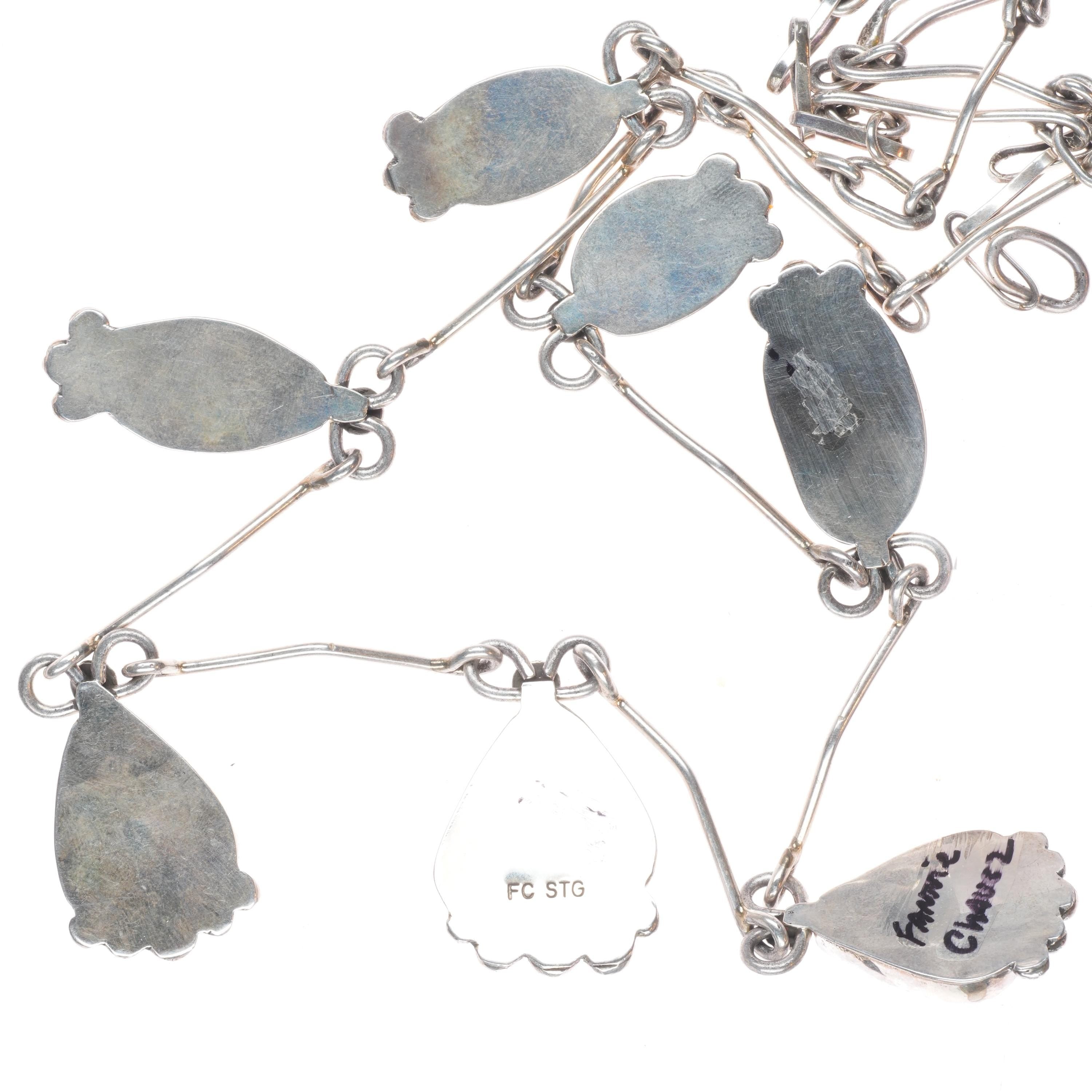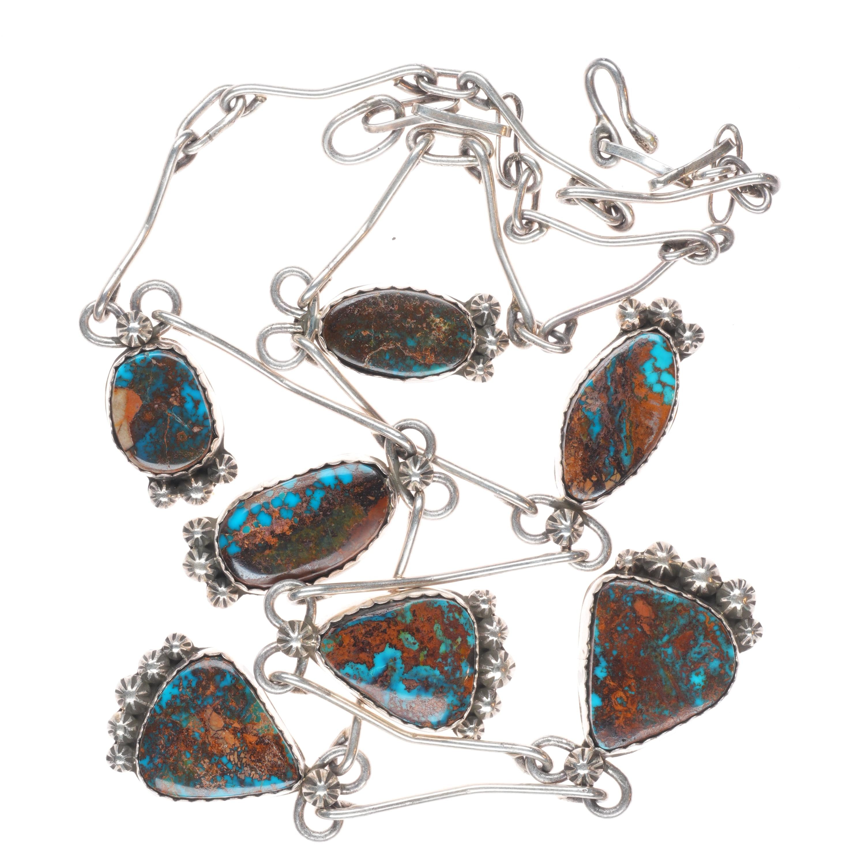 Fannie Chavez Navajo sterling silver high grade turquoise modernist necklace. Circa last quarter of the 20th century, tested and guaranteed solid sterling silver. No apparent issues. 27" long necklace, other measurements in pictures.