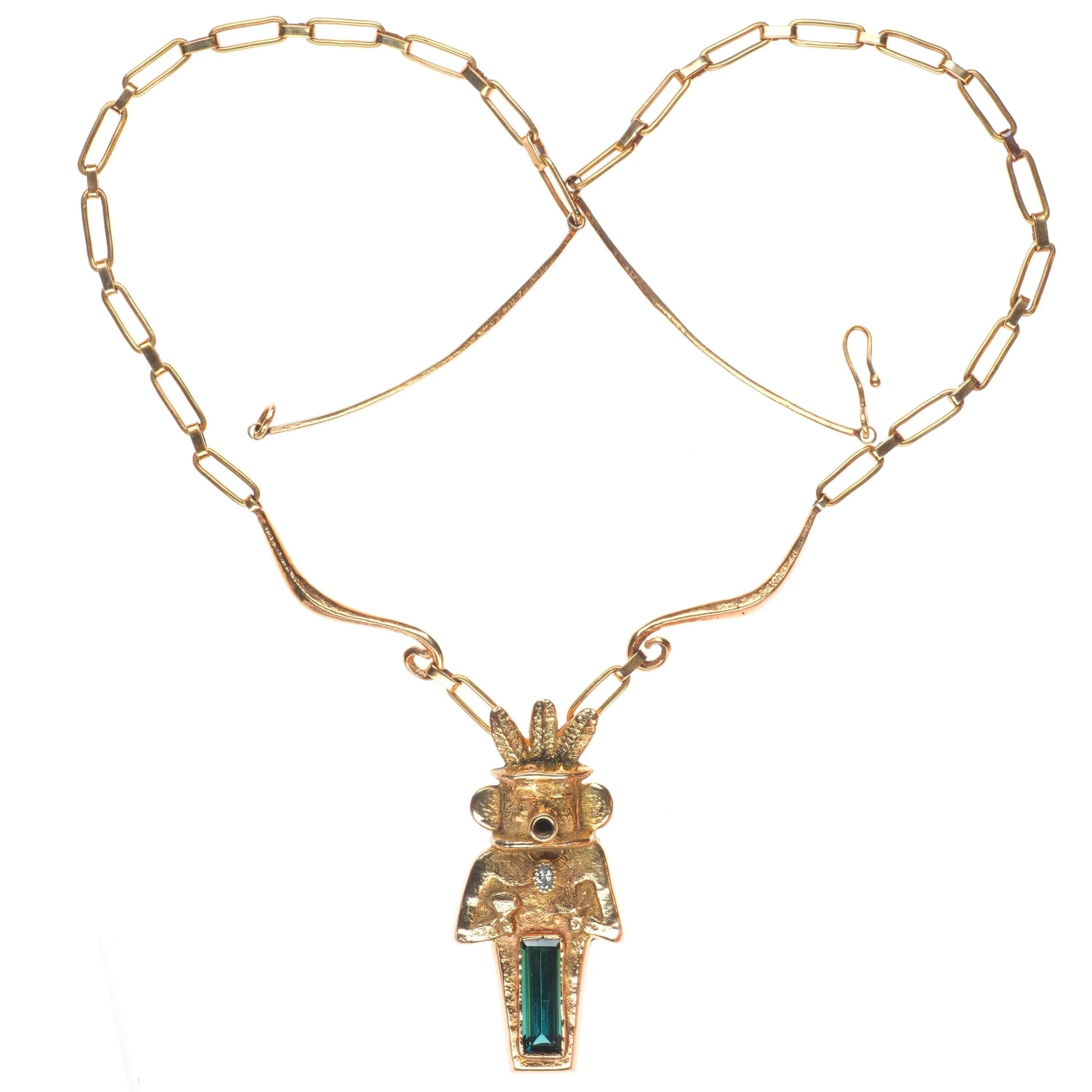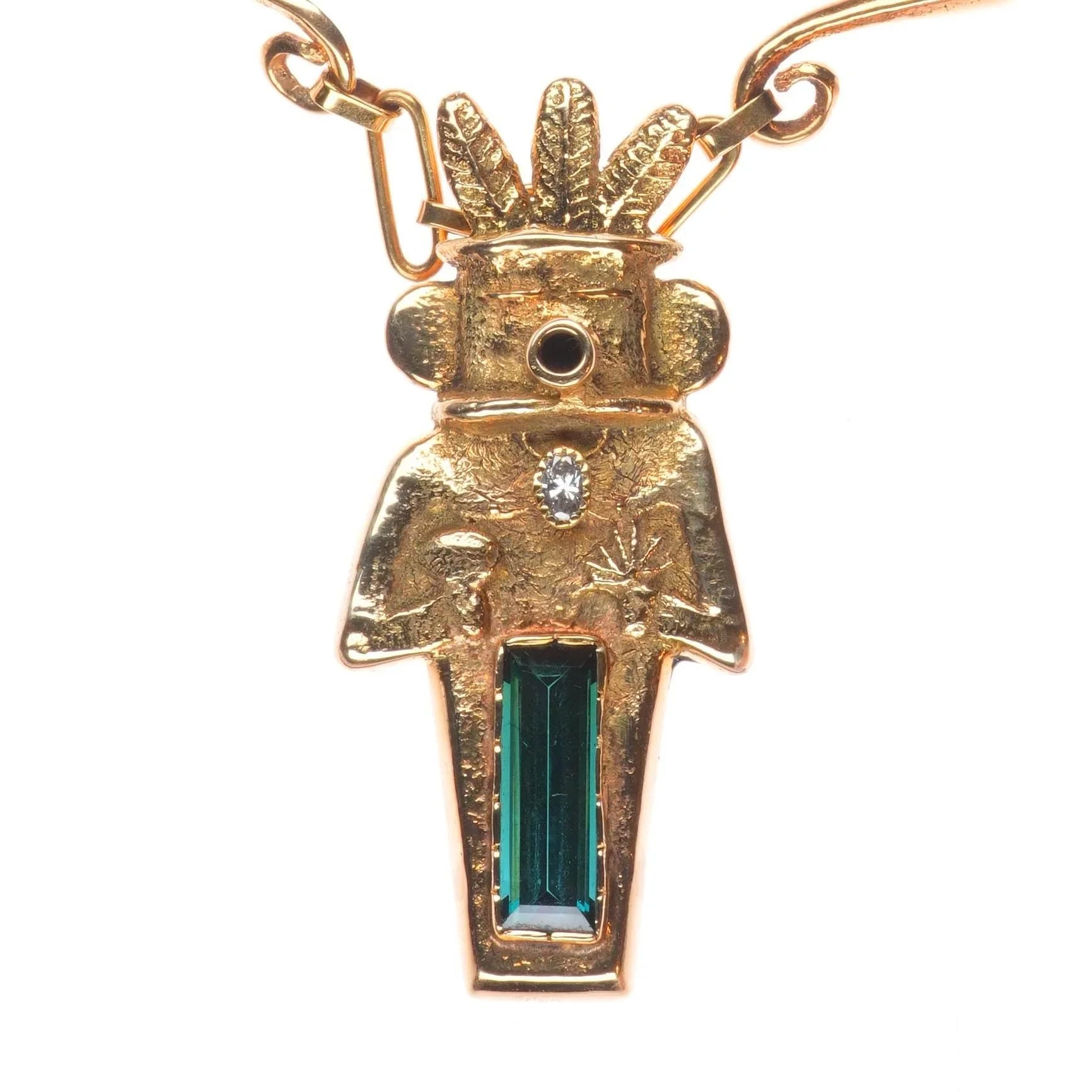 Michael Horse-Yaqui Indicolite Tourmaline, diamond, 14k gold kachina pendant necklace. Circa last quarter of the 20th century with no apparent issues. Tested and guaranteed solid 14k gold with weight and measurements in pictures. Natural Indicolite Tourmaline, natural diamond. 20" long necklace