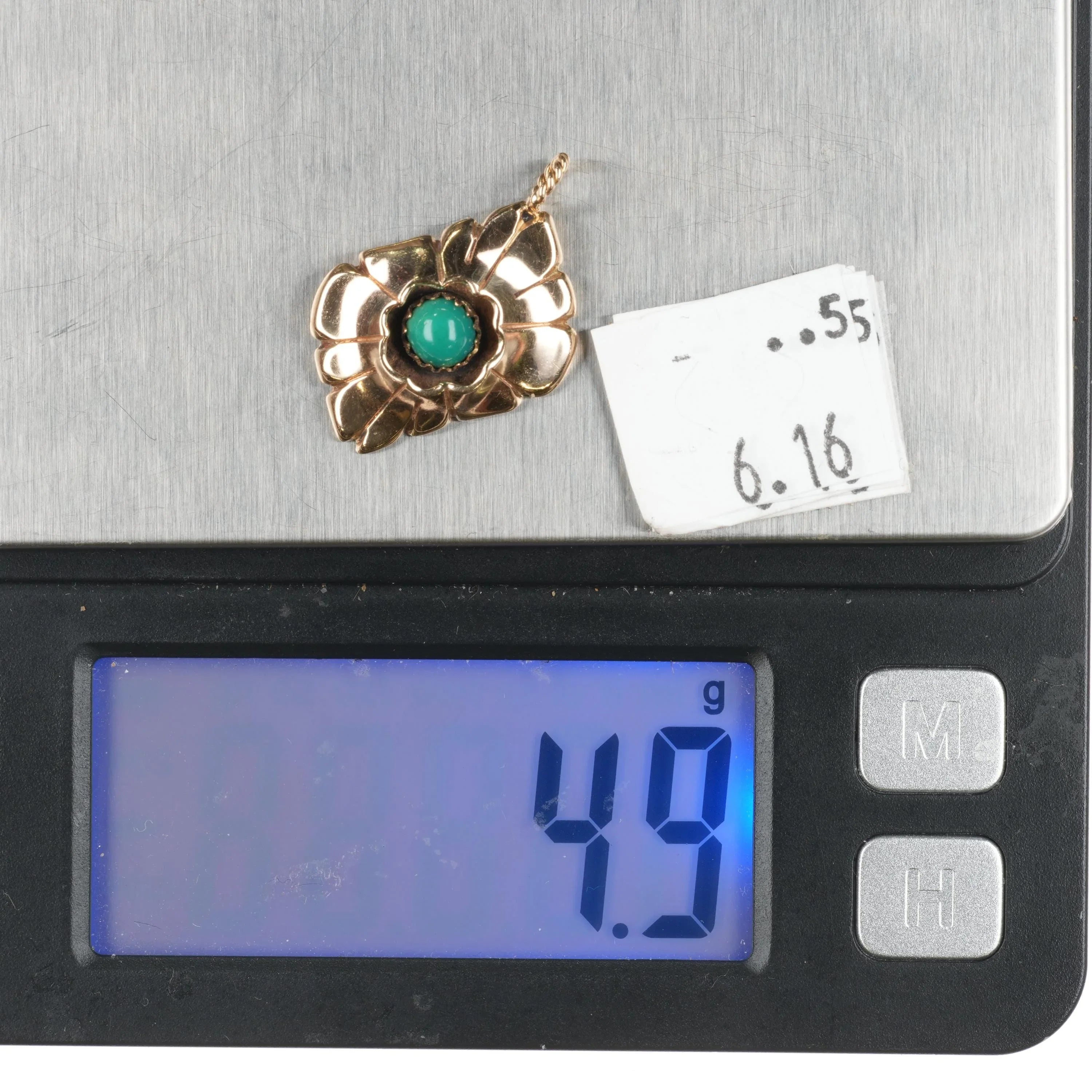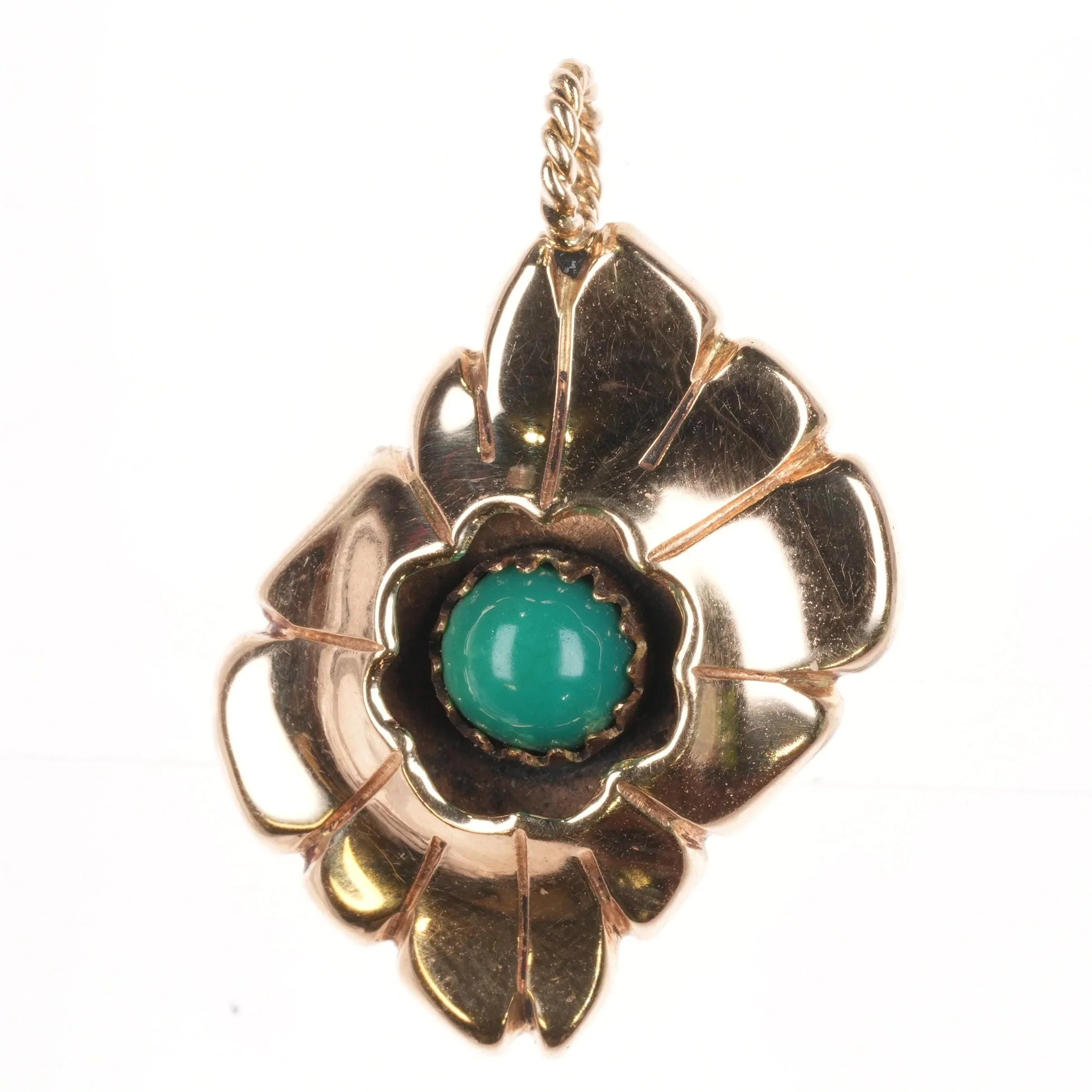 NSS Southwestern 14k Gold pendant with green turquoise hand chiseled/ rope bail. Tested and guaranteed solid 14k gold with weight and measurements in the pictures. No detectable issues. Any markings detected will be shown in the pictures. Great piece from large collection of Native American jewelry purchased in the last quarter of the 20th century and never worn for the most part.